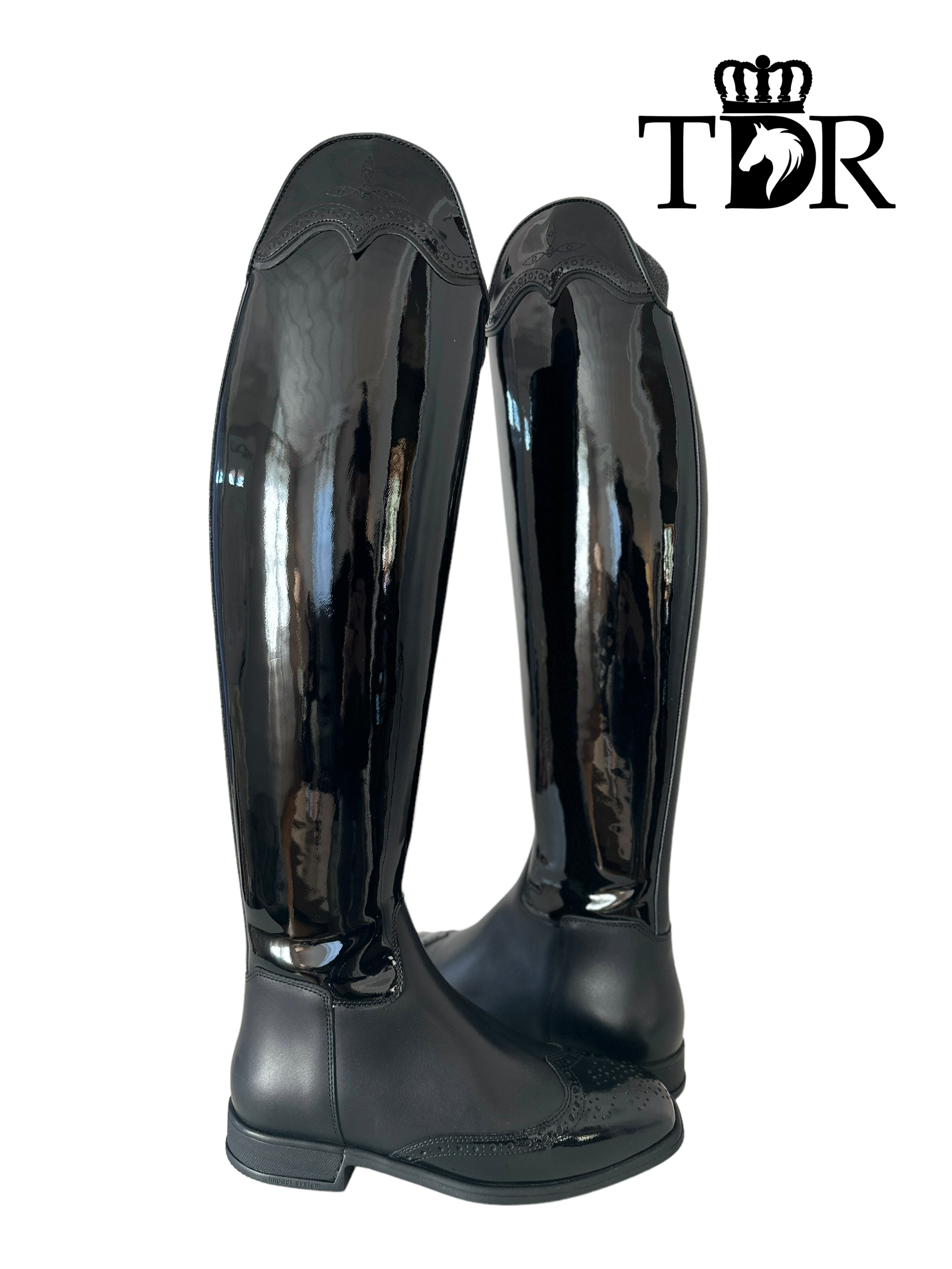 Description: Matte black base, patent black shaft, toe cap, and top style, brogue detailing on top and toecap, comfort grip sole, grip patch on the inner shaft, ELASTIC PANEL allows for stretch and give of about 1.5 cm.