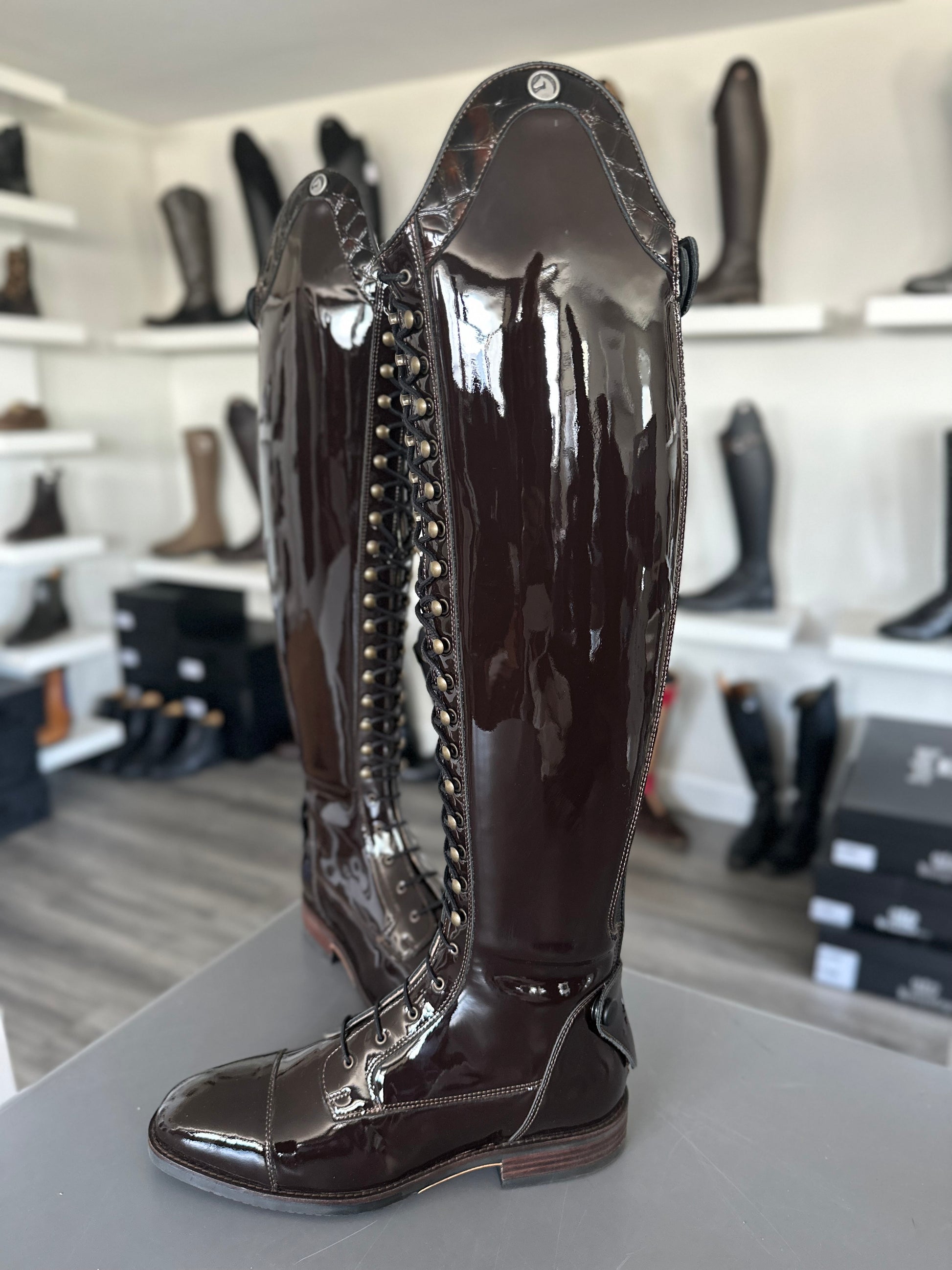 Description: Brown Patent (P6) boot with brown croc (P22) top accent (T3) and toecap (B1), extra grip inside panel. Elastic panel allows for stretch and give of about 1.5 cm.