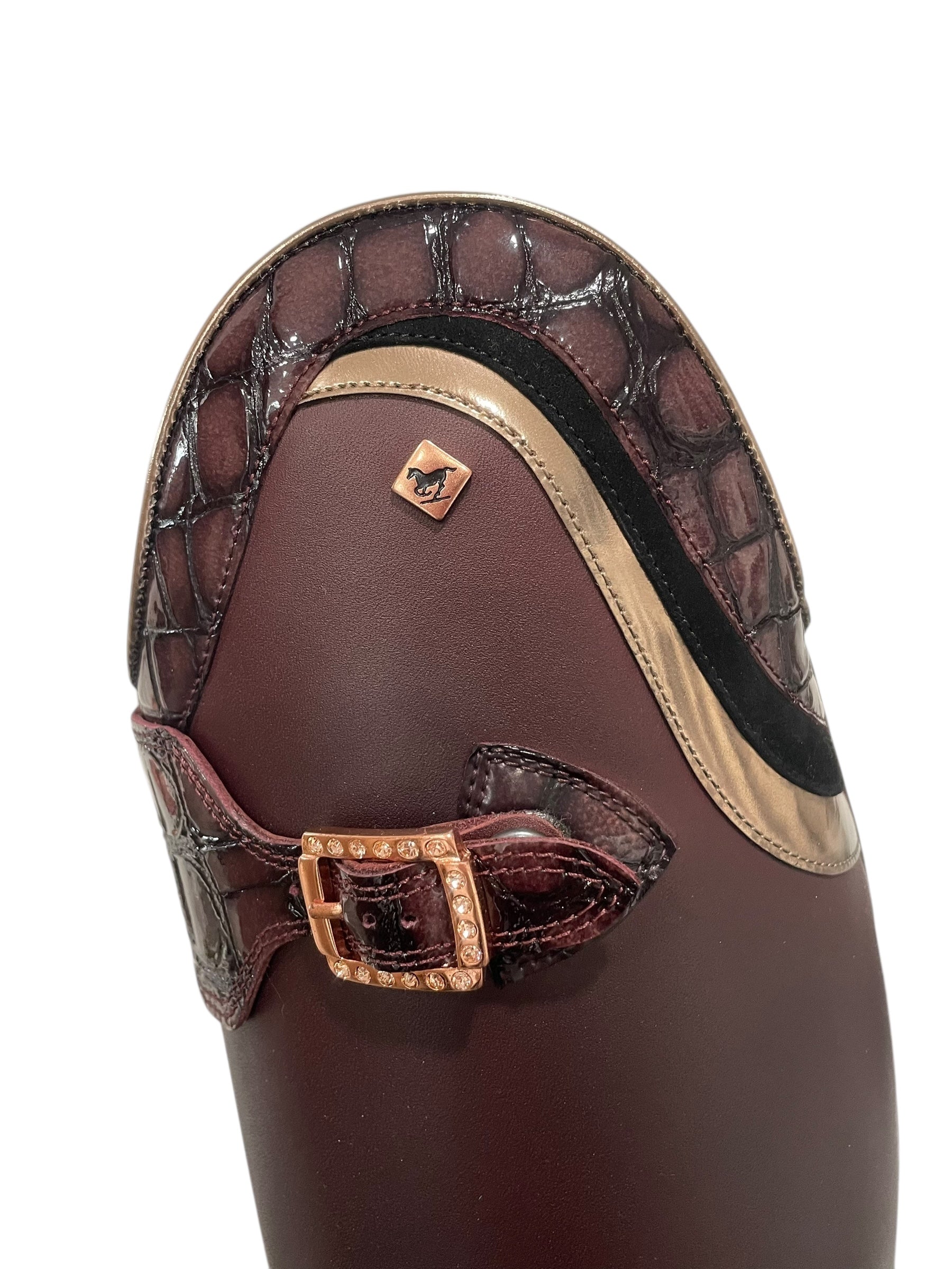 Description: Vintage mosto base, G42 top in lucidi porpora, camoscio black, and specchio rame, top piping in specchio rame, top strap in lucidi porpora, rose gold buckle with Swarovski crystals, rose gold logo, and brown outsole.