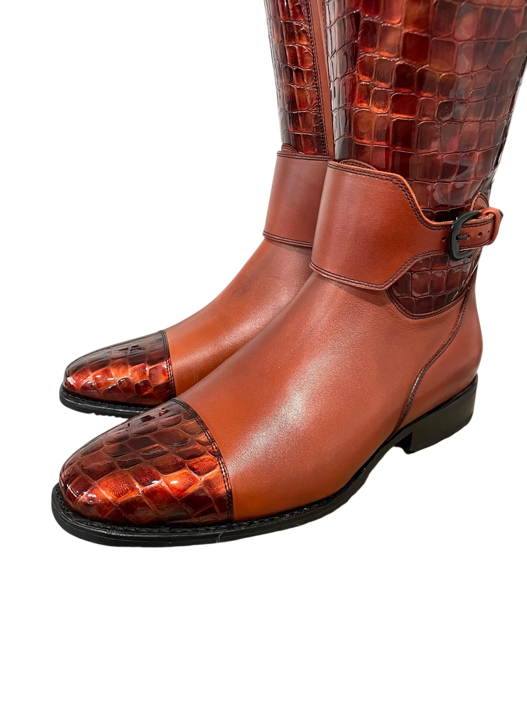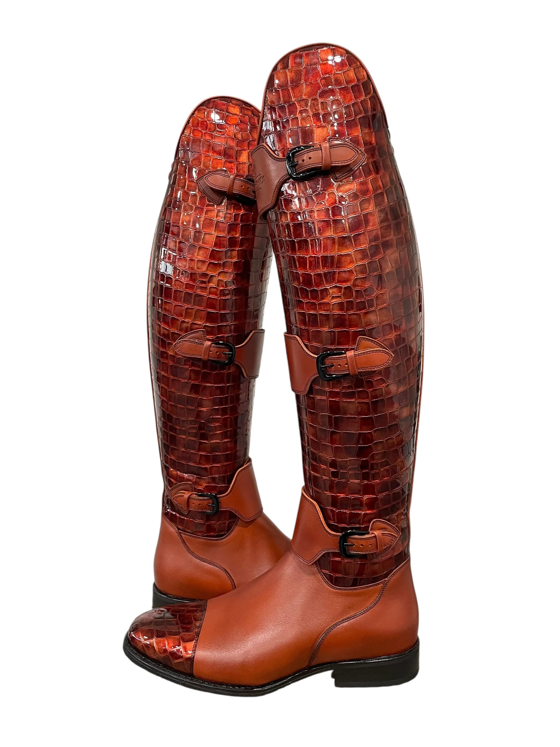 Description: Vintage WRAT cotto base, lucidi wine leg and toecap, 3 straps in vintage WRAT cotto with black buckles, black stitching, and black outsole.