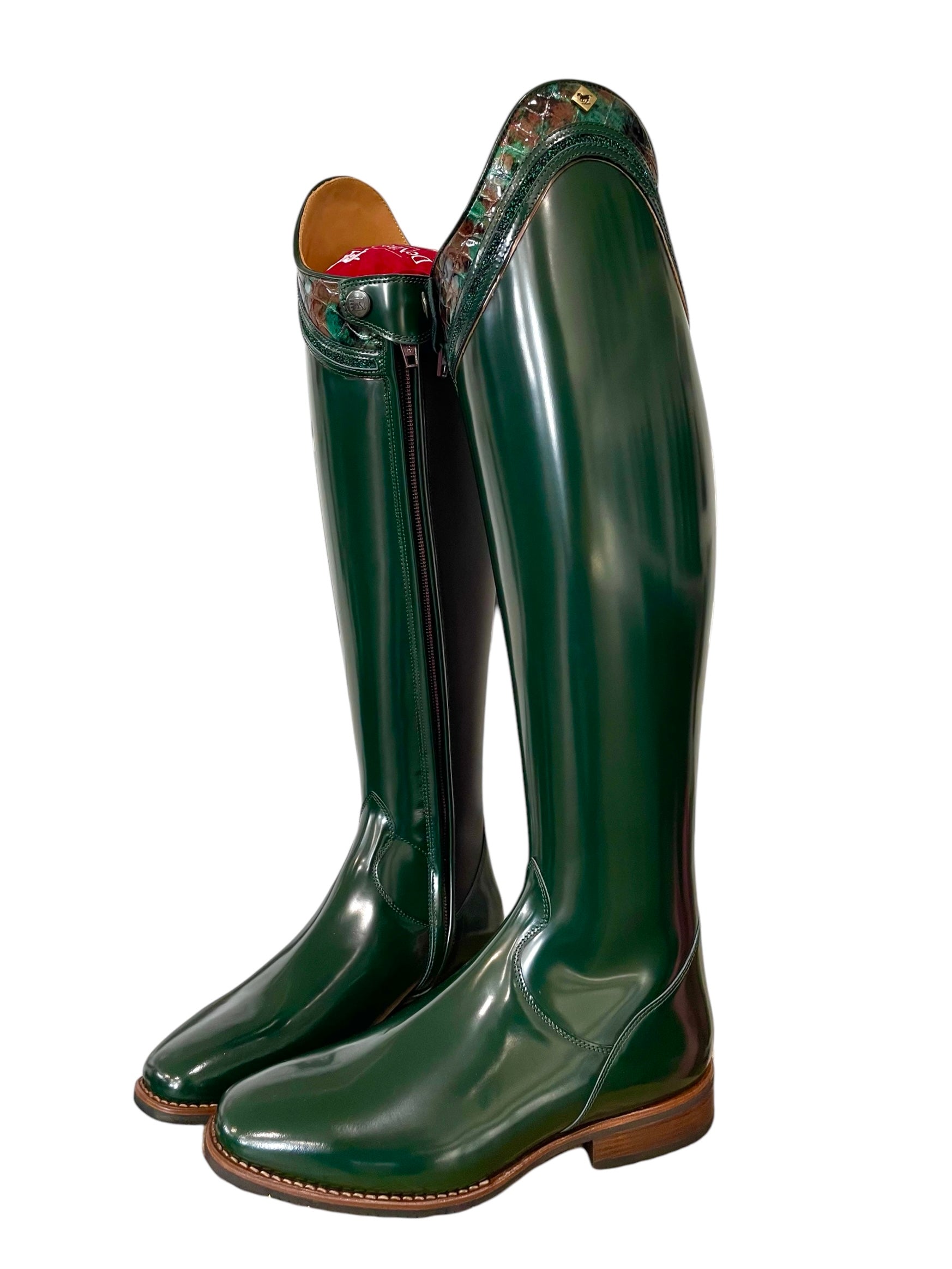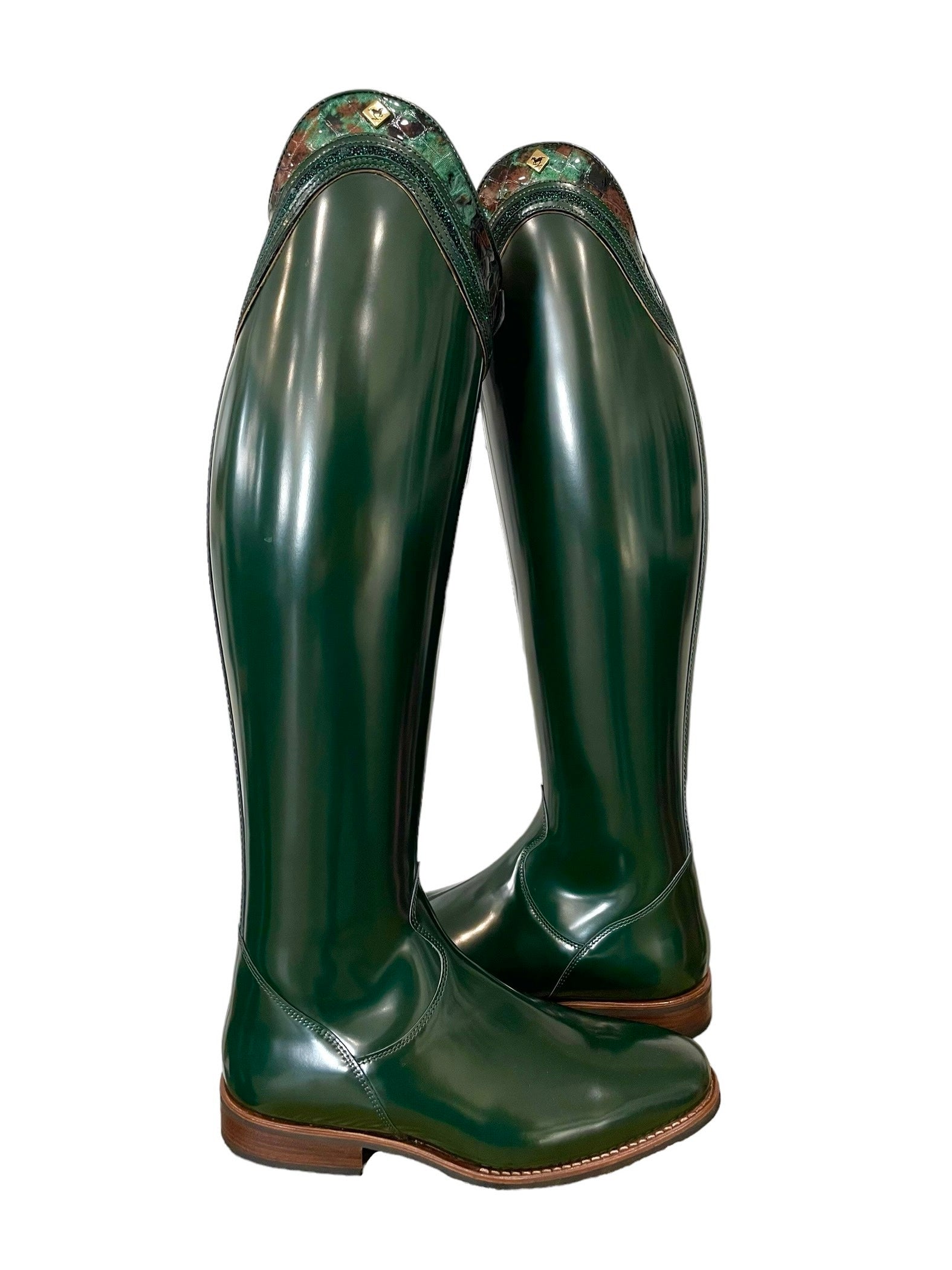 Description: The DeNiro Tiziano model is similar to the DeNiro Bellini model, but with a lower outer bow. It features a tapered ankle, a hard (reinforced) outside, a soft inside, and an inside front zipper with a zip protector. This Tiziano has a brushed green base, an inside shaft in WRAT caffe, G38 sofia top in lucidi sfumato verde and stardust electric green with specchio bronzo piping across the bottom, and brown sole.