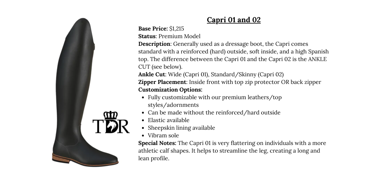 Due to the highly individualized nature of this product, custom configurations are INELIGIBLE for exchange/return/refunds. We guarantee that all boots will be produced to the measurements entered into the configuration tool. We cannot guarantee, however, that those measurements will fit YOU! For a guaranteed fit, please be sure to schedule an in-person or virtual fitting :)