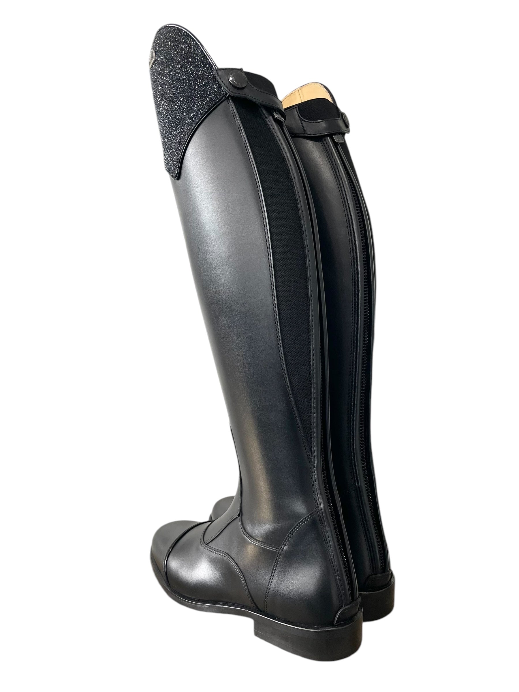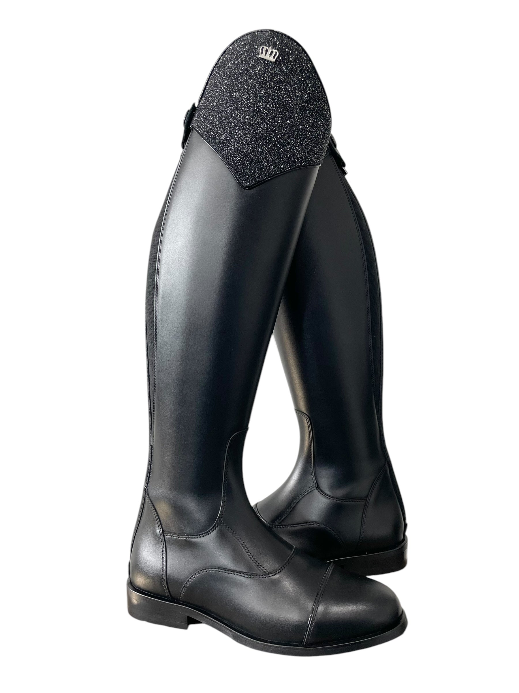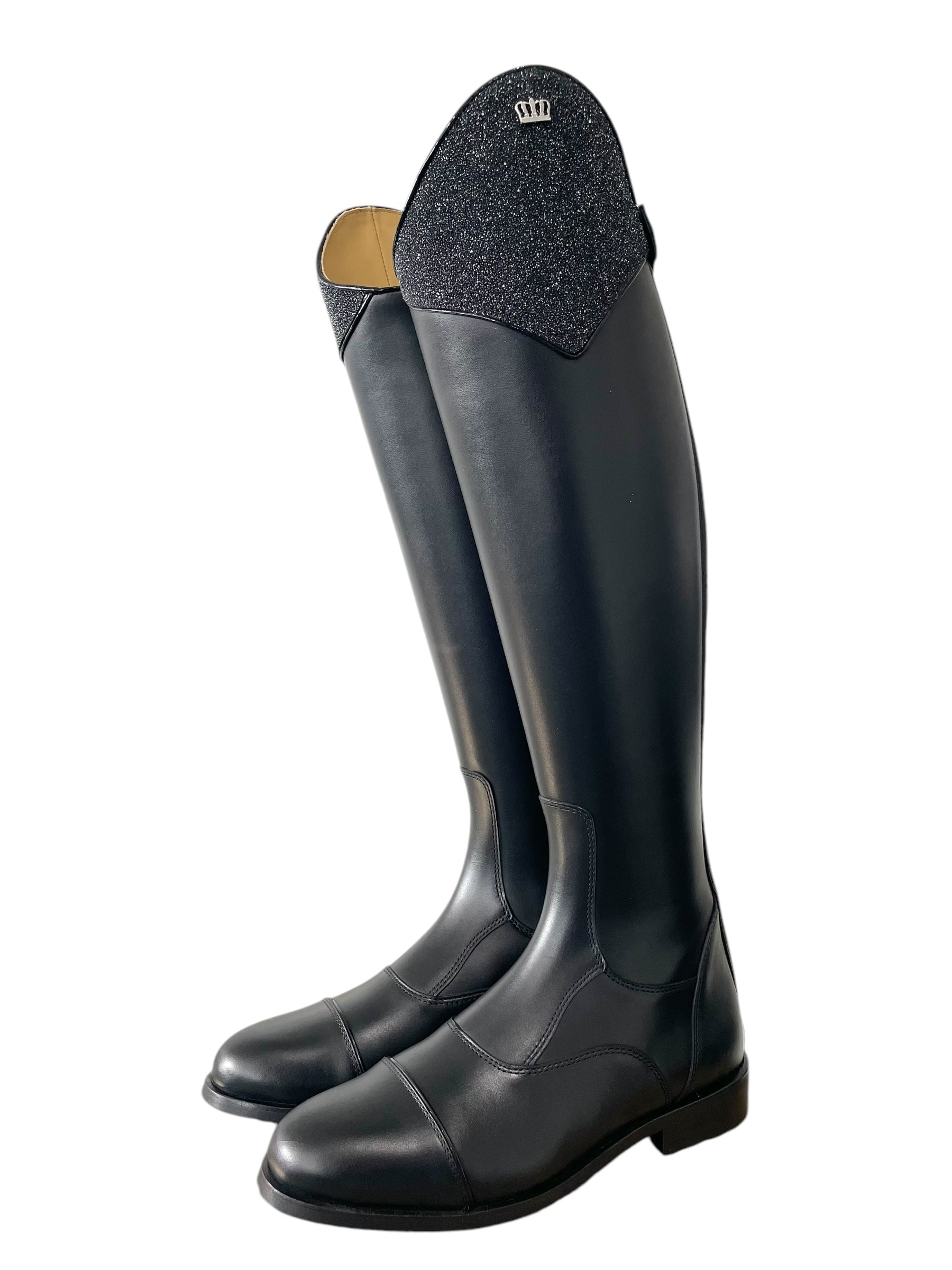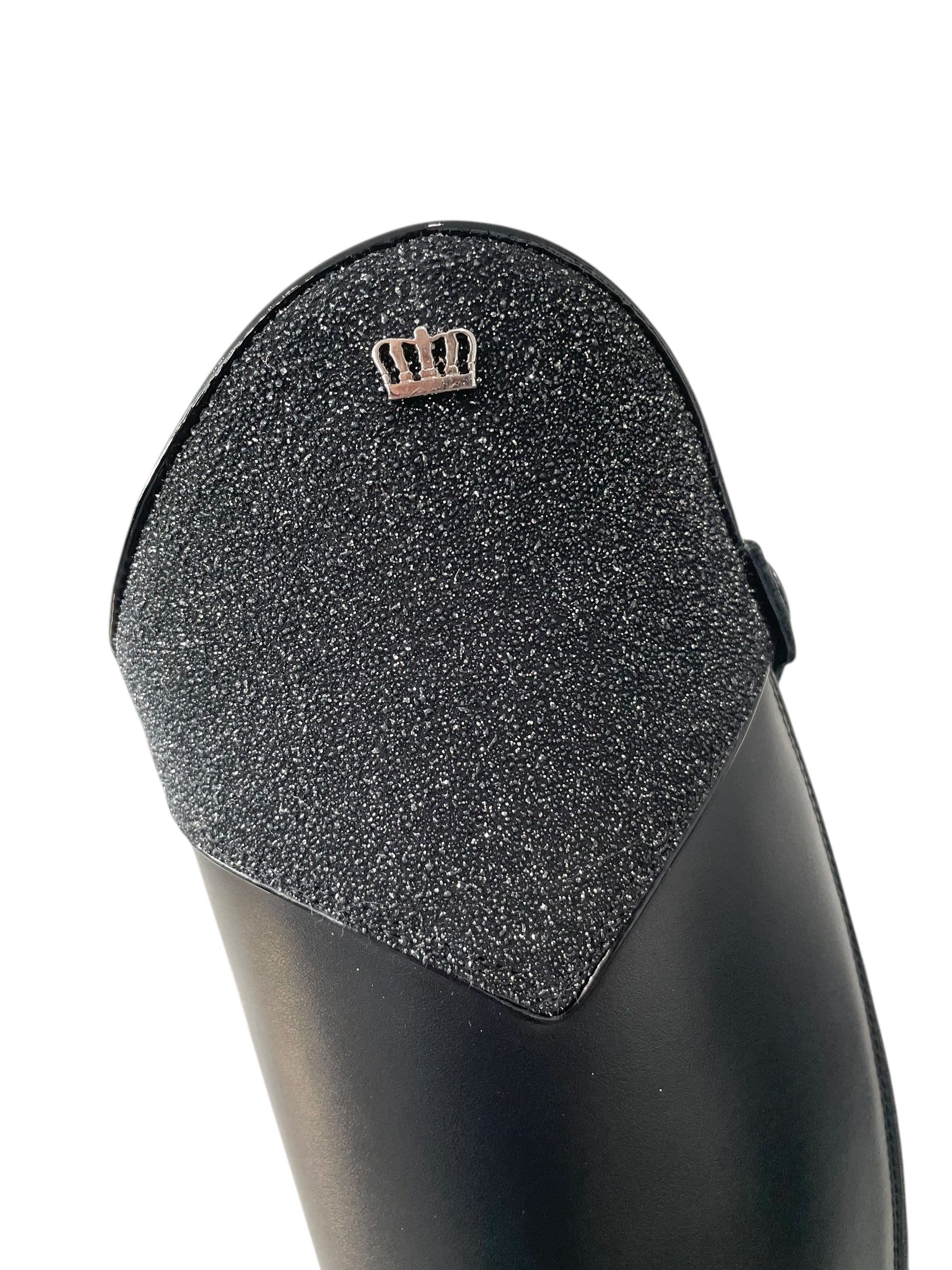 Description: Aspen black base, Anna top in stardust black, roma black top and toecap piping, black elastic, silver logo crown, and black outsole.