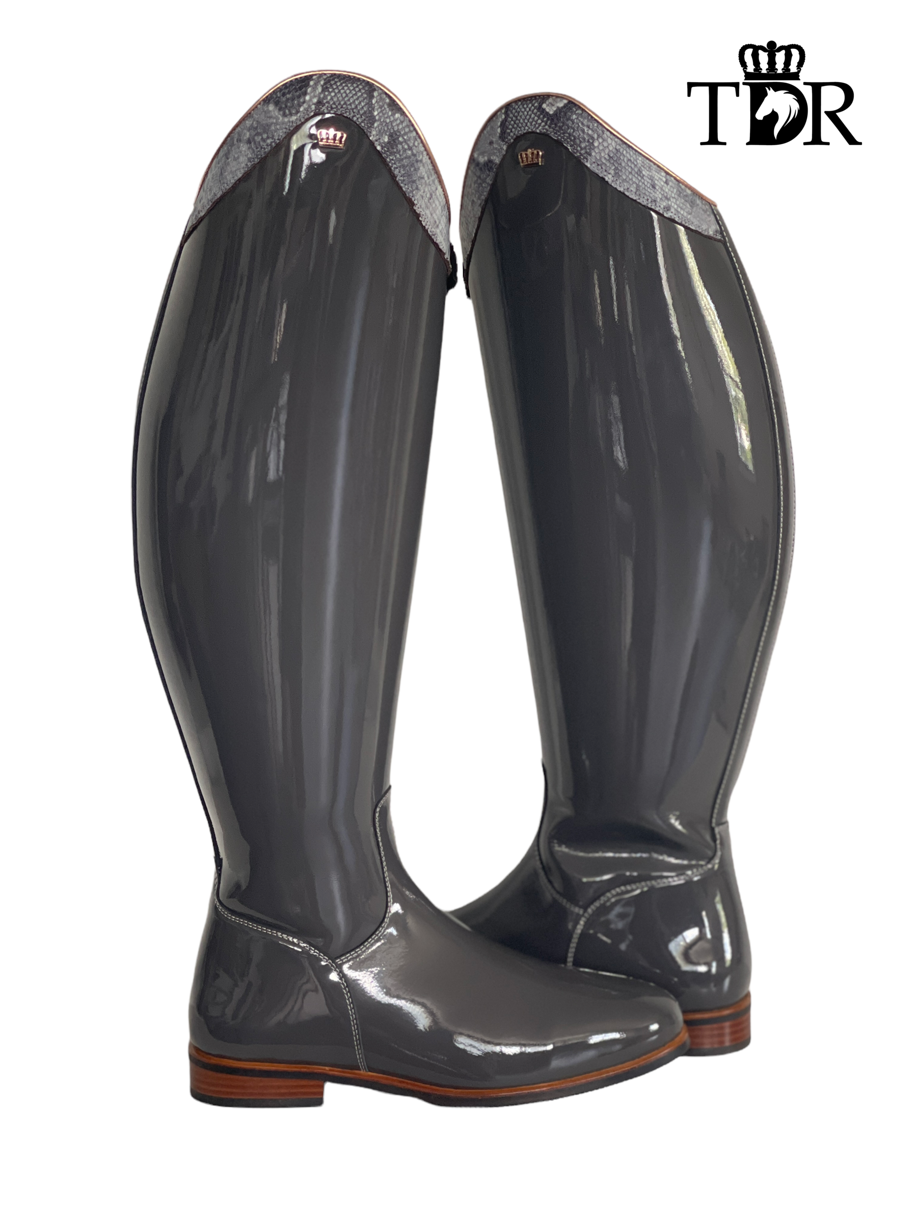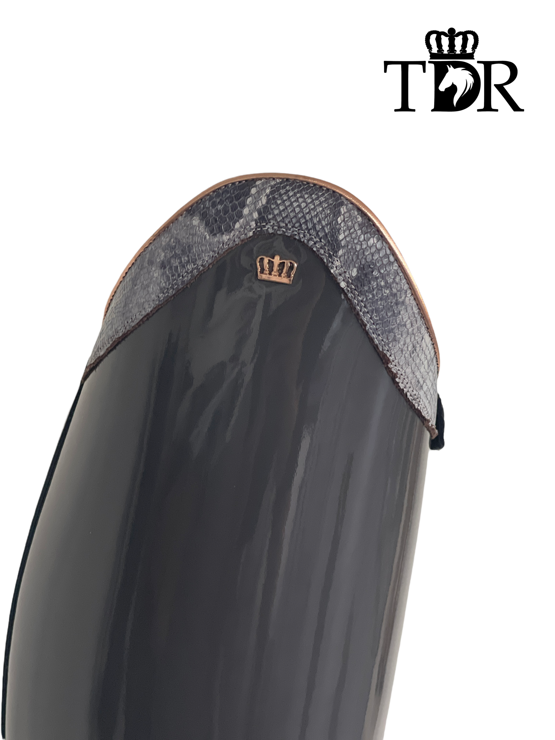 This Kingsley Capri is a Roma (patent) grey boot with shiny rose top piping, rose colored stitching, a rose gold logo crown, and brown heelbase. The inside shaft of the boot is nature black. The Jenny top features Python barbados, as does the top zipper protector. This boot is lined with taupe-colored sheepskin.
