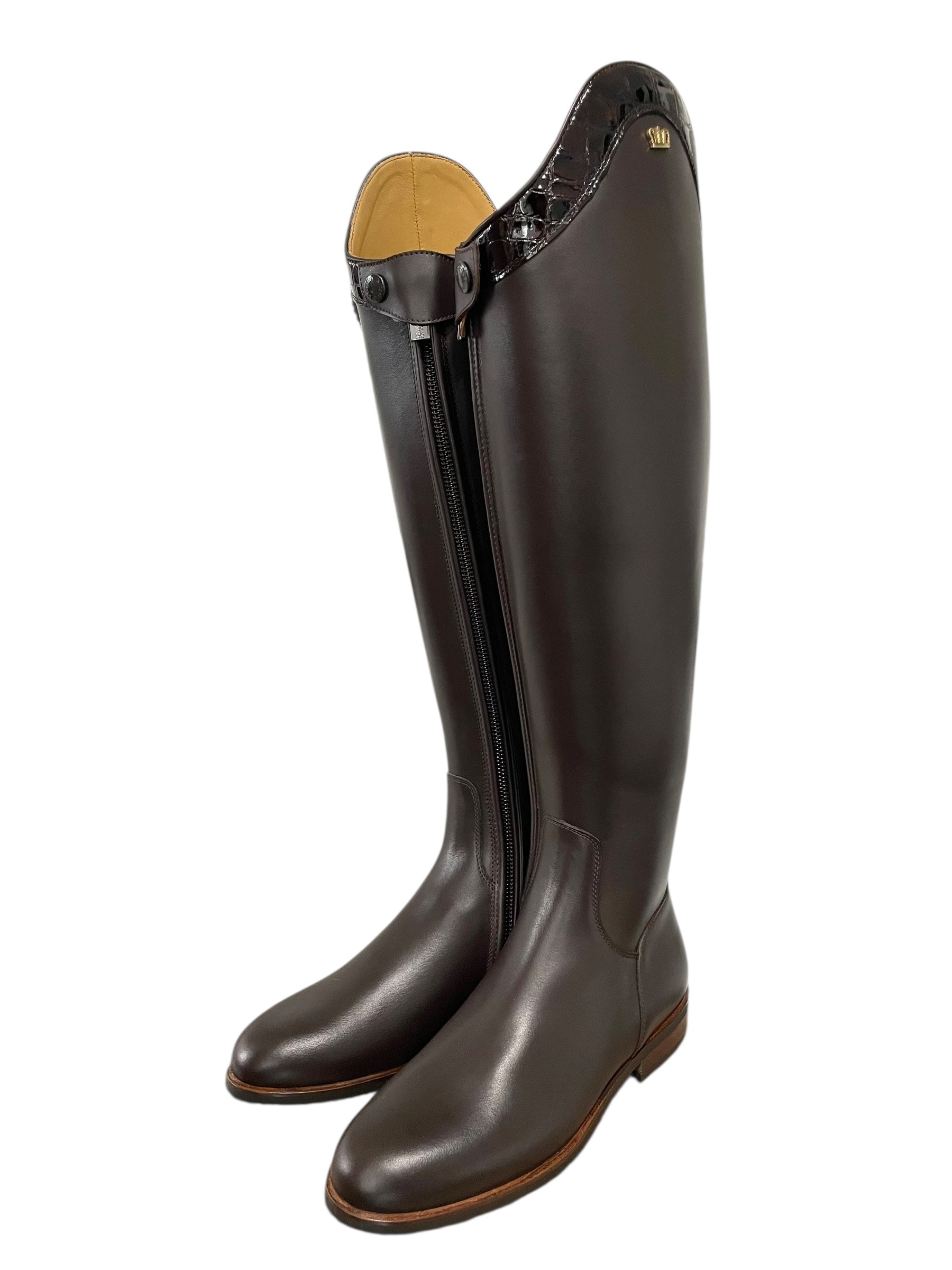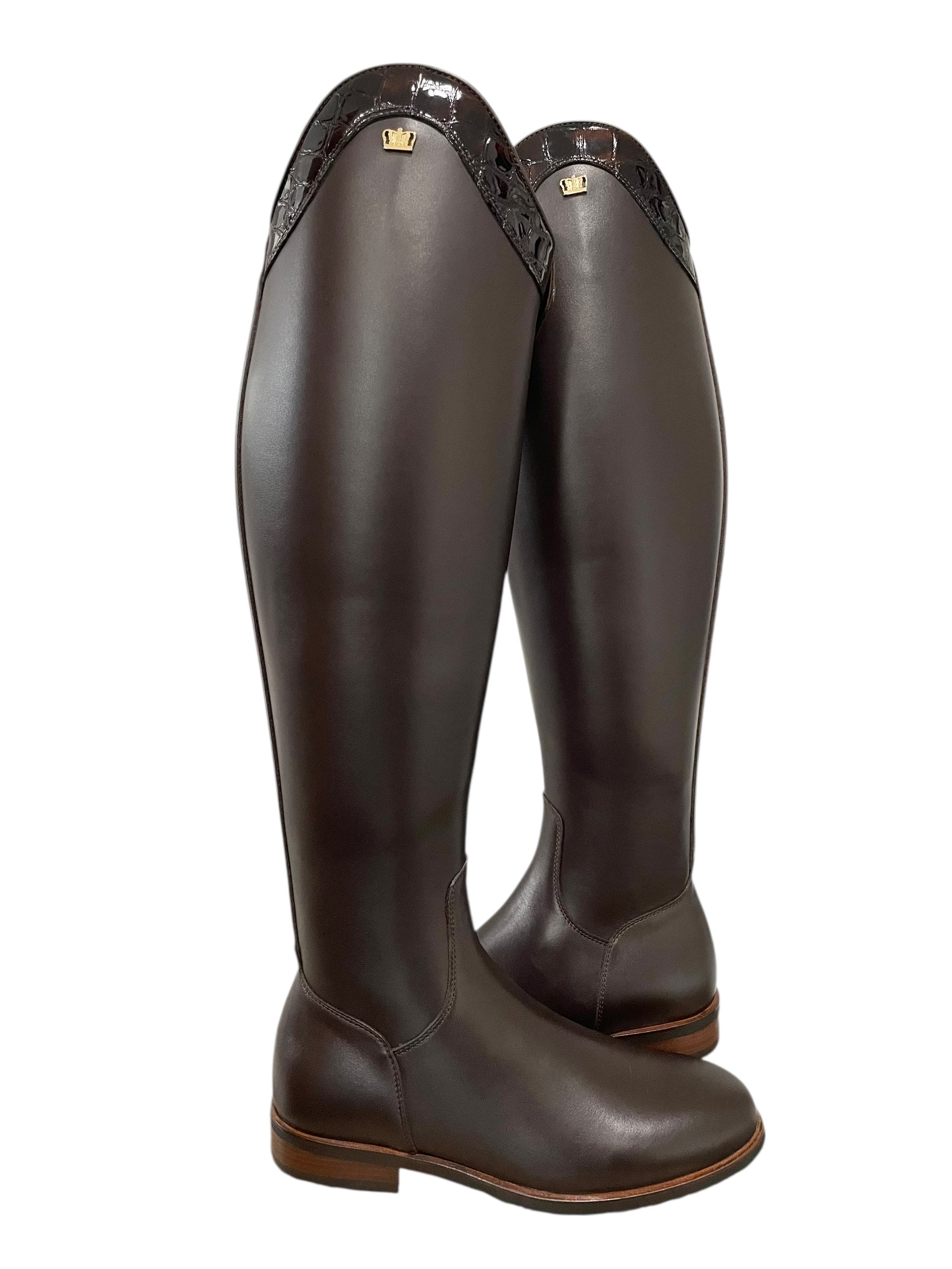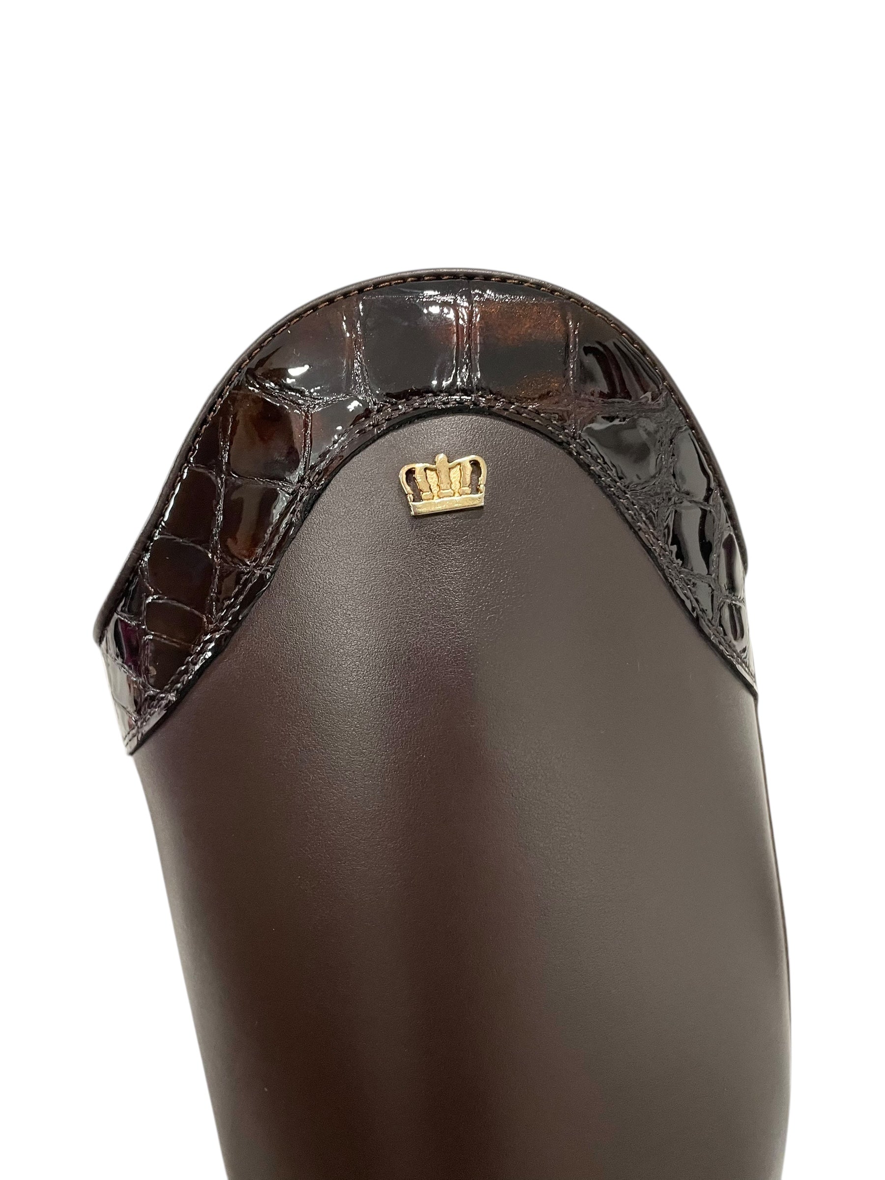 Description: Aspen dark brown base, Jenny top in croco bril castanho, gold logo crown, and brown outsole.