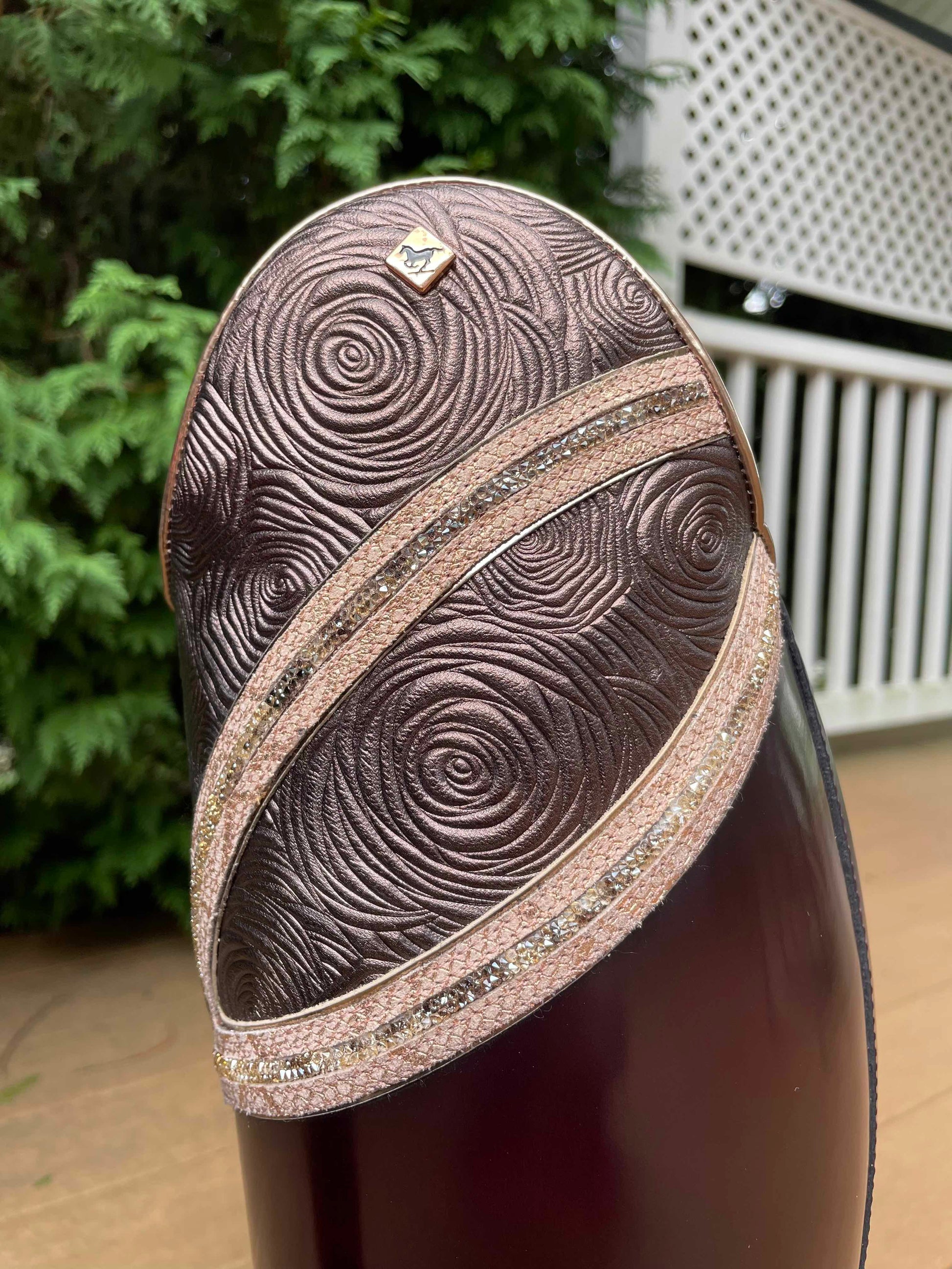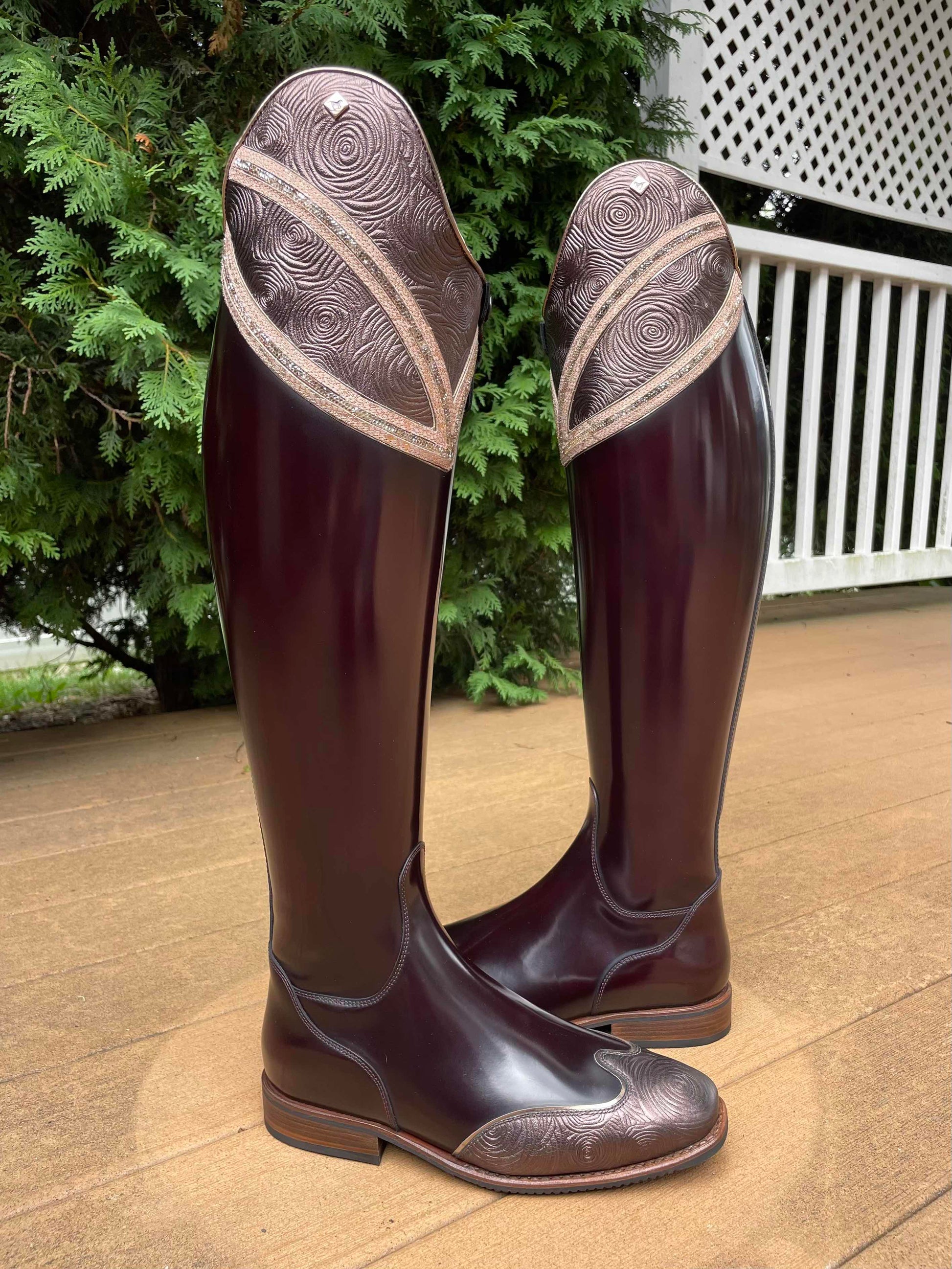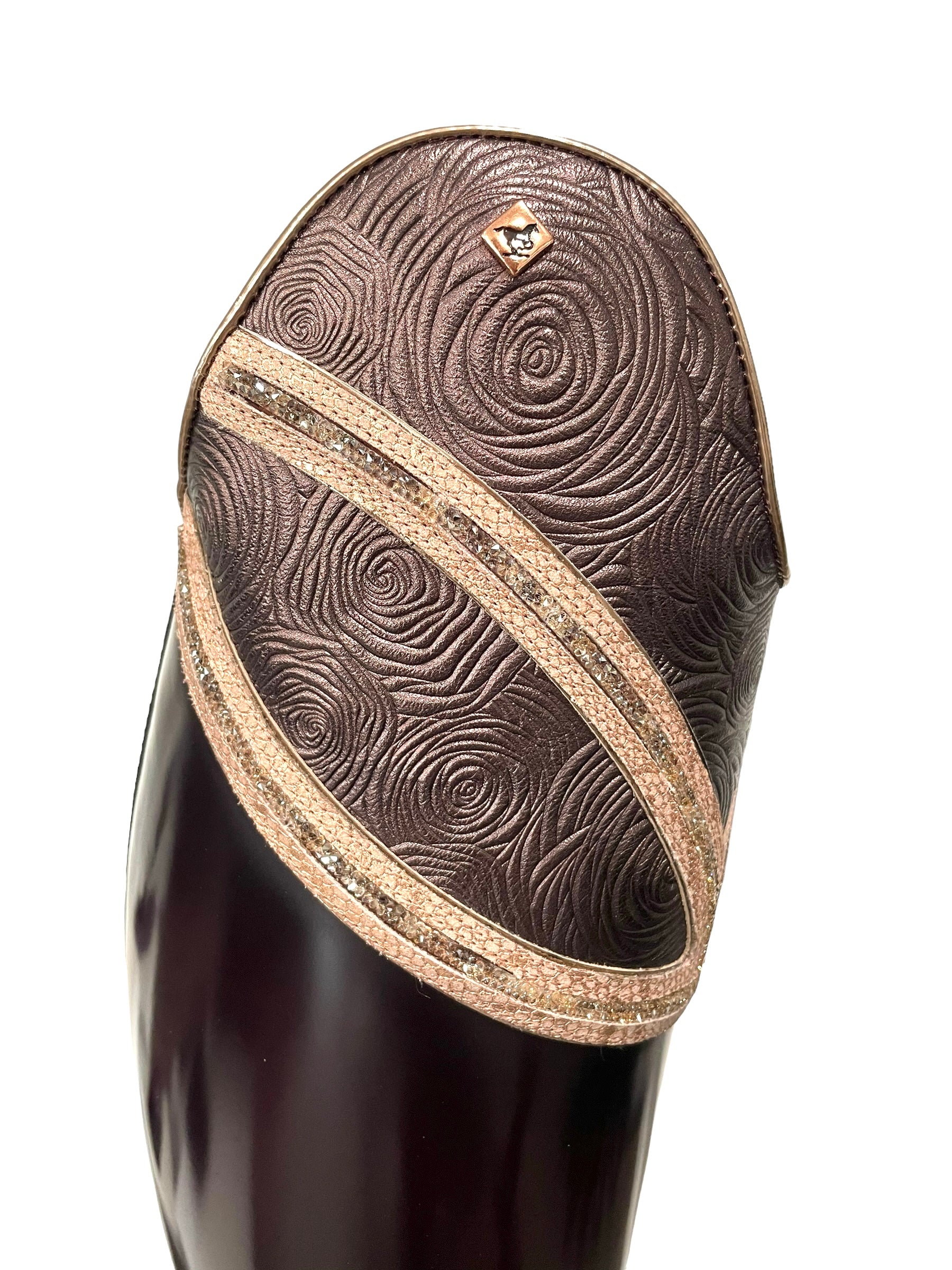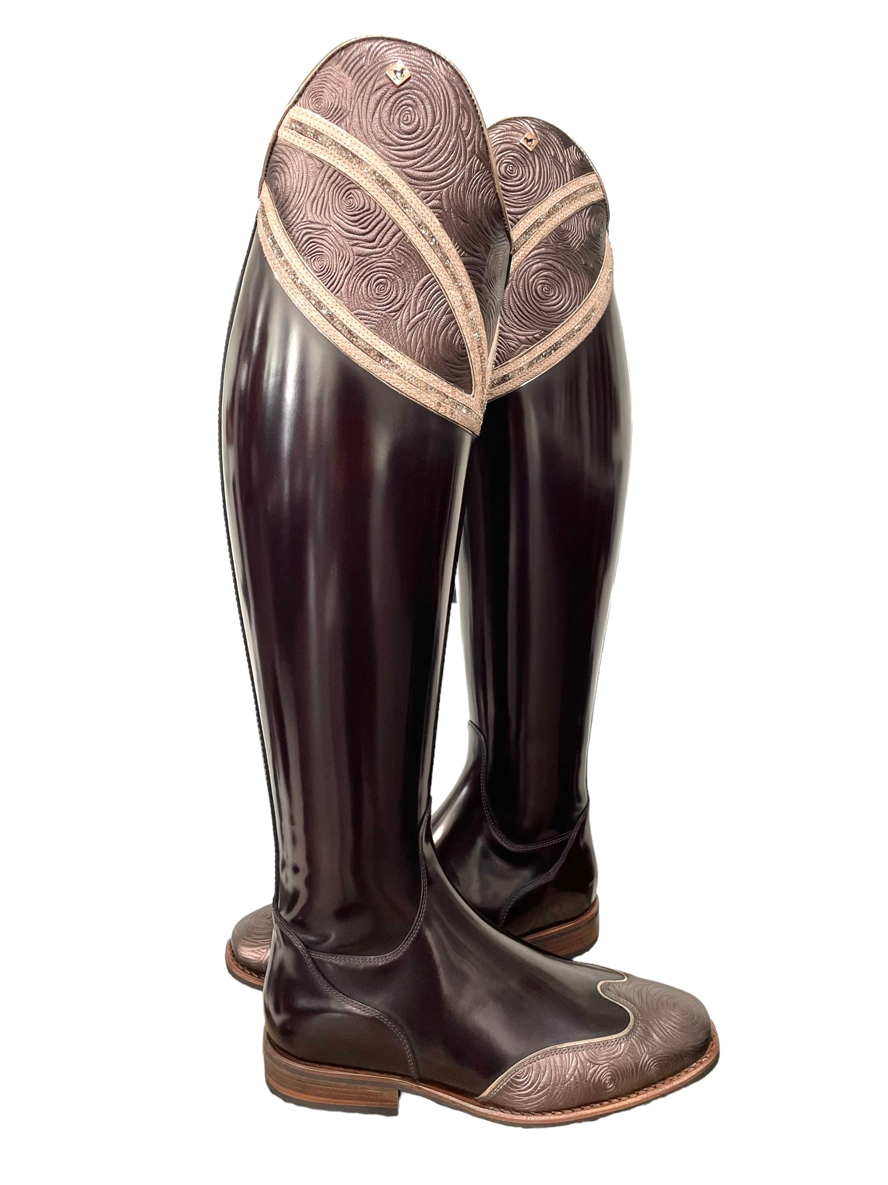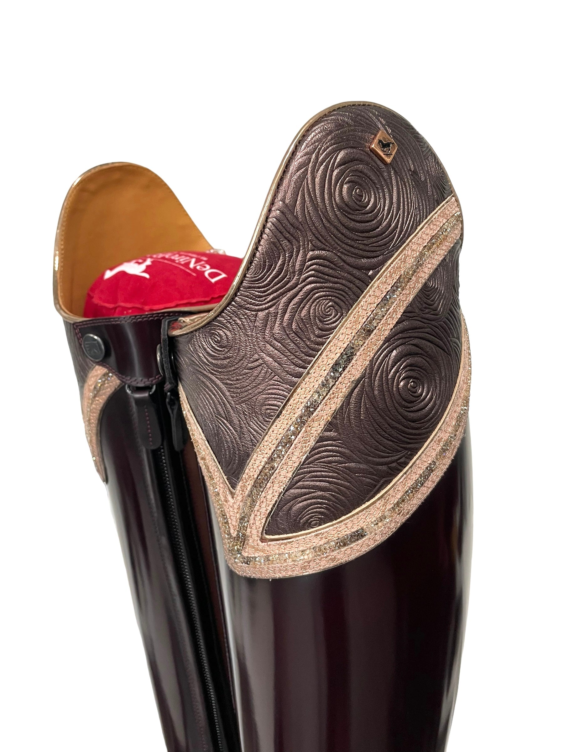 Description: Brushed burgundy base, E9 toecap in rosetto brown with specchio rame piping, G18 Hunter-Liz top in rosetto brown and regal pesca details with SW cry fine golden shadow crystals and specchio rame piping, rose gold logo, WRAT brown inside shaft, and brown outsole.