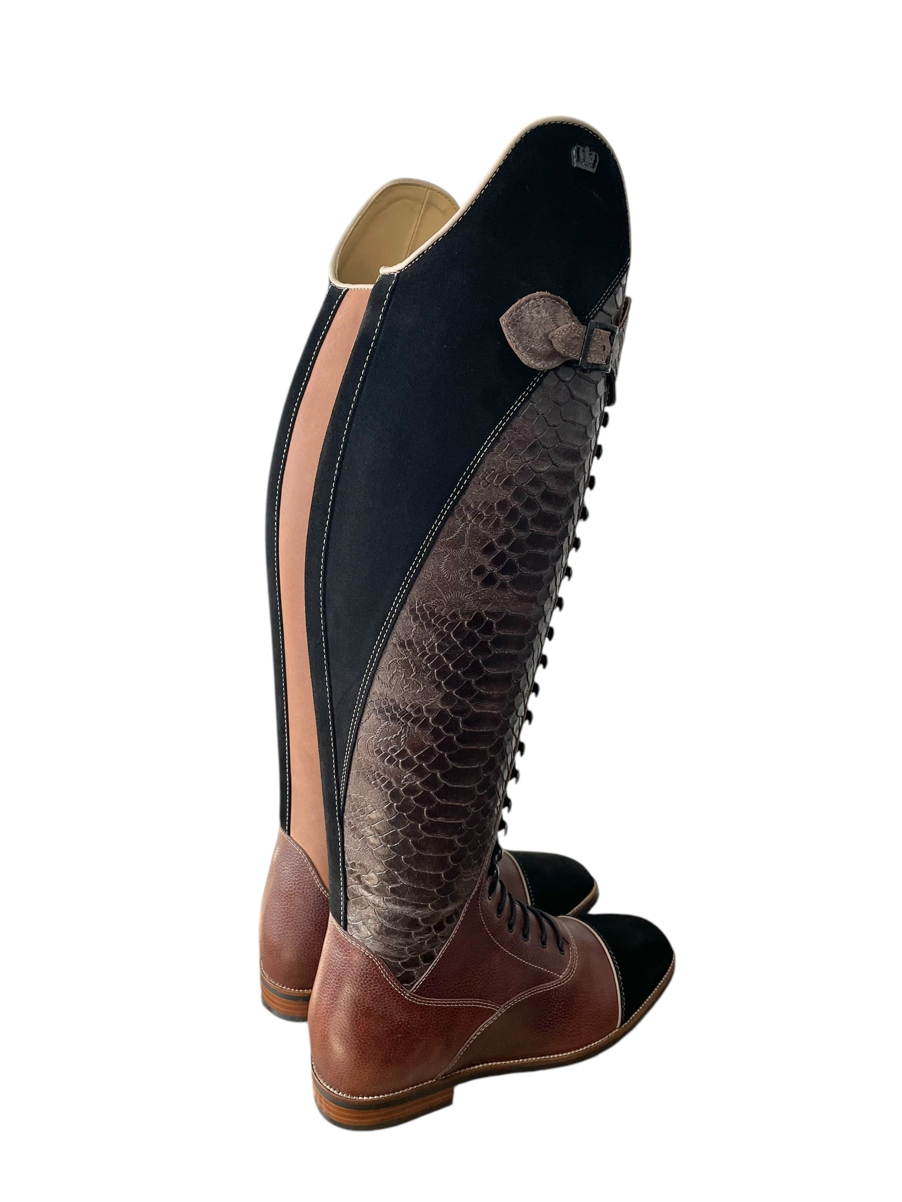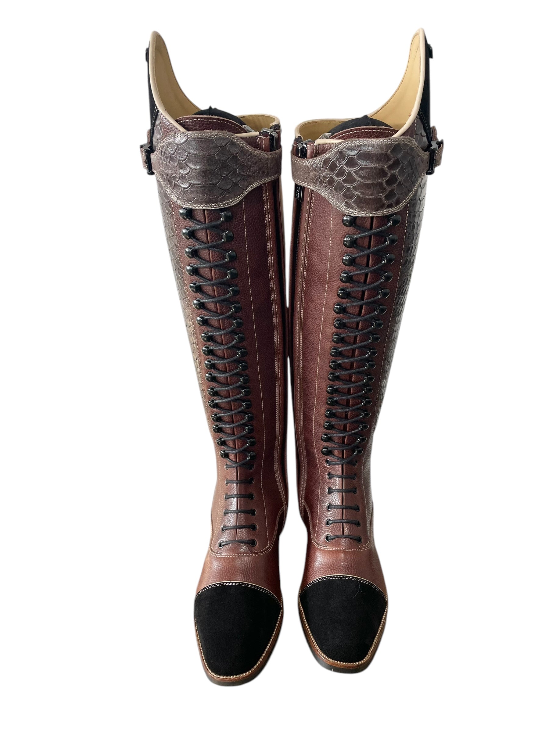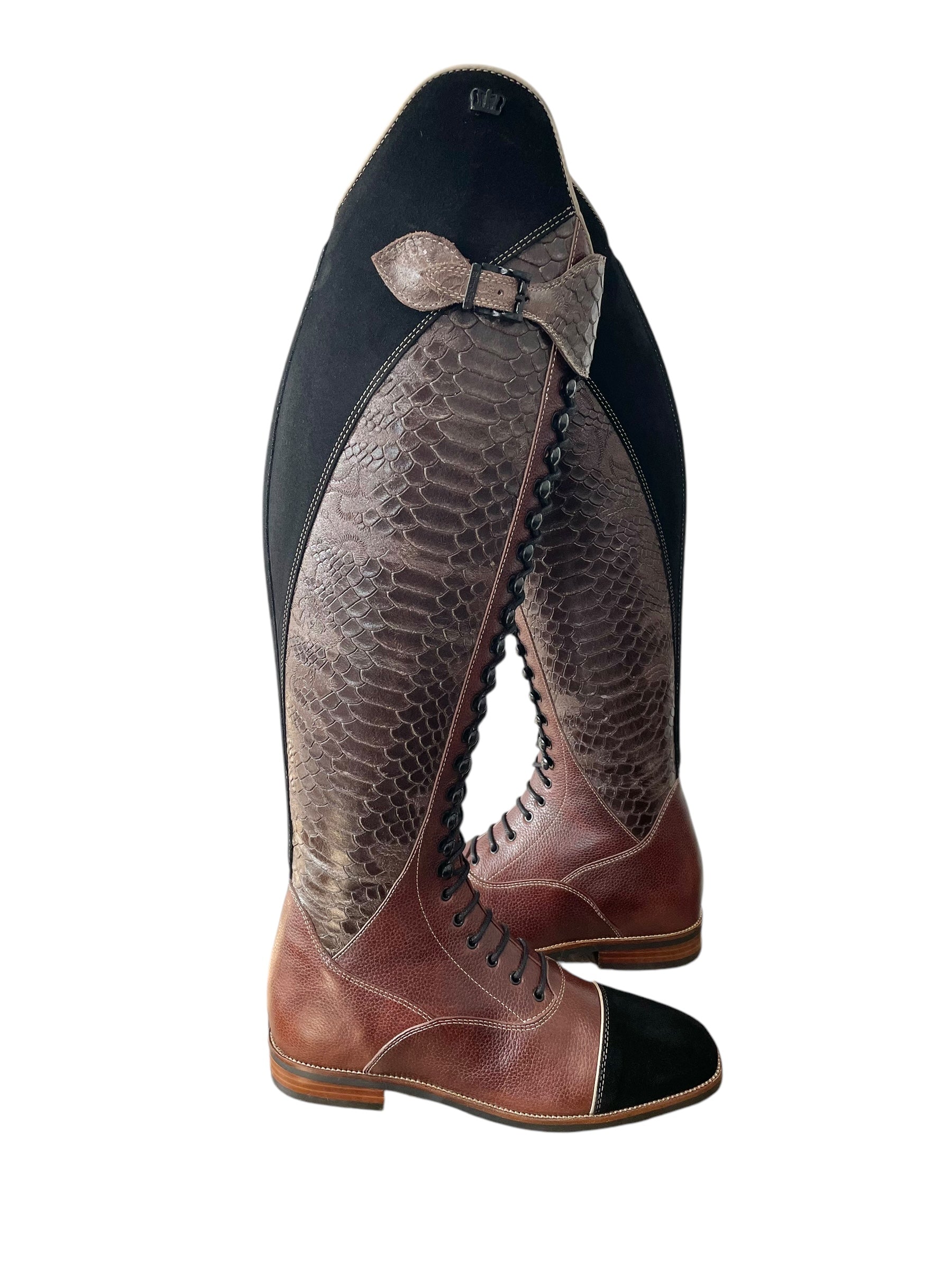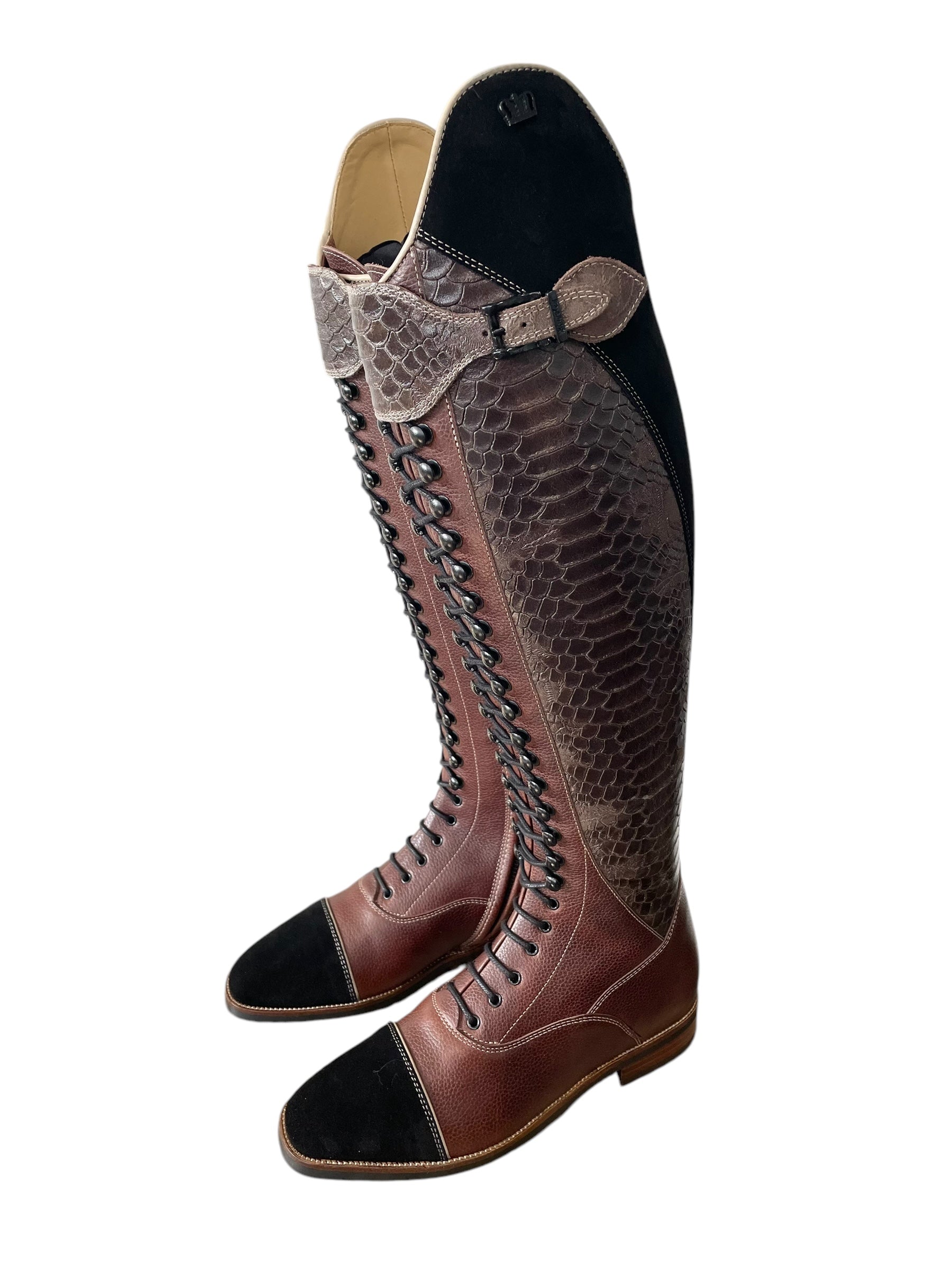 Description: Paxson cedar base with vittoria dundee expresso shaft and top strap, nature beige top piping and toecap piping, paula top in black suede, black suede toecap, matte black logo crown, matte black hooks and buckles, sand beige stitching, gaucho chestnut inside shaft, and brown outsole.