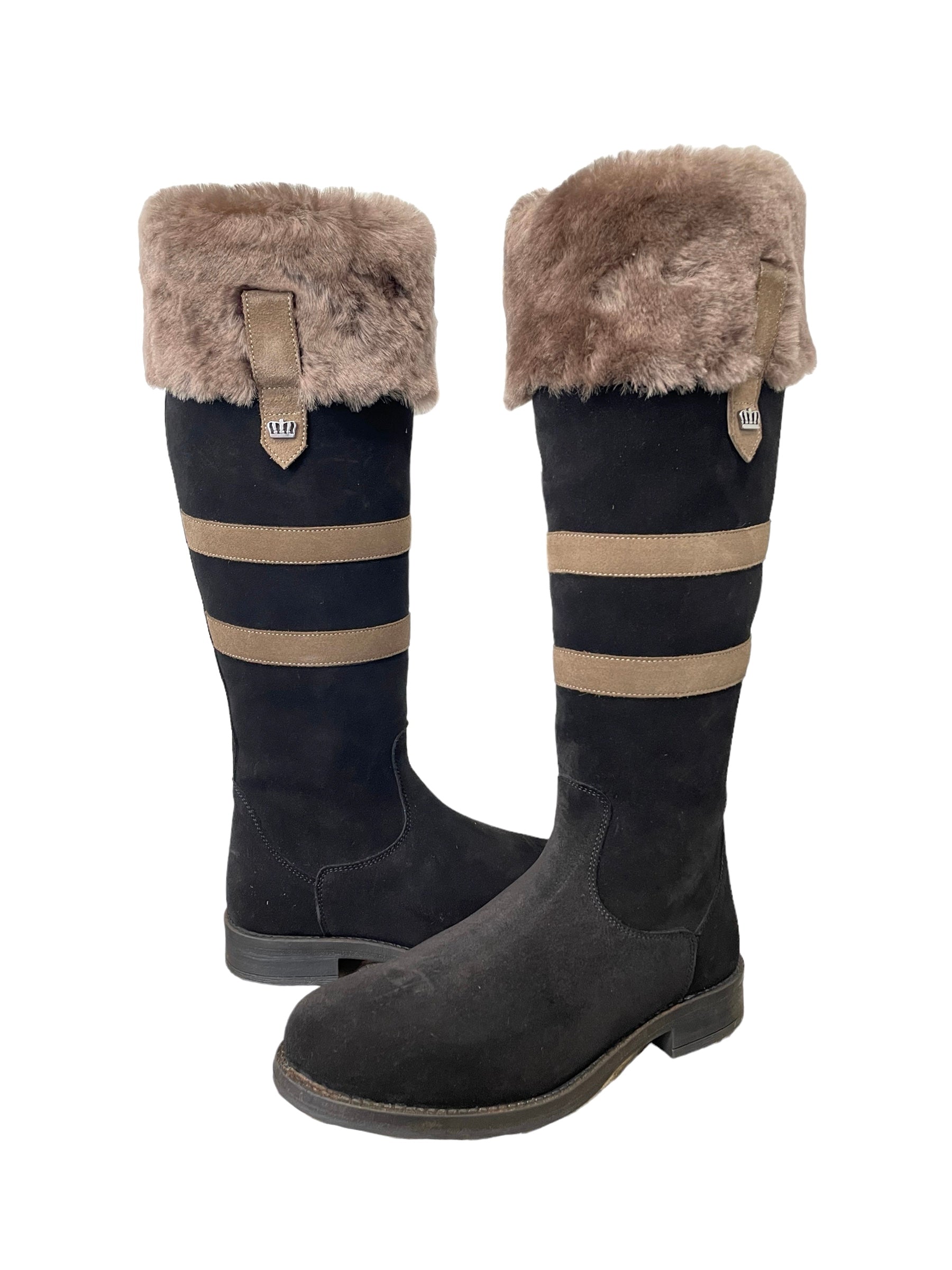 Description: Black suede base with taupe suede accents, taupe sheepskin, and black amsterdam outsole.