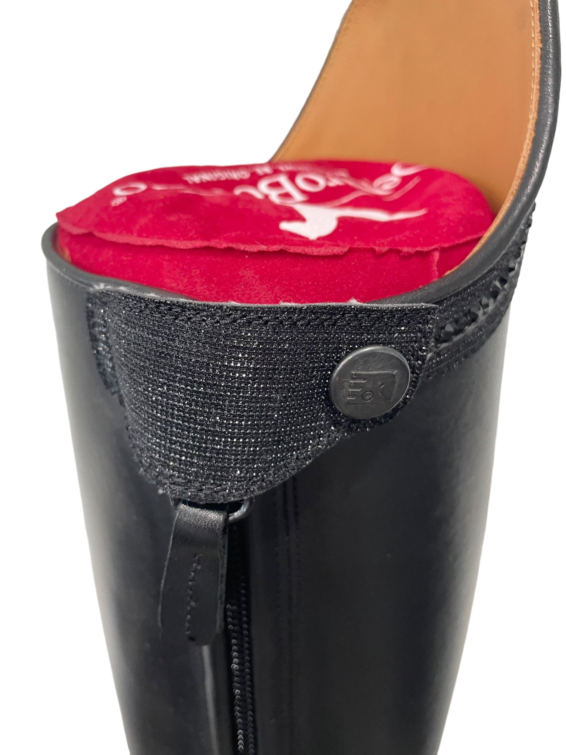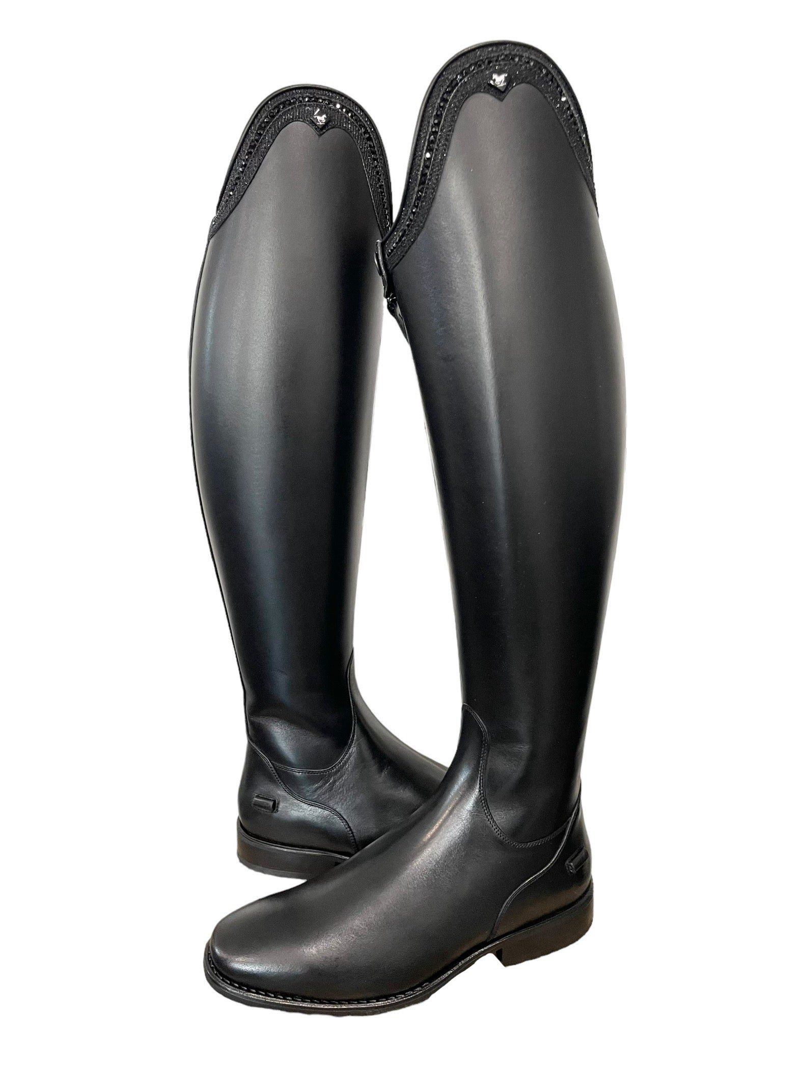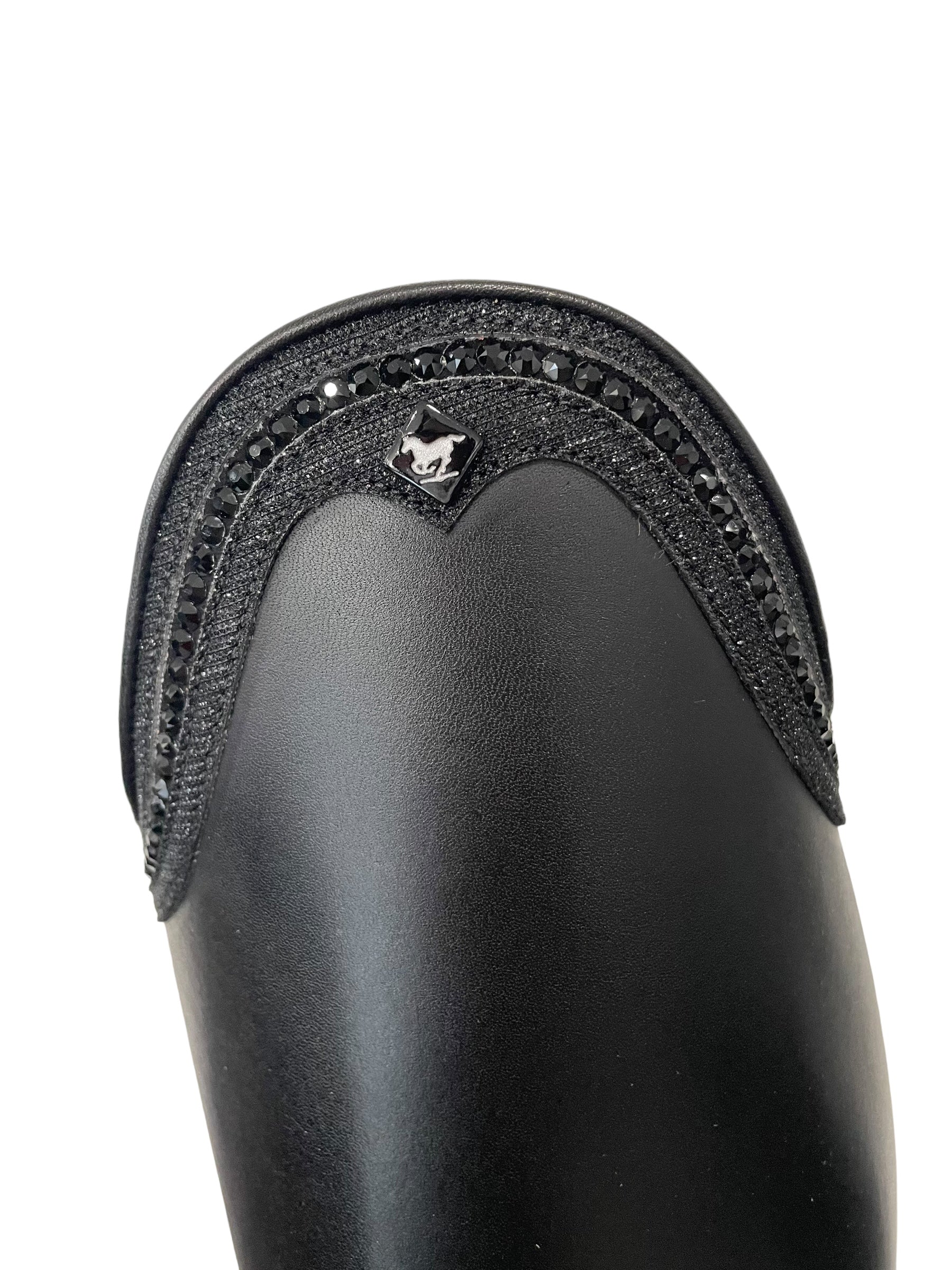 Description: WRAT black base and spur rests, G9 Rondine top in iride black with jet black Swarovski crystals, iride black zip protector, black logo, and black outsole.