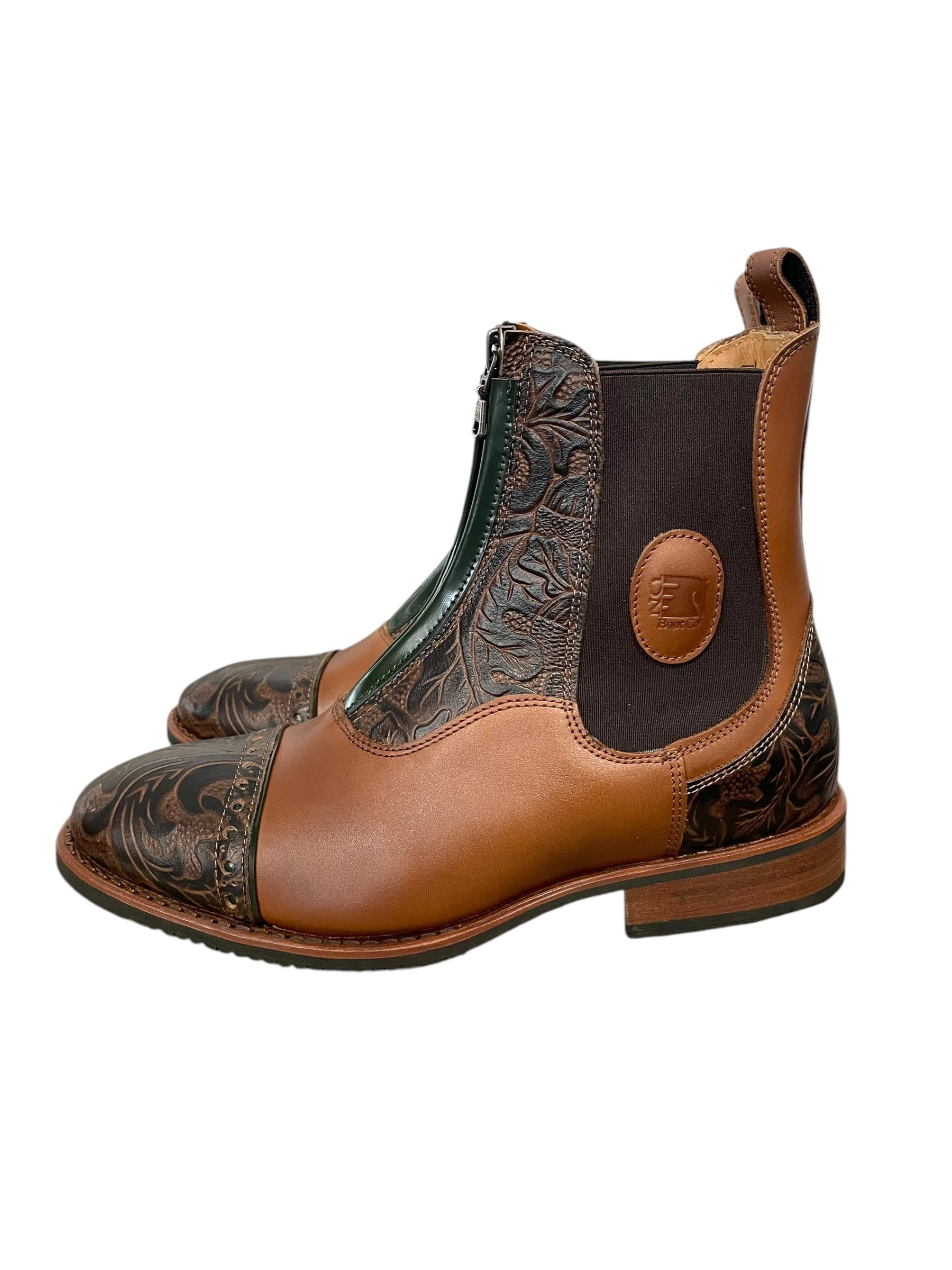 Description: WRAT vintage oxford base, E5 toecap in anna brown, anna brown heel and instep, brushed green along the zipper, brown elastic, round toe, and brown outsole.