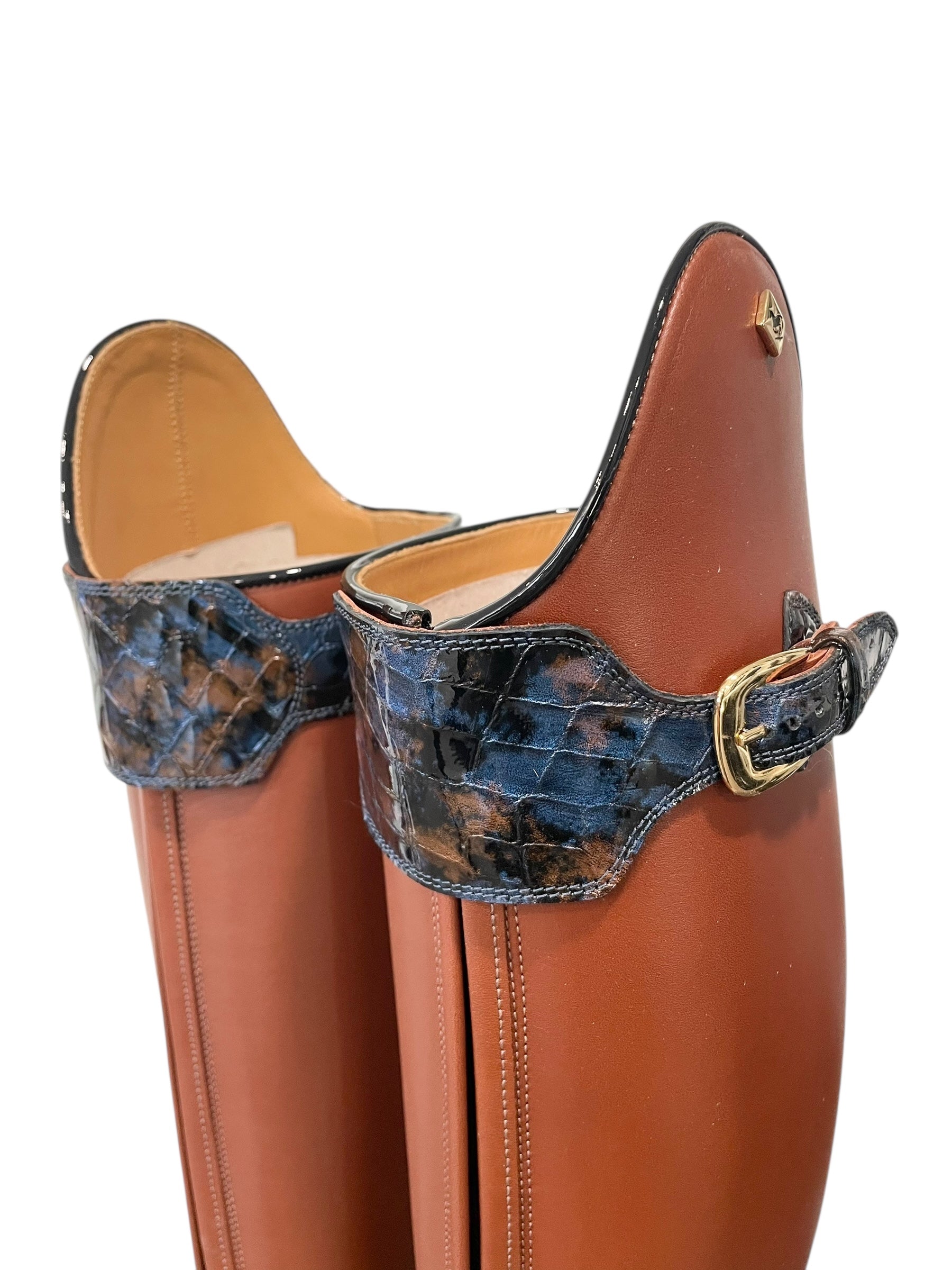 Description: WRAT brandy base, top strap in lucidi sfumati blue with gold buckle, patent blue navy top piping, E3 toecap with blue navy piping, gold logo, brown outsole.