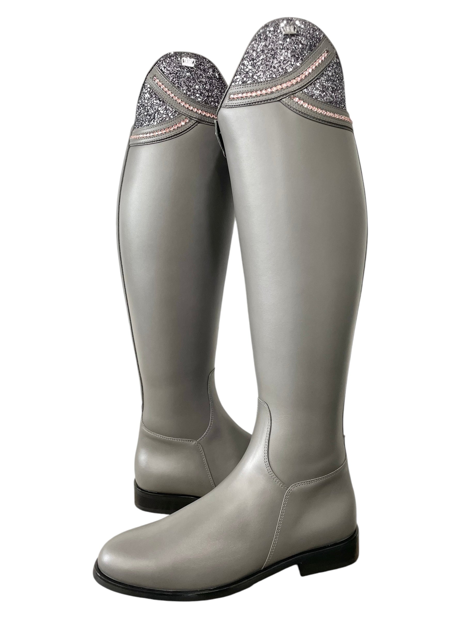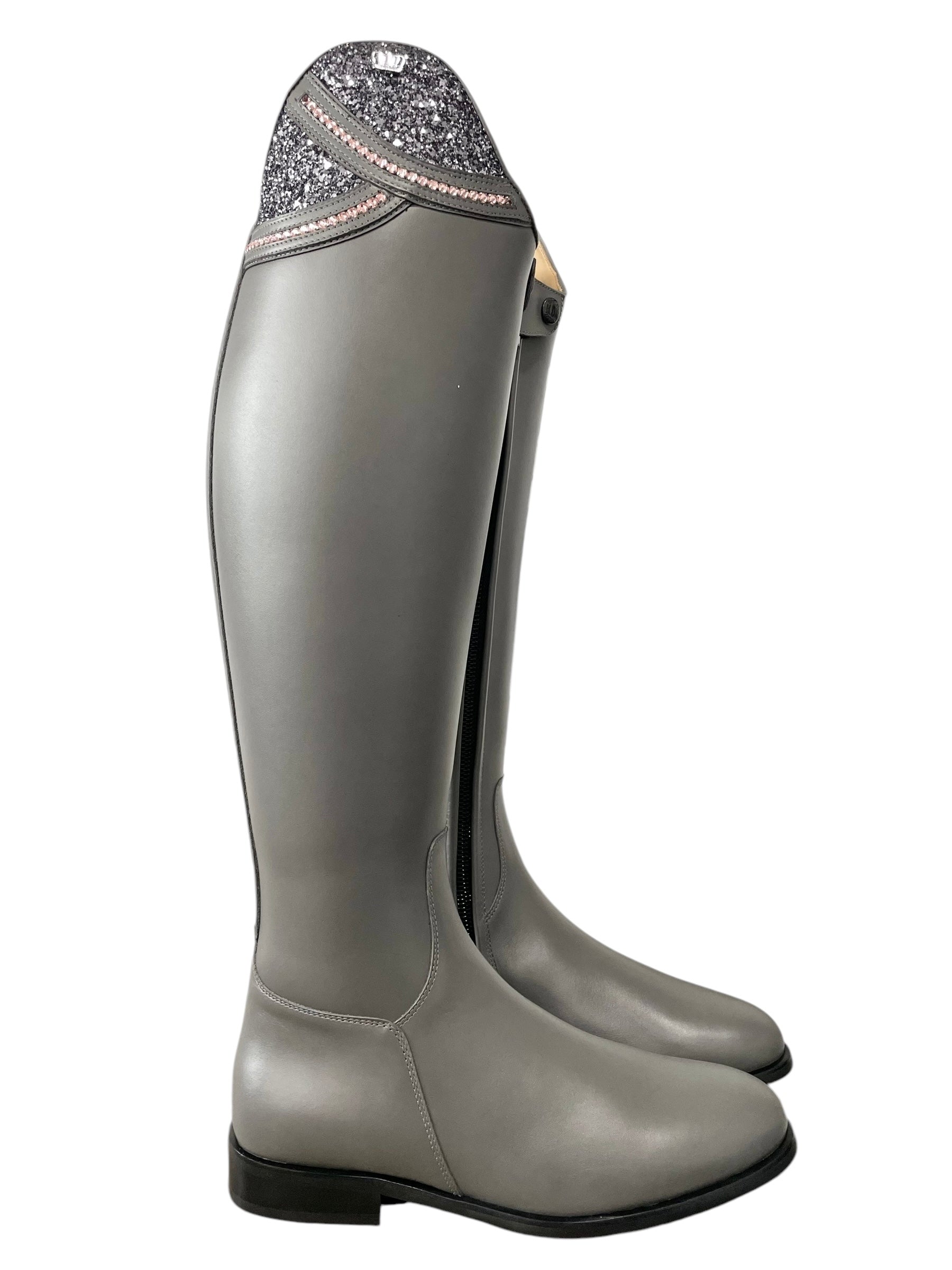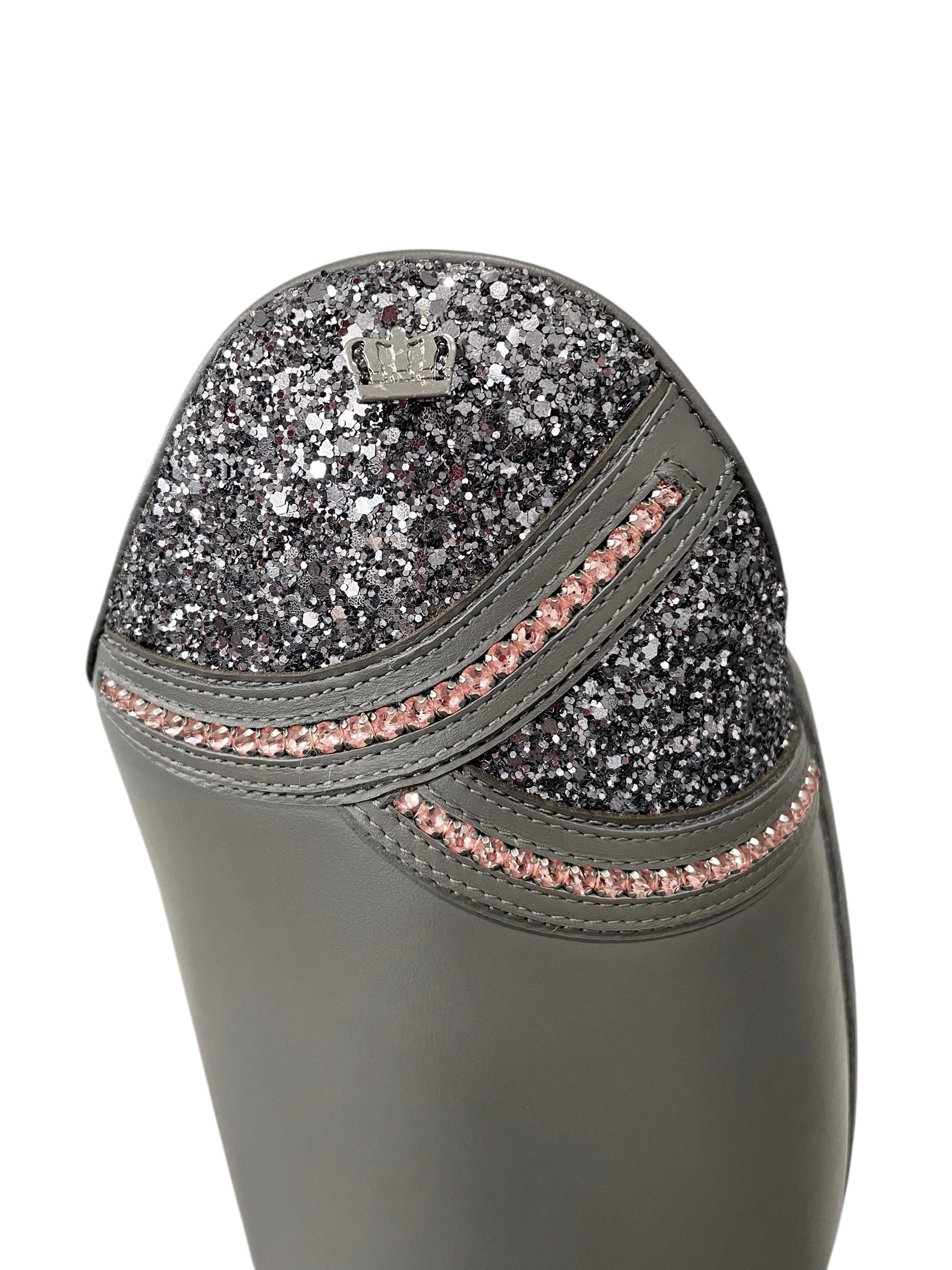 Description: Aspen grey base, Clarice top in grueso anthractie with pink Swarovski crystal banding, silver logo crown, and black outsole.