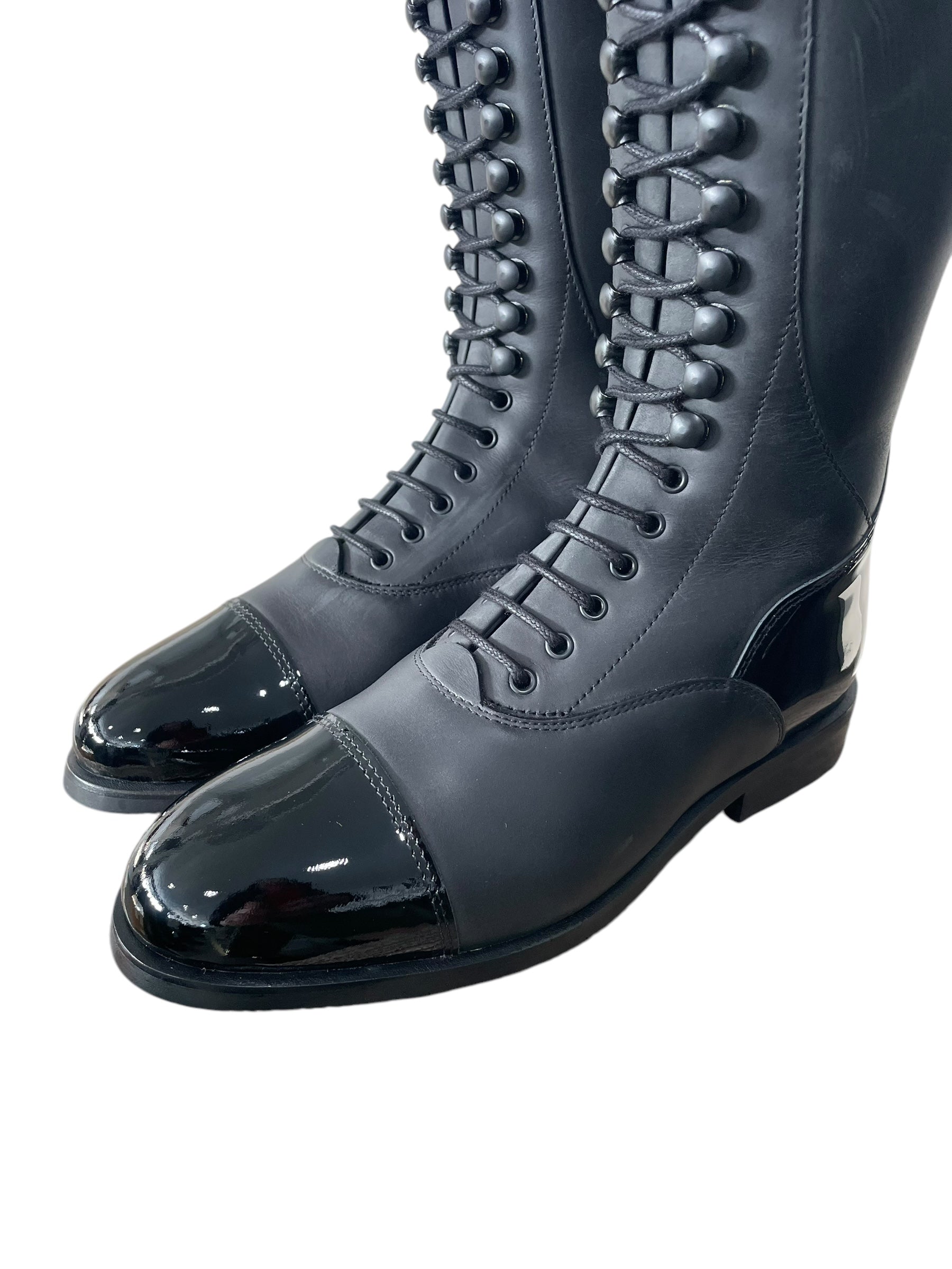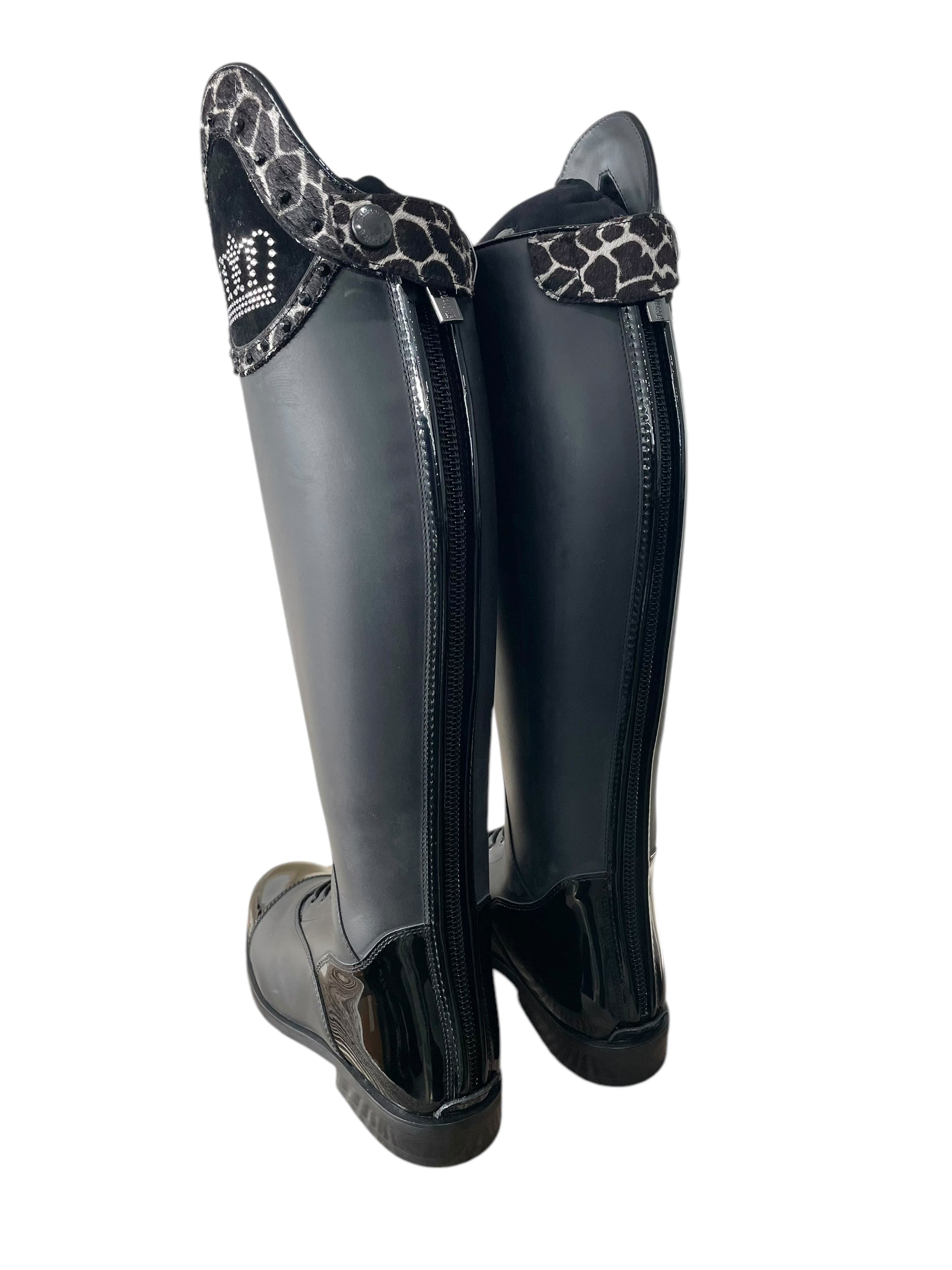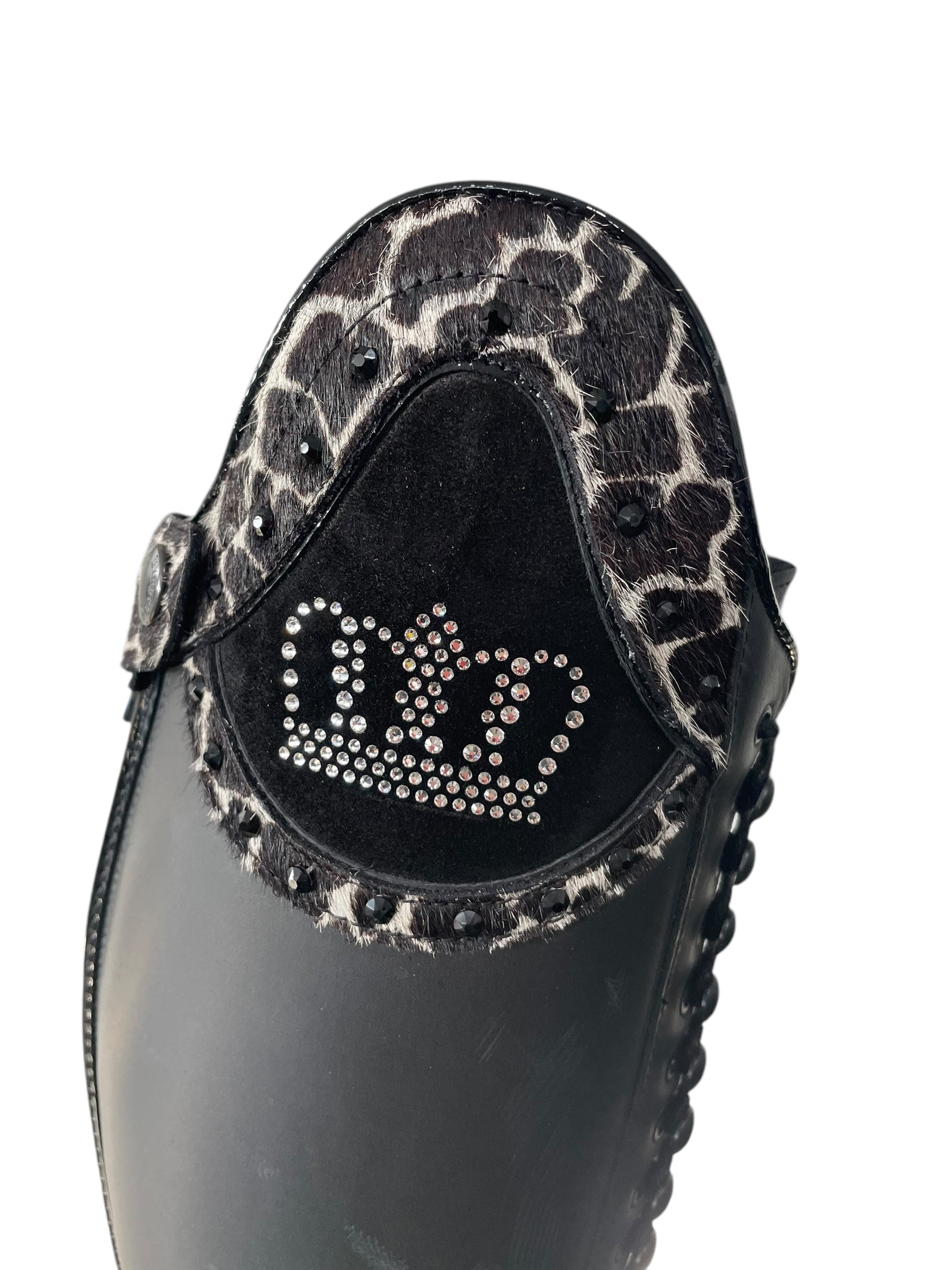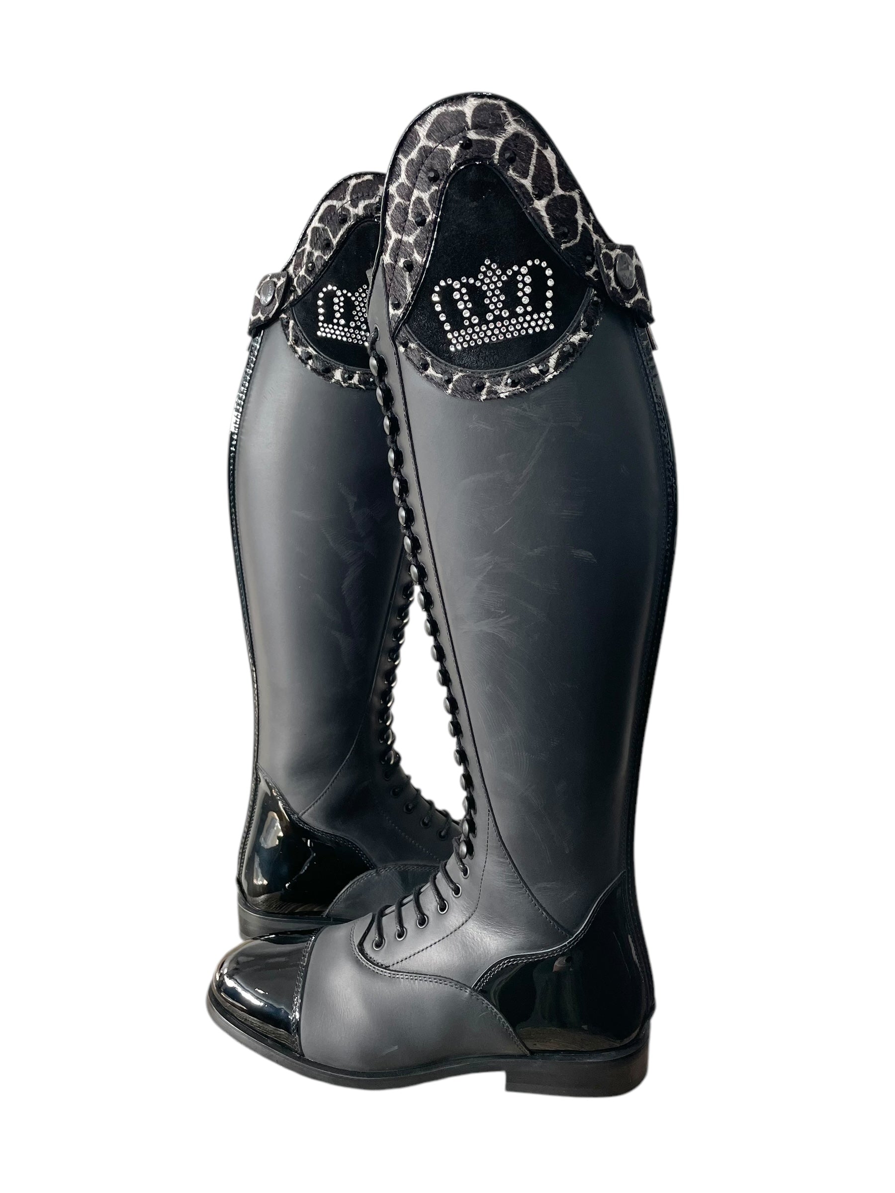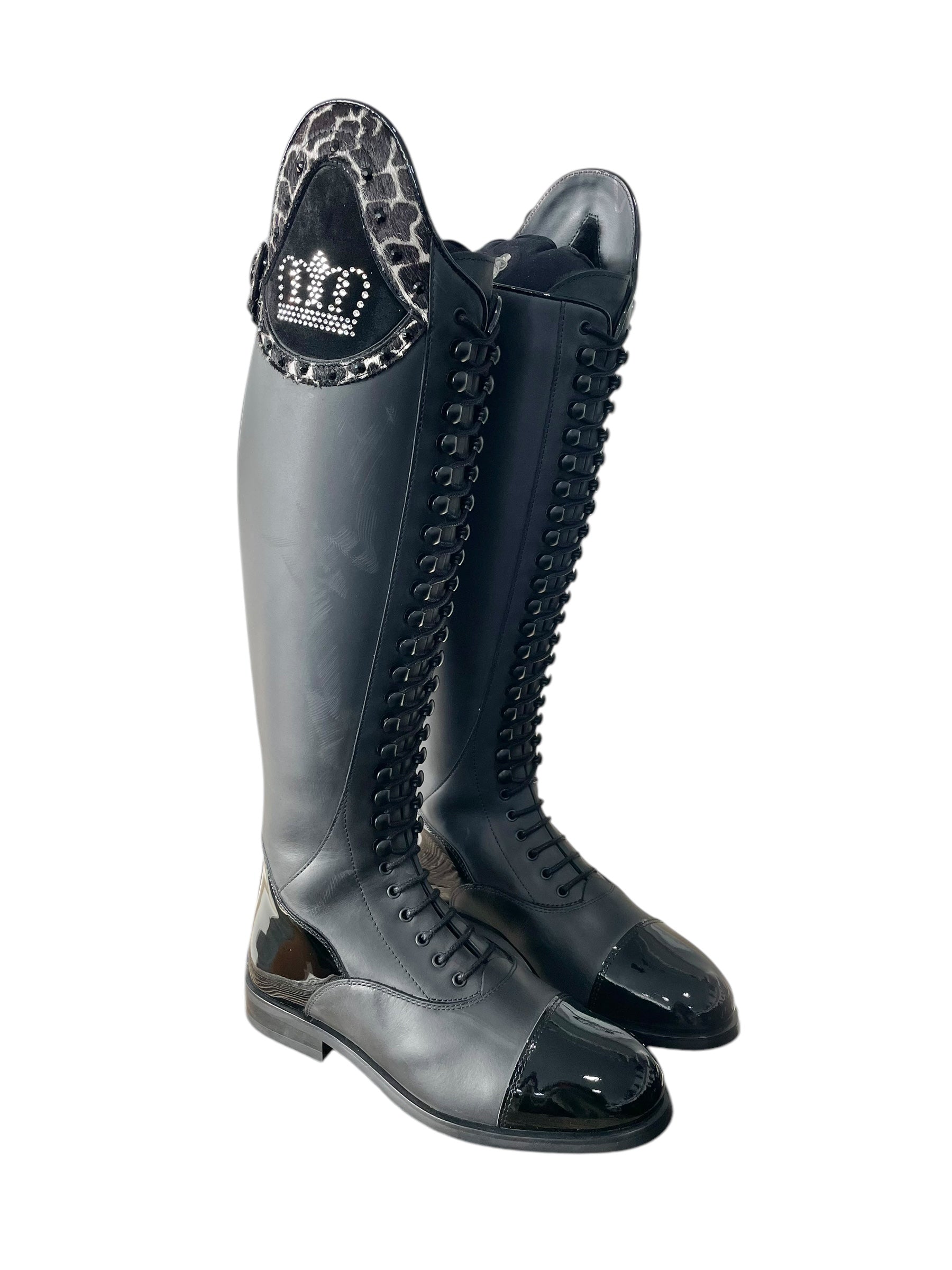 Description: Gaucho black base, eve top in black cow and sensory black suede with roma black top piping and black Swarovski crystals with clear Swarovski crystal crown, roma black heel and toecap, roma black parts along the back zipper, matt black hooks and black laces, black sheepskin lining, black cow top zip protector, polished black logo crown, and black outsole.