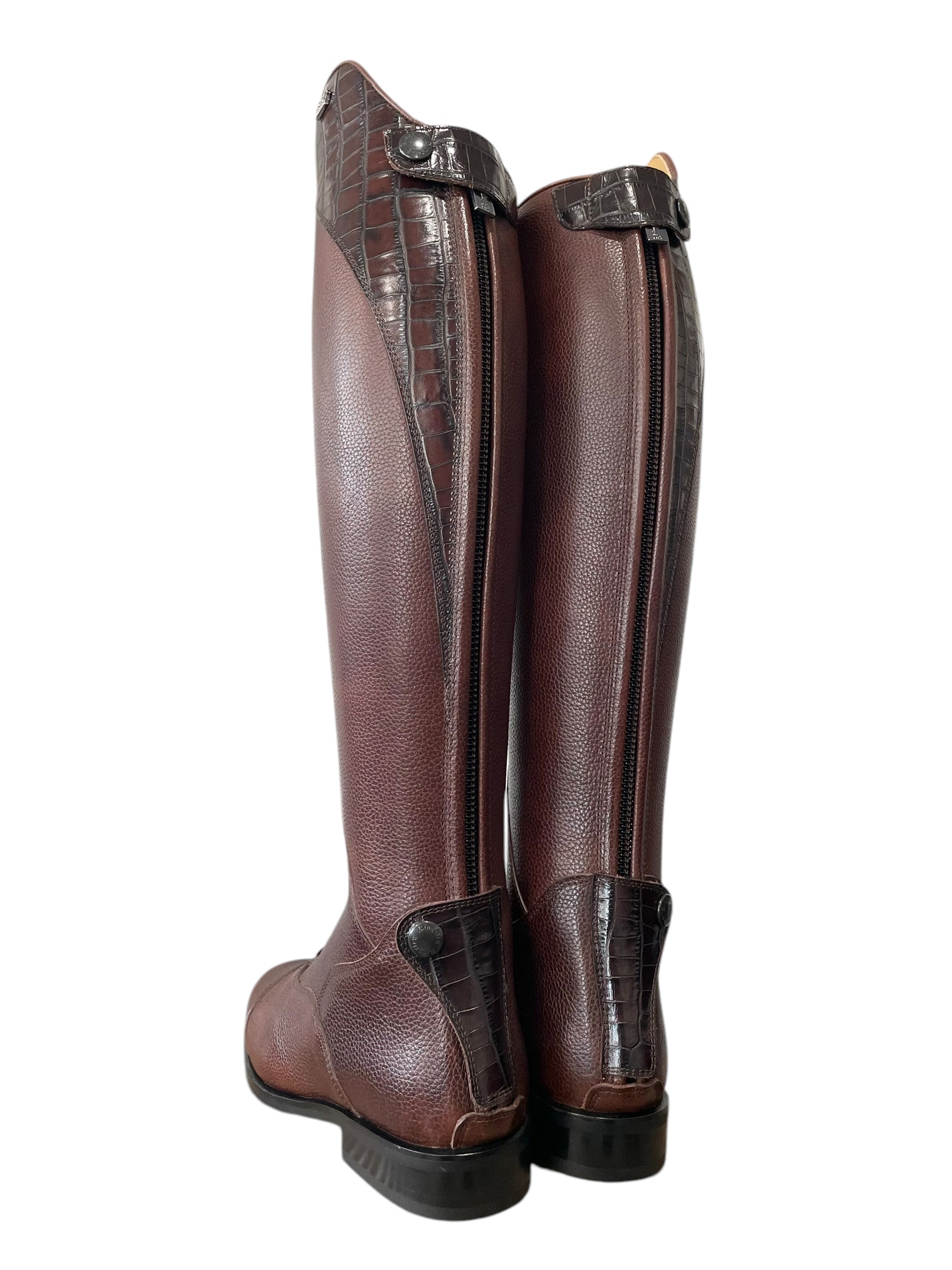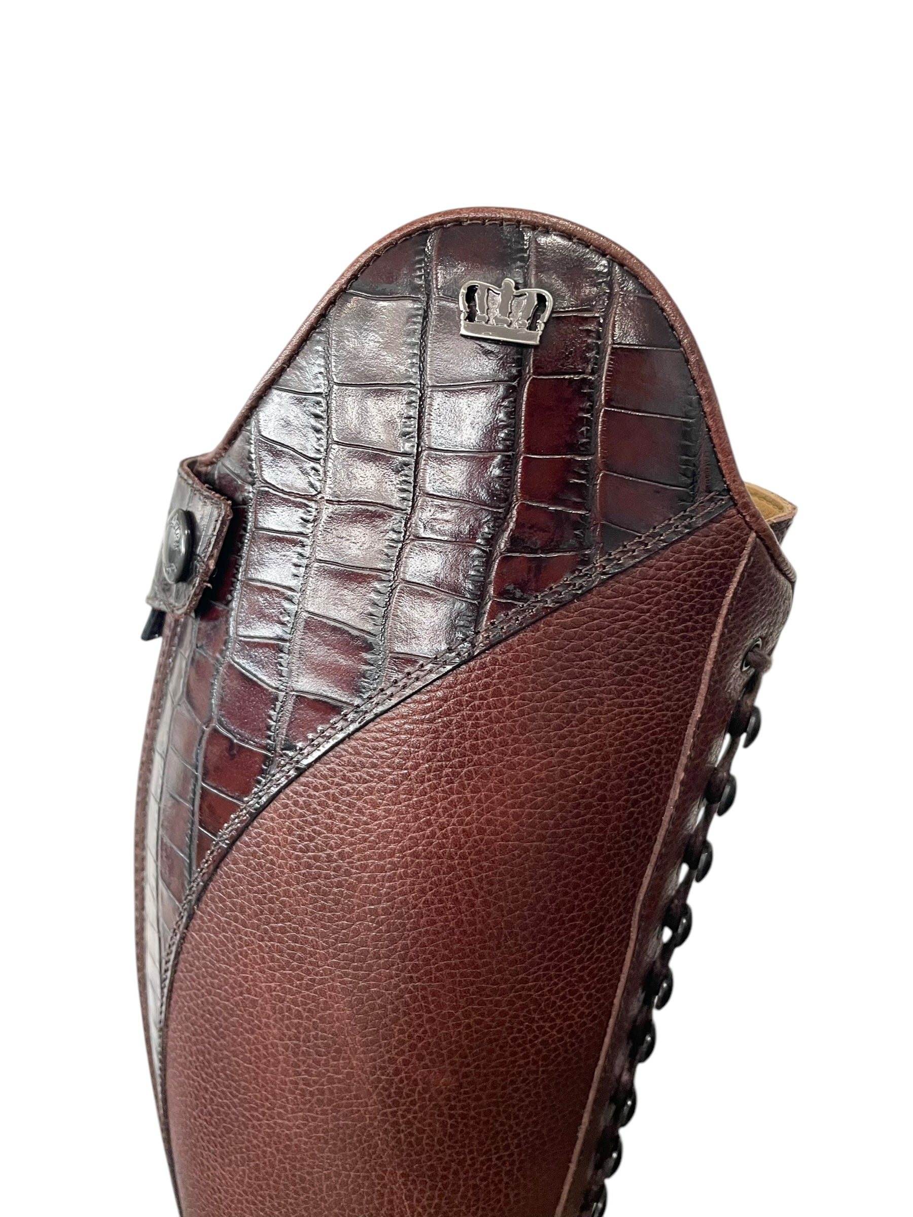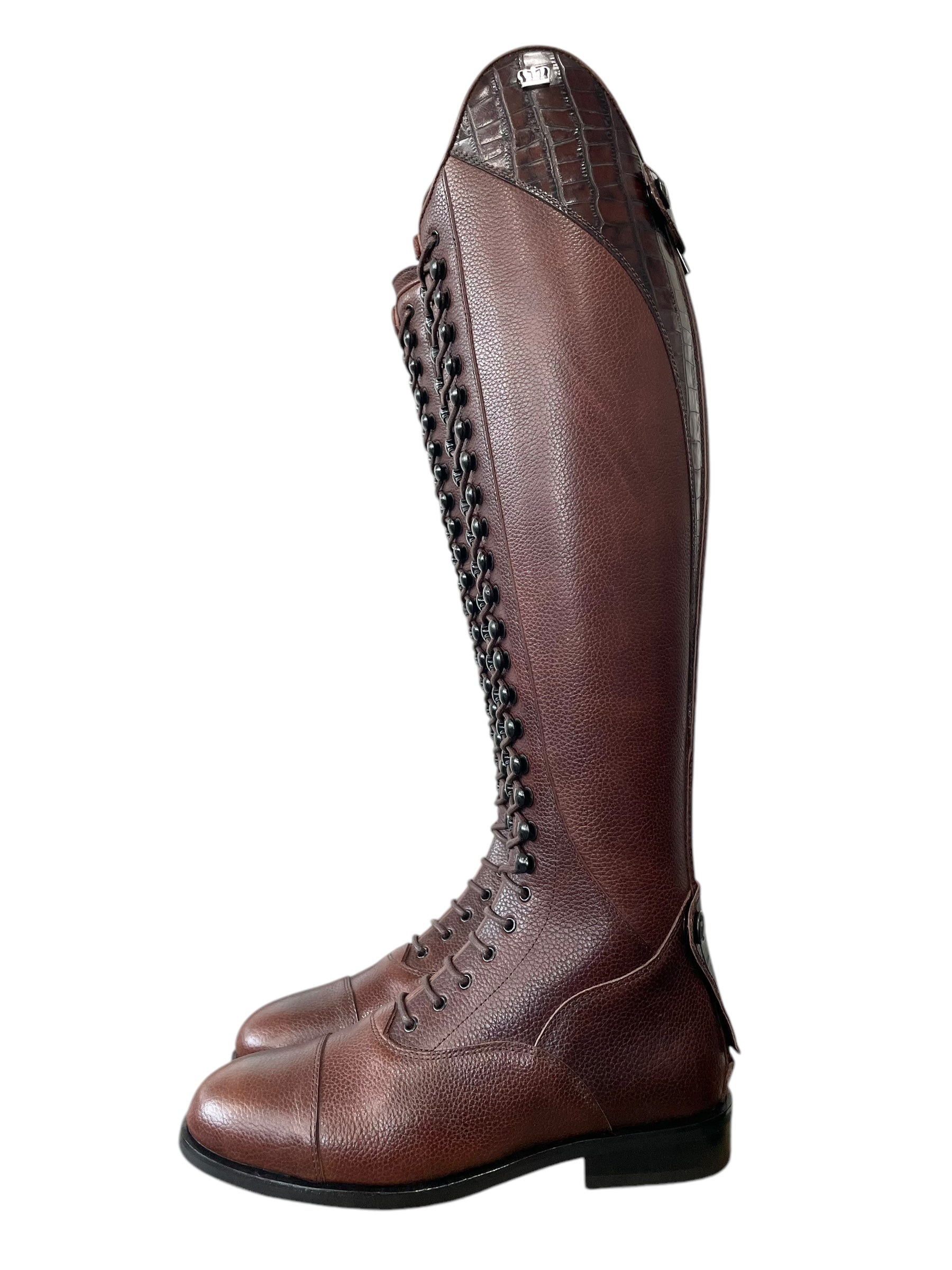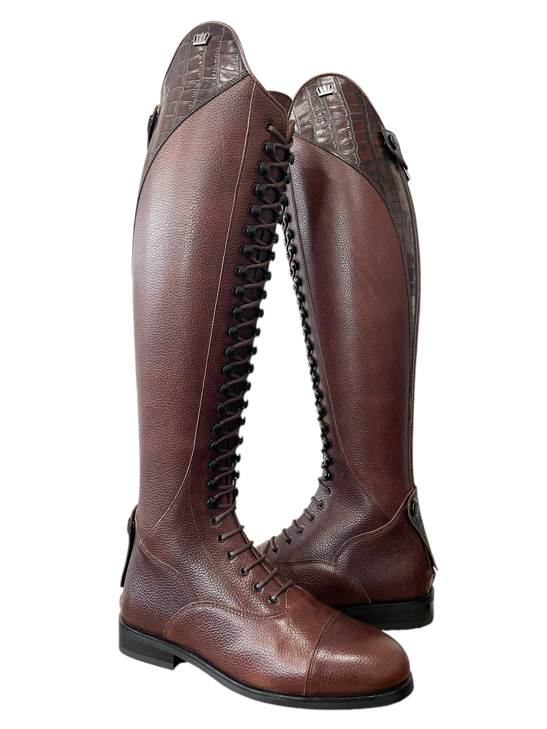 Description: Paxson cedar base, Paula top in croco beleza brown, croco beleza brown zip protectors, matte black hooks with brown laces, polished black logo crown, and black outsole.