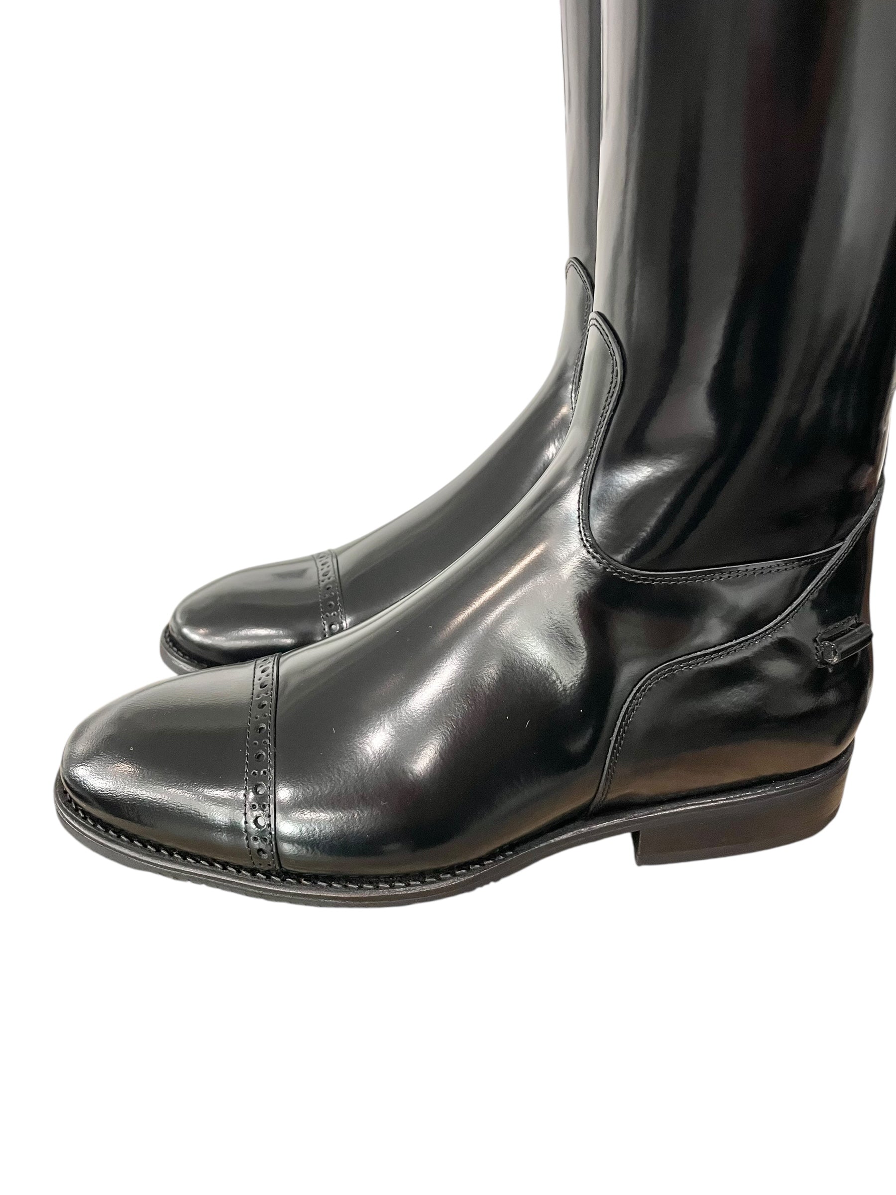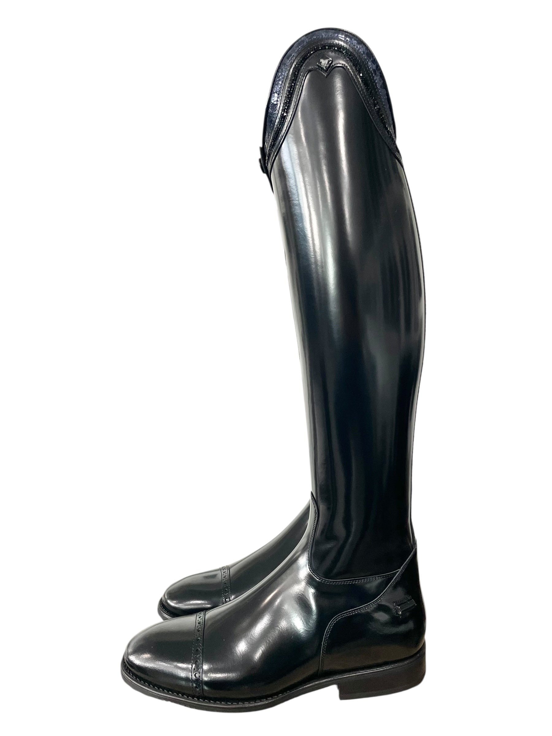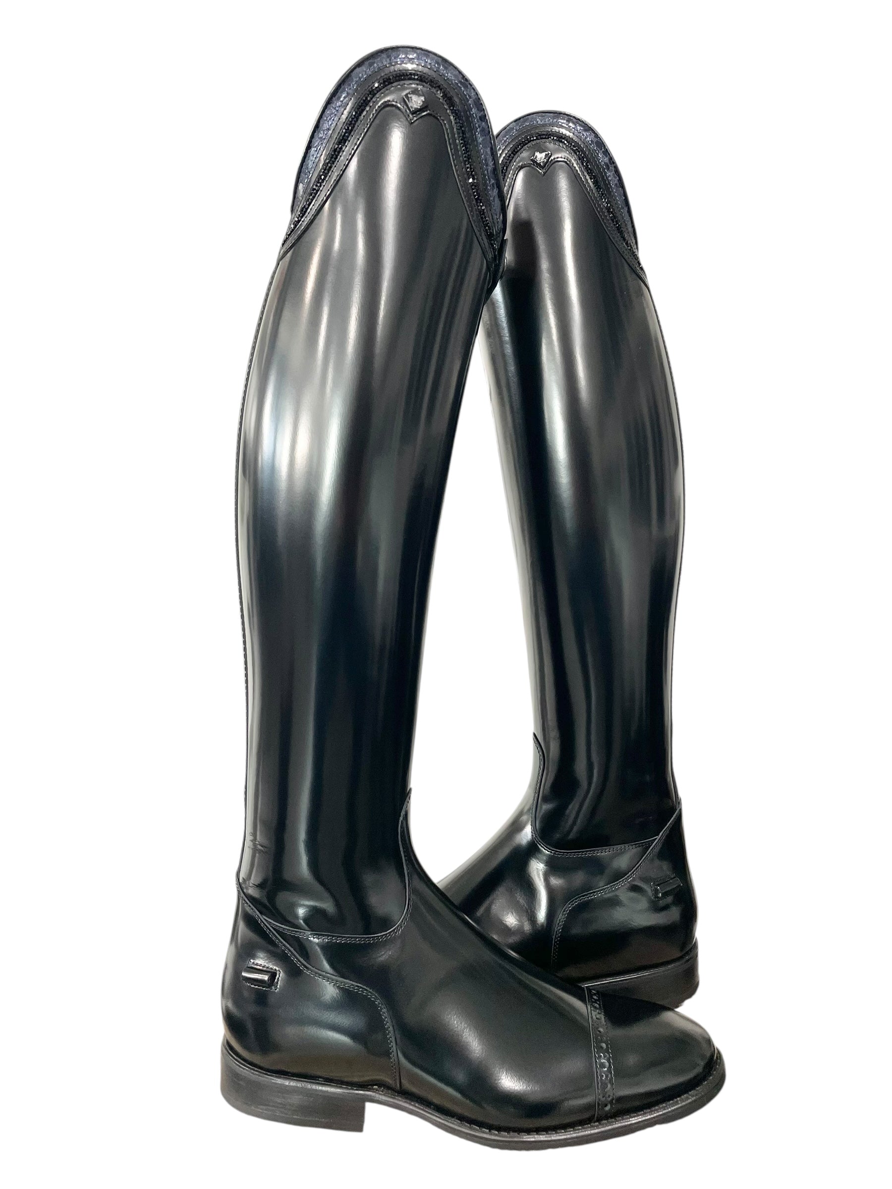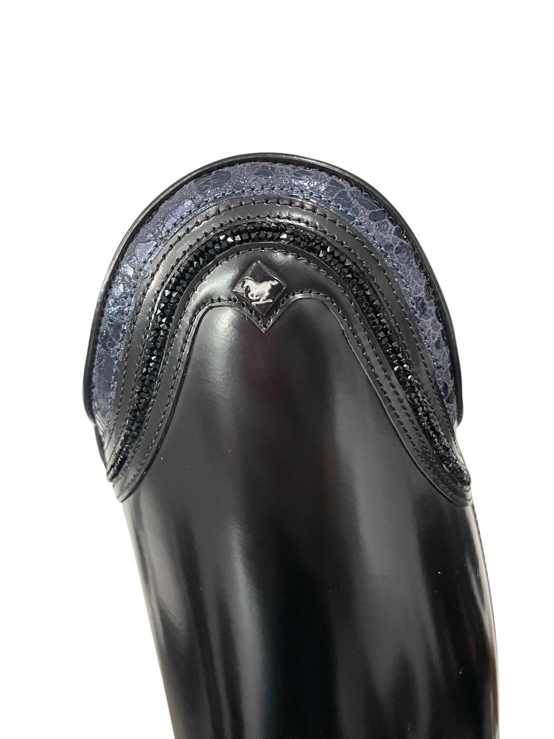Description: Brushed black base, top in ice notte and brushed black with GGS73 black Swarovski crystals, E5 toecap with brogues, dark navy stitching, black logo, and black outsole.