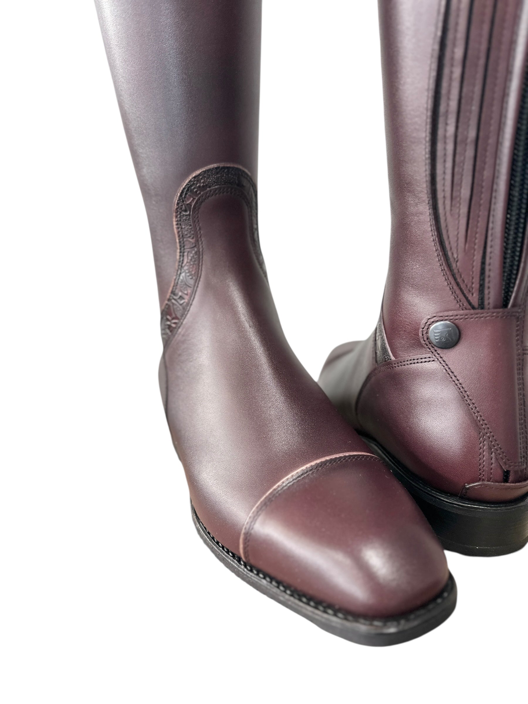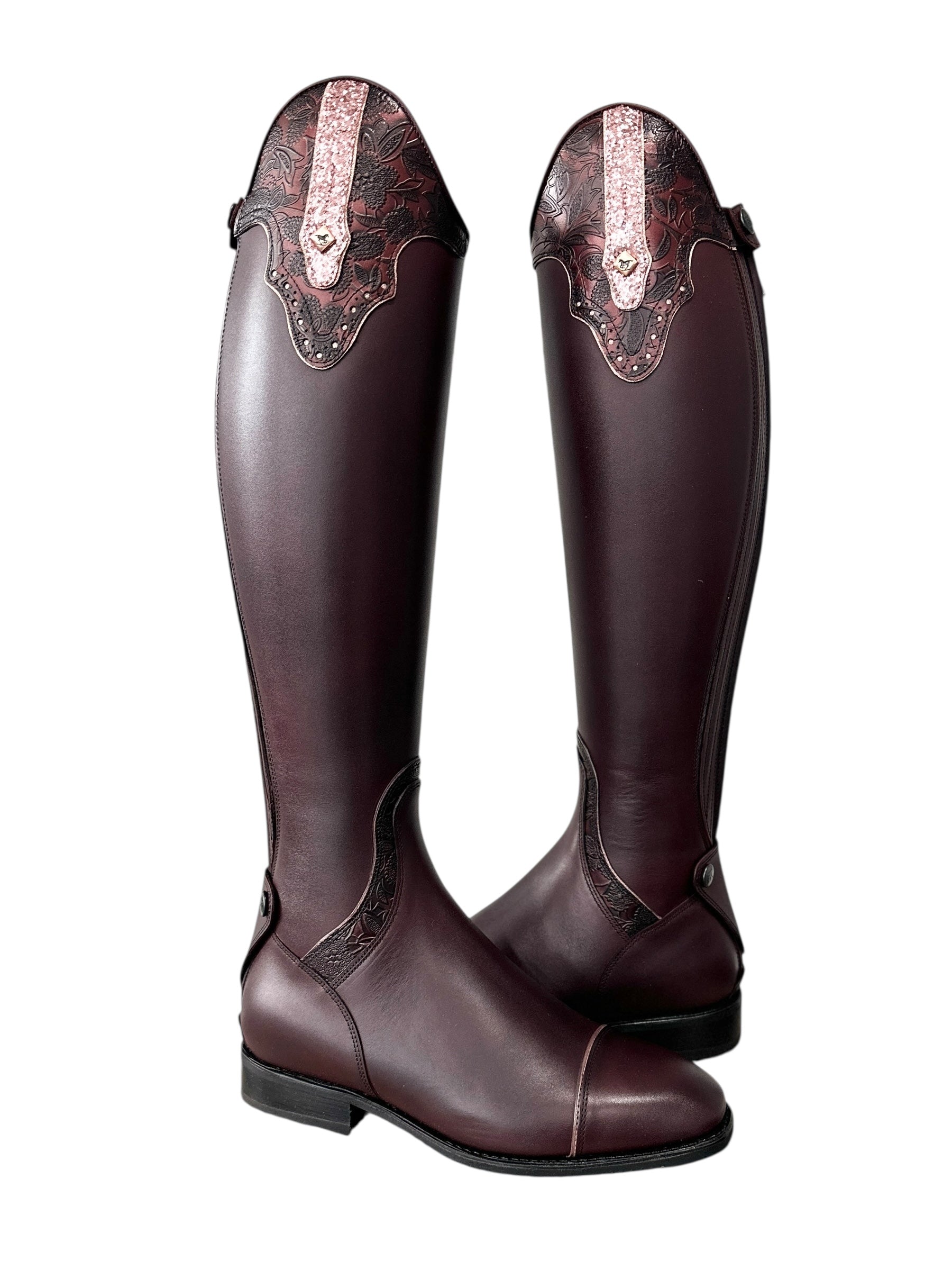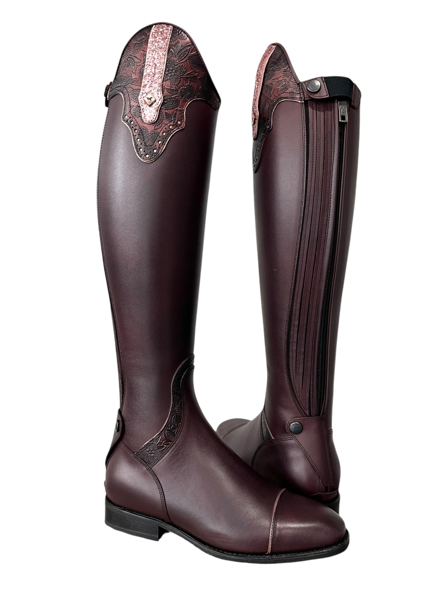 Description: Vintage mosto base, G5 America top in greta burgundy with tab in gala rose gold and luxory rose gold piping, frame around instep in greta brugundy with luxory rose gold piping, E3 toecap with luxory rose gold piping, elastic along zipper covered in vintage mosto, rose gold logo, and black sole.