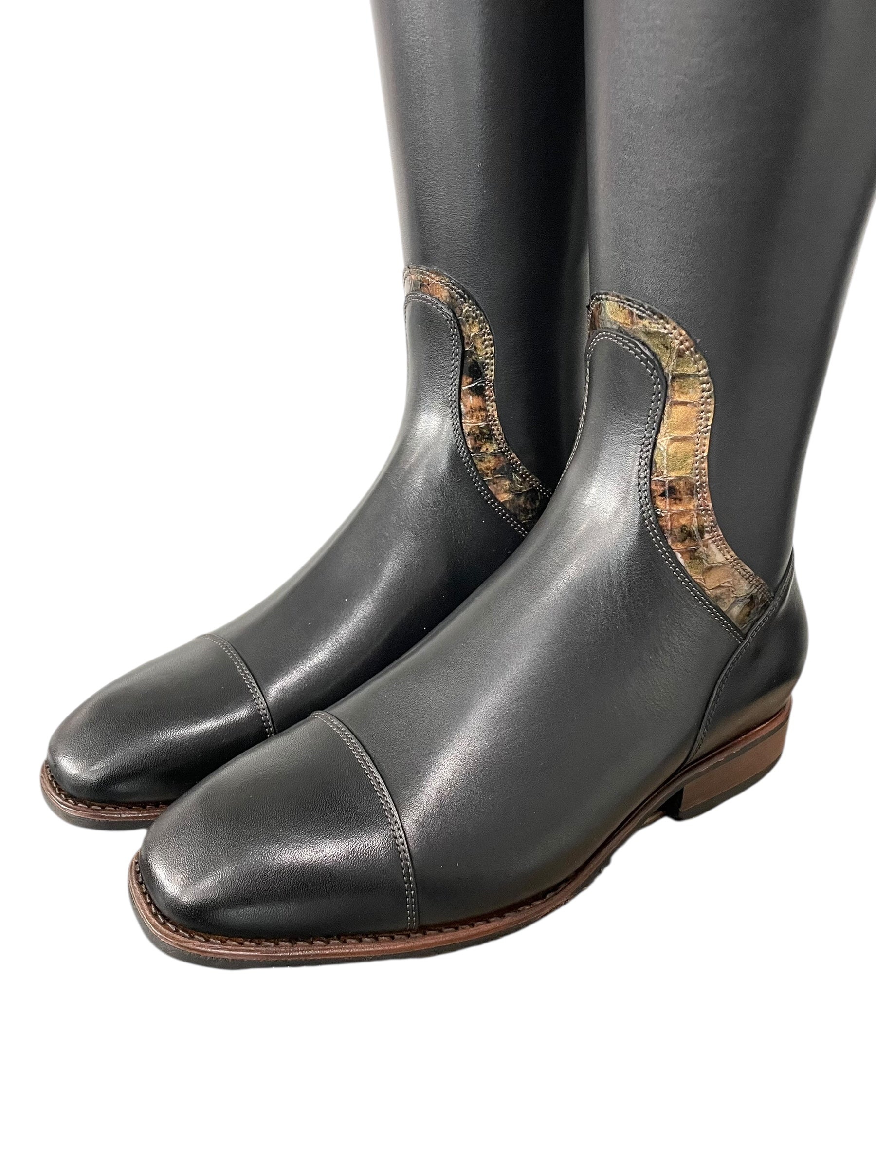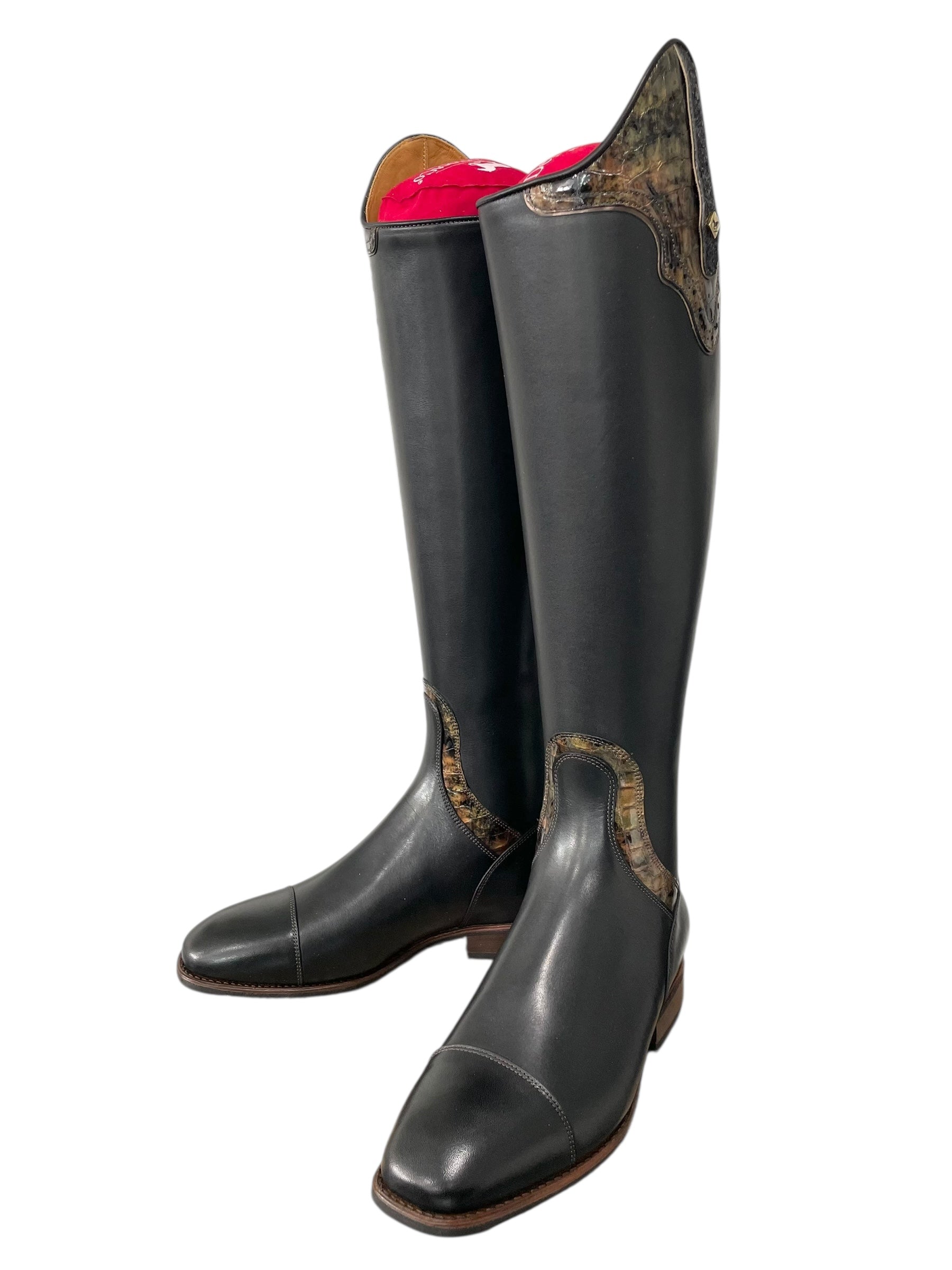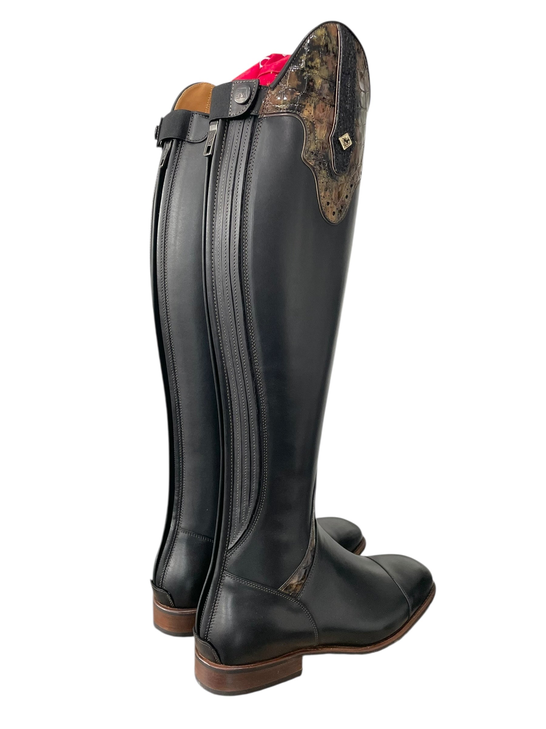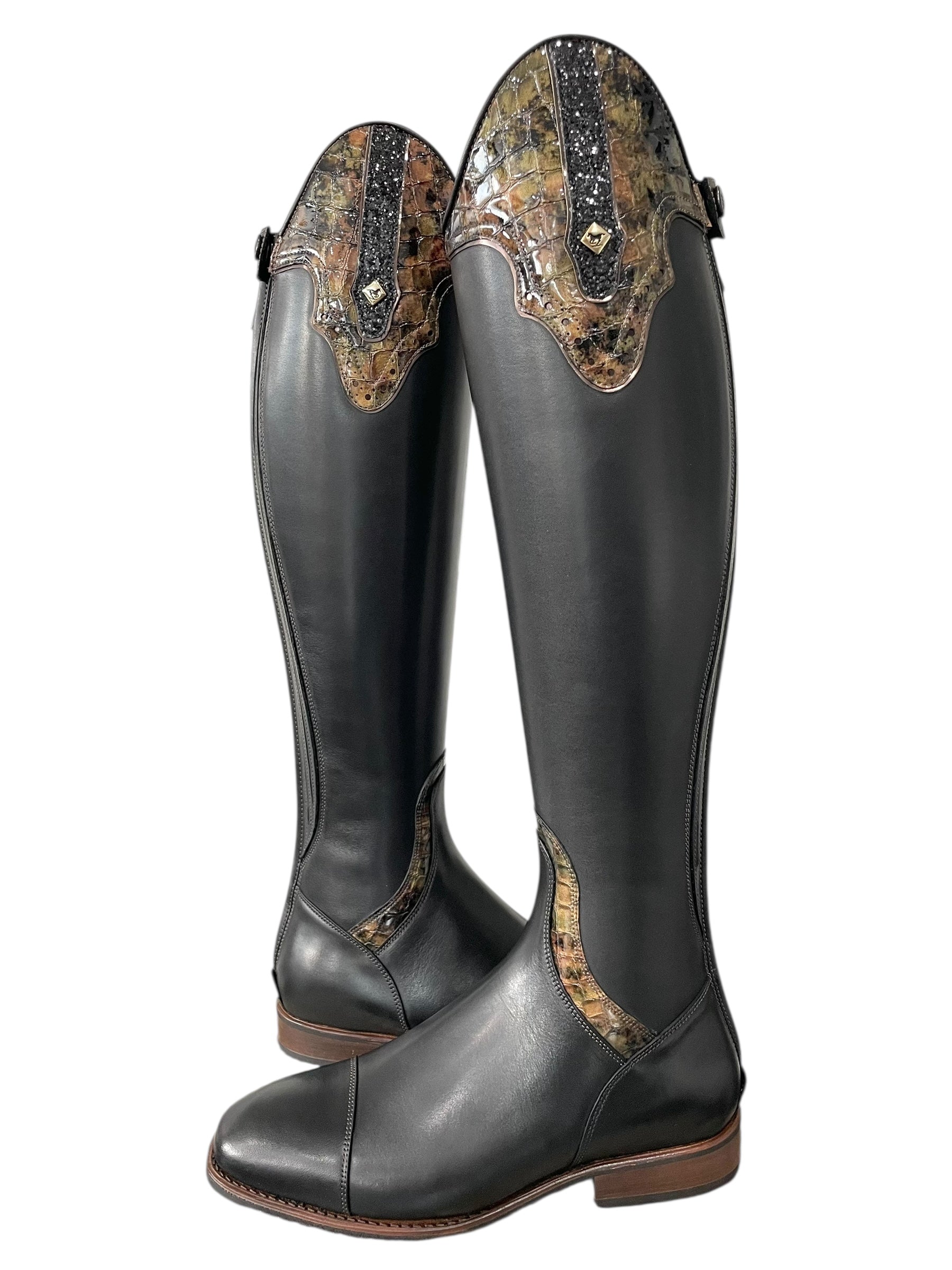 Description: WRAT black base, G5 America top lucido sfumato oro with gala black sidestrap and specchio bronzo piping, lucido sfumato oro frame around the instep, brown stitching, gold logo, and brown outsole.