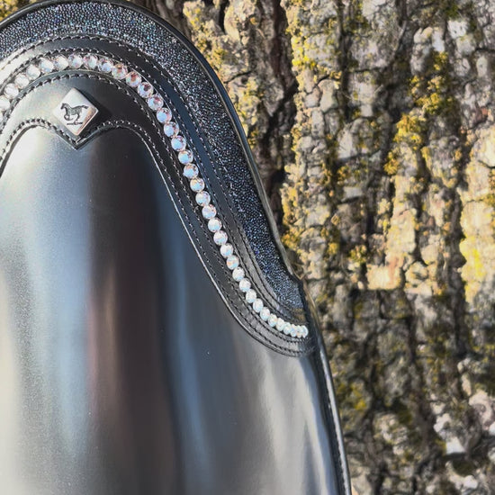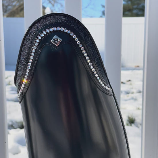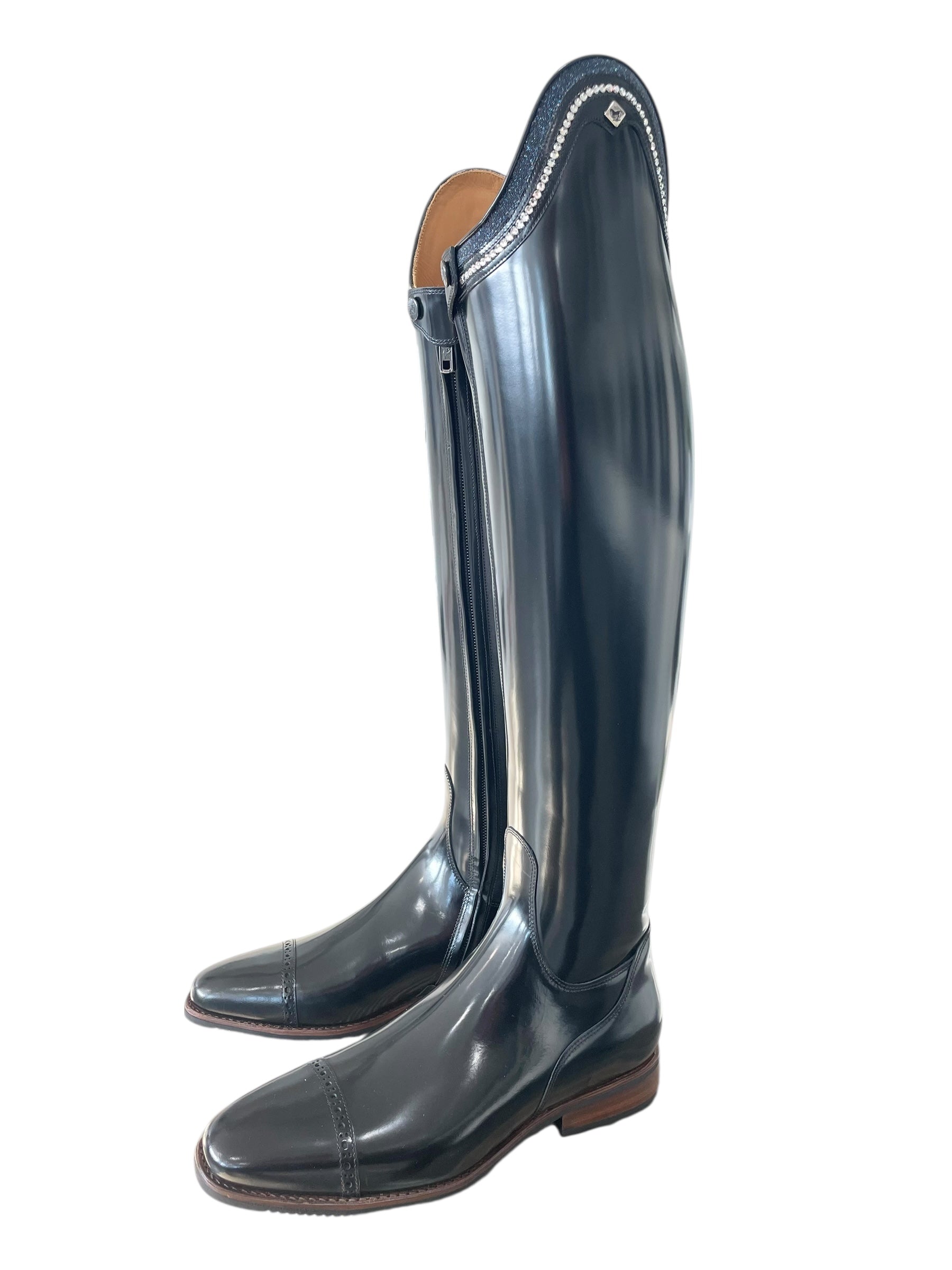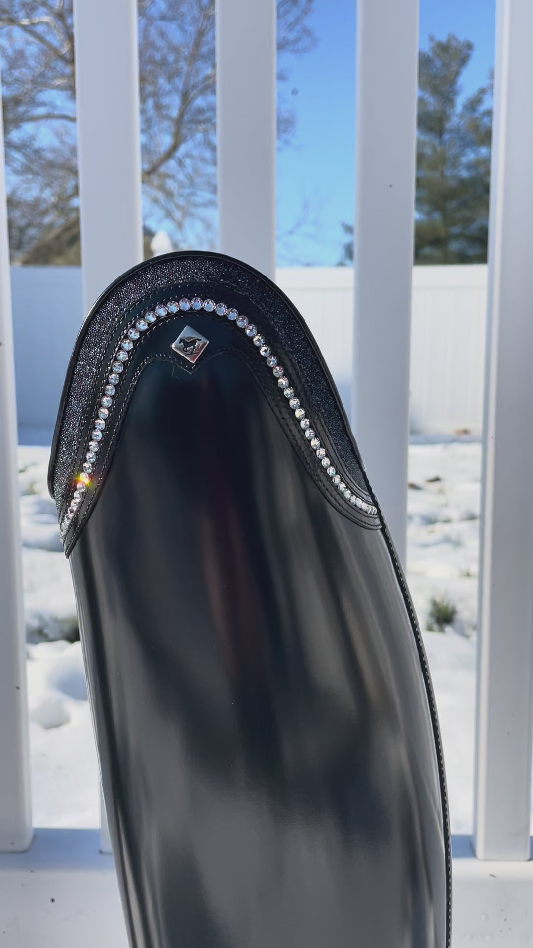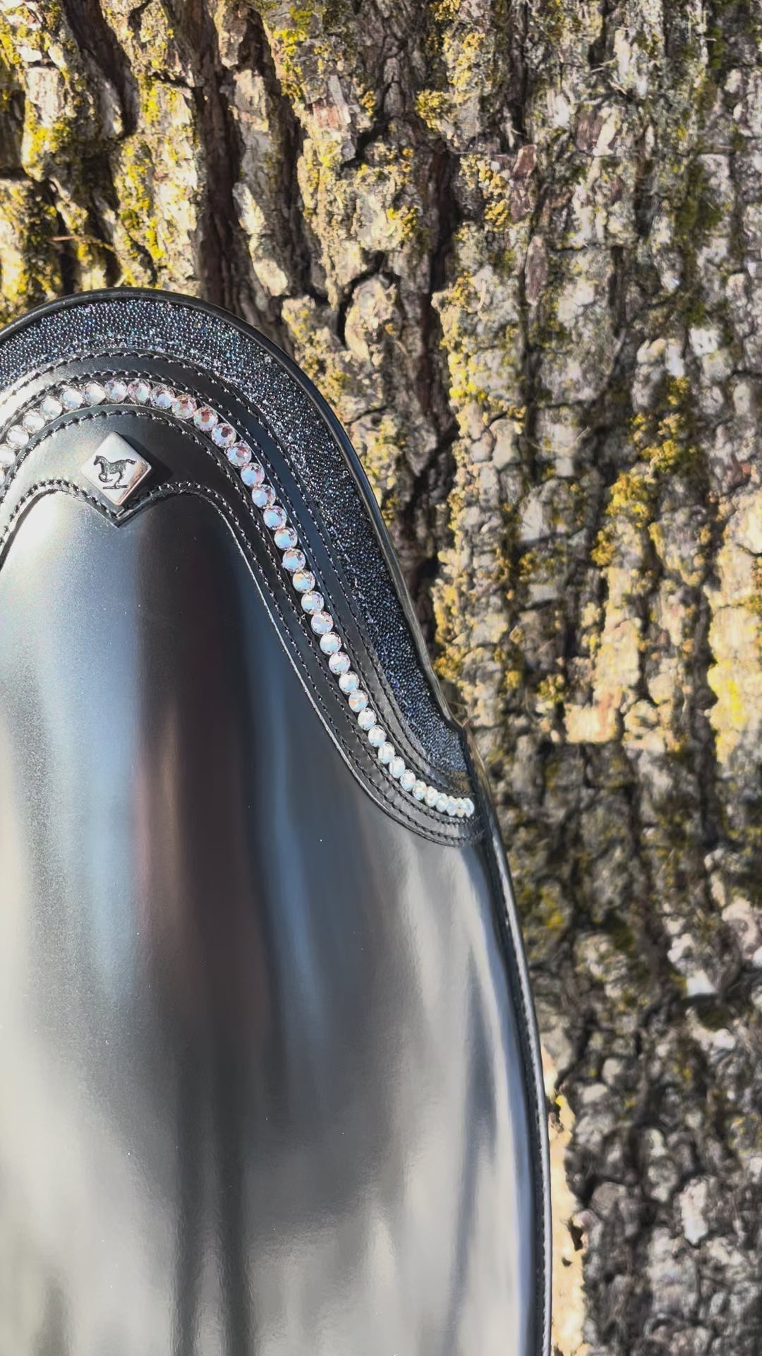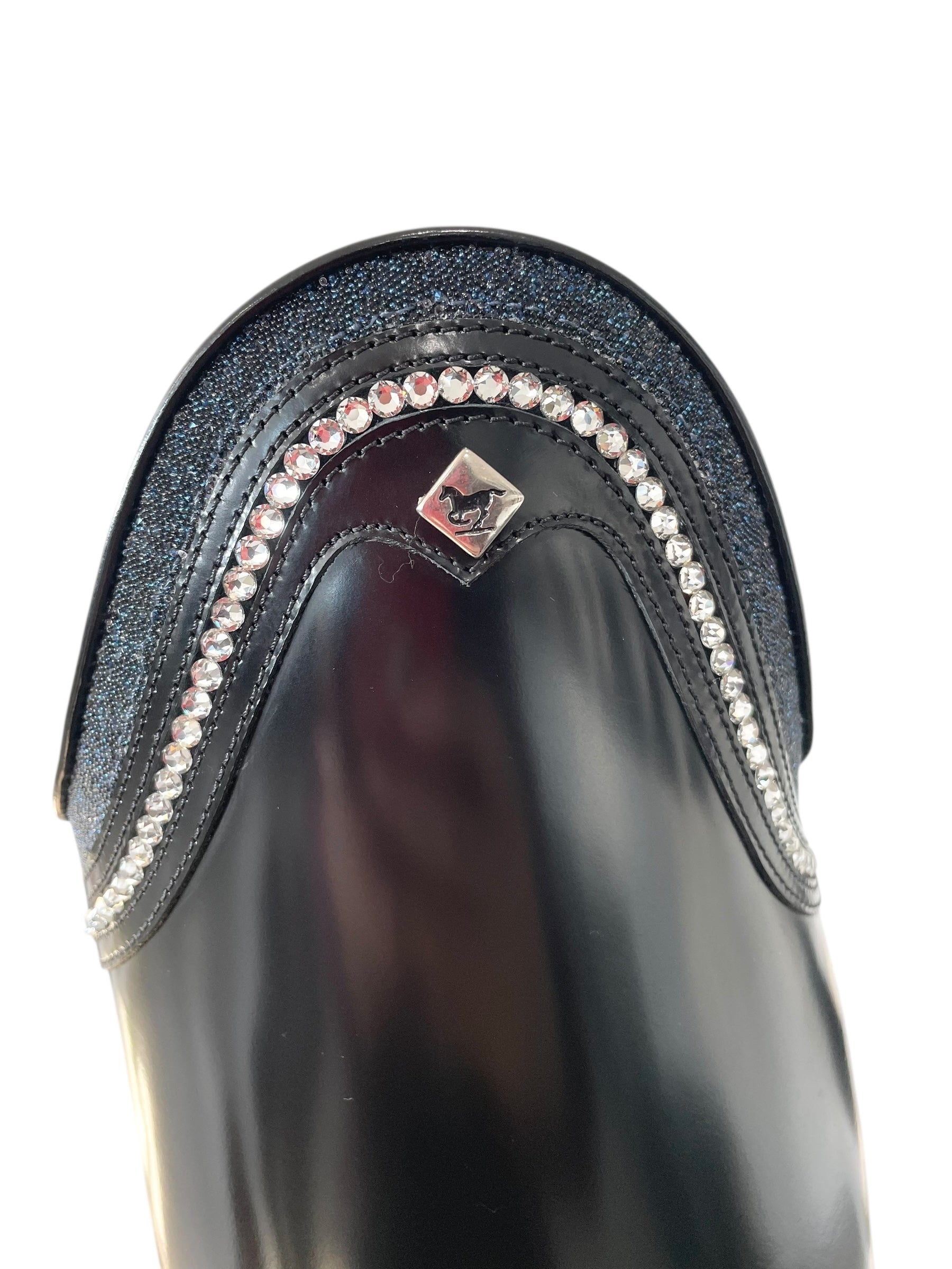 Description: Brushed black base, top in fabric SW mol blue with frame in brushed black and channel of GGS79 clear crystals, E5 toecap with brogues, silver logo, and brown sole.
