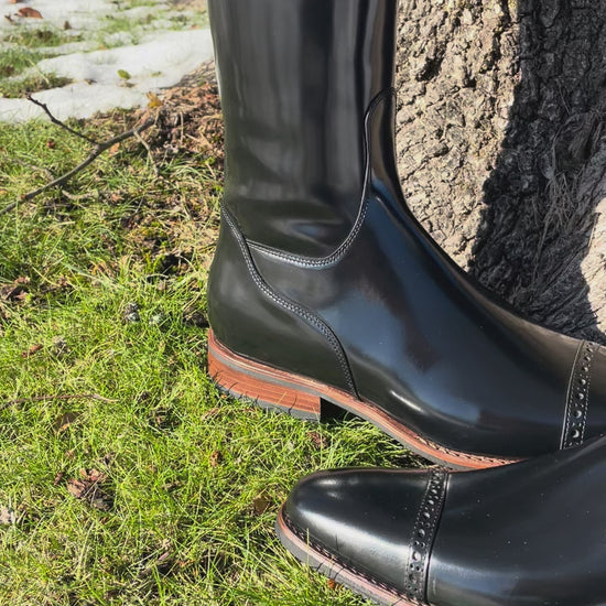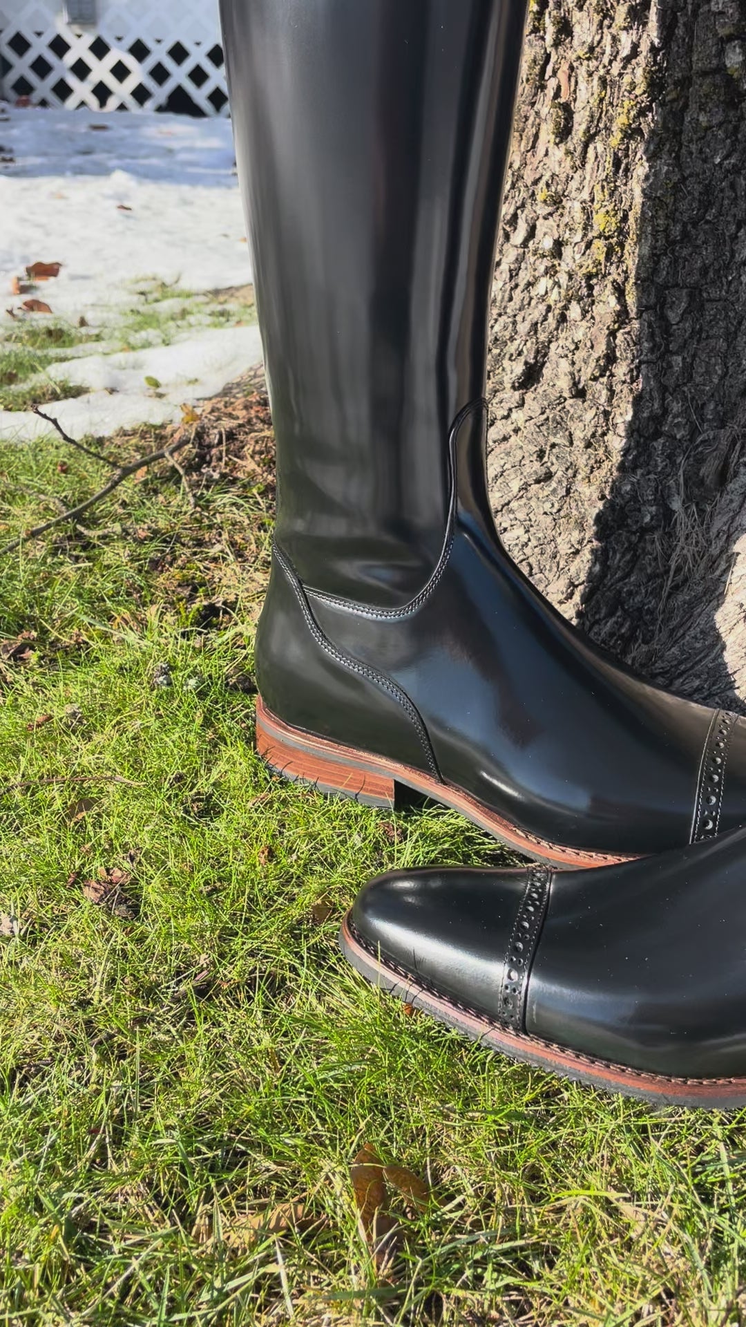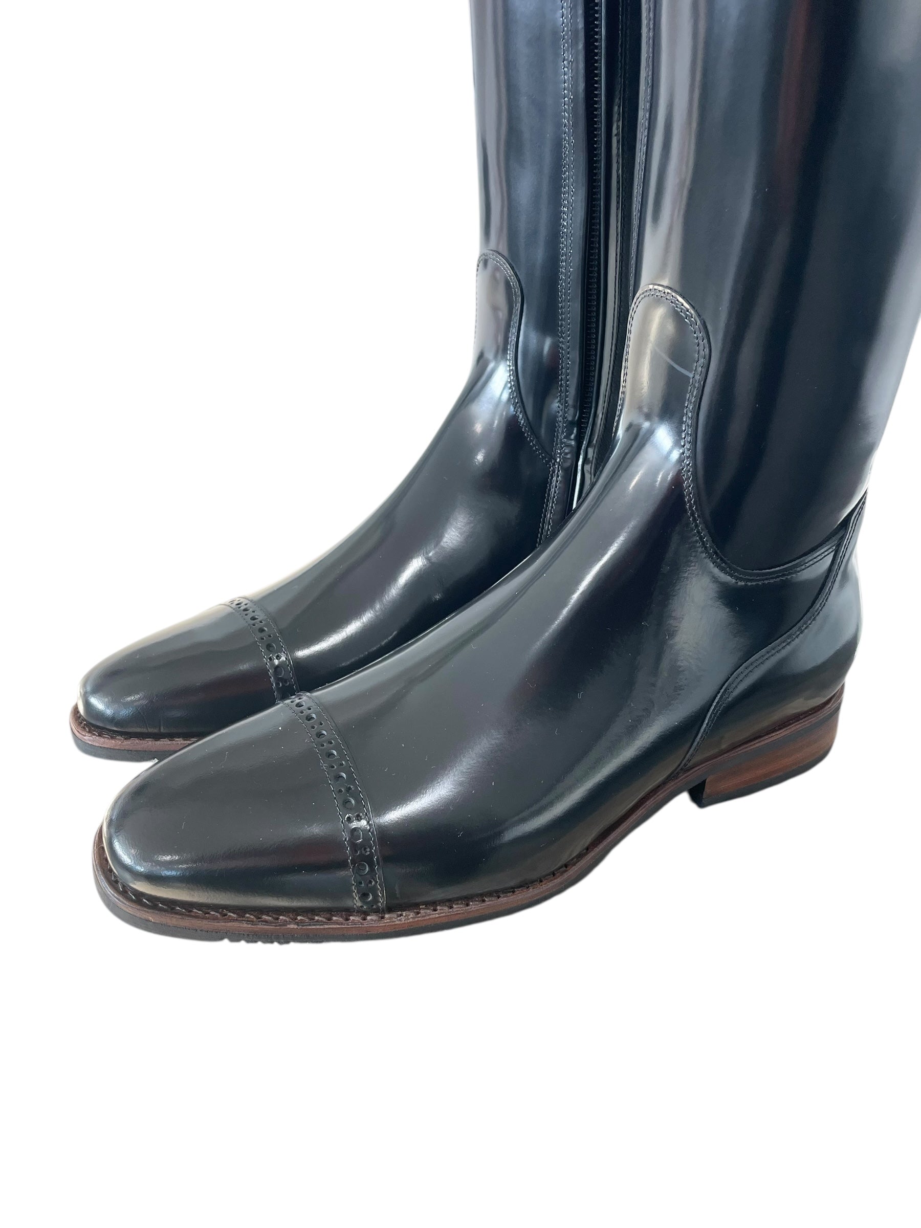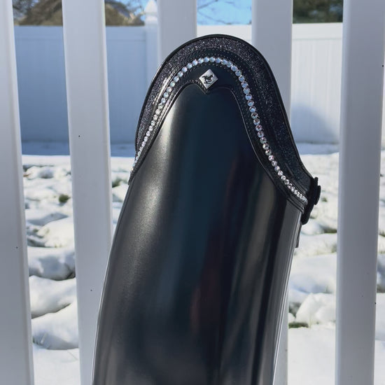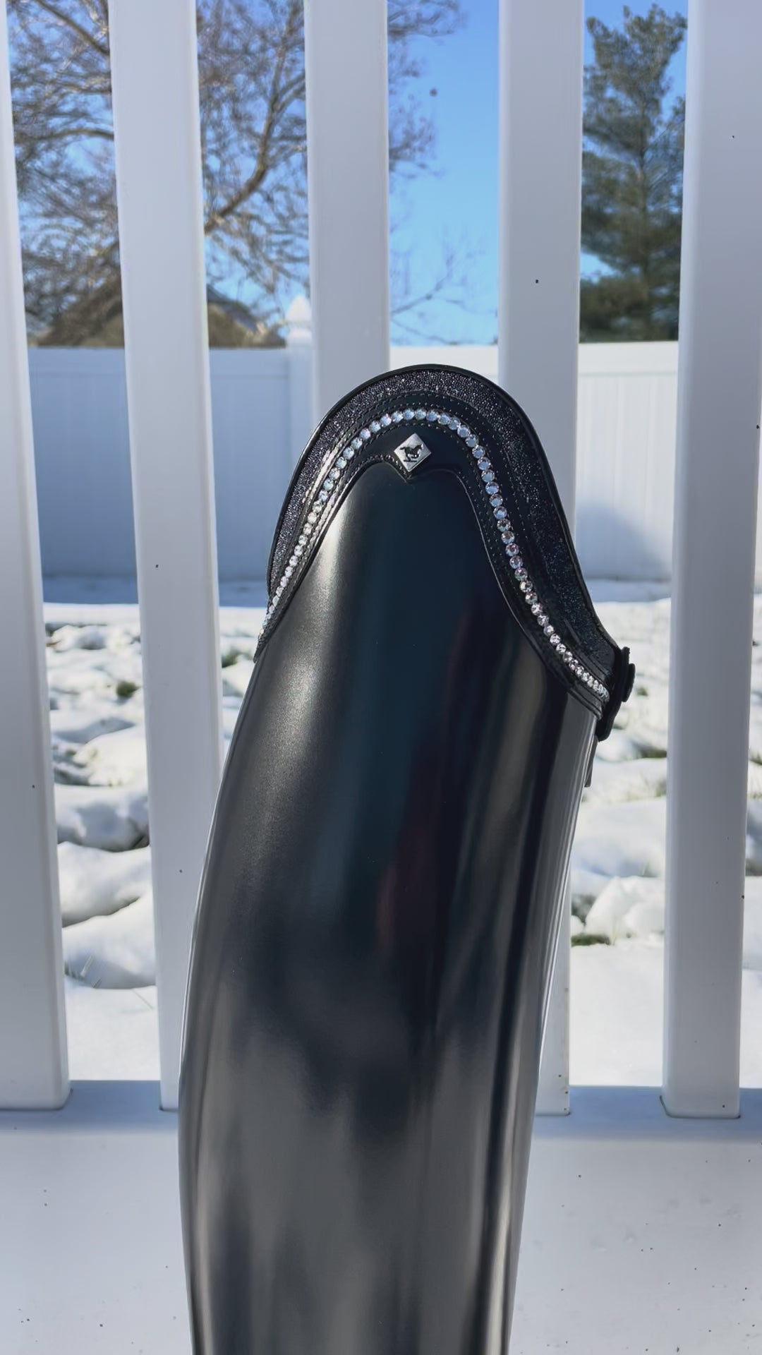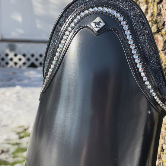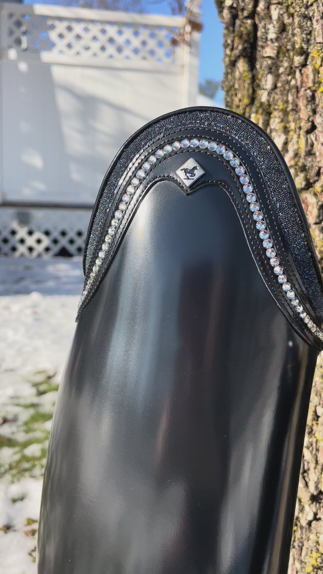 Description: Brushed black base, top in fabric SW mol blue with frame in brushed black and channel of GGS79 clear crystals, E5 toecap with brogues, silver logo, and brown sole.