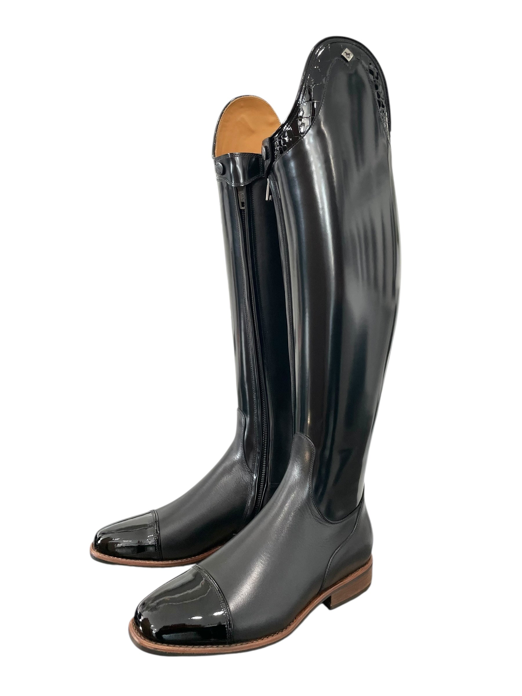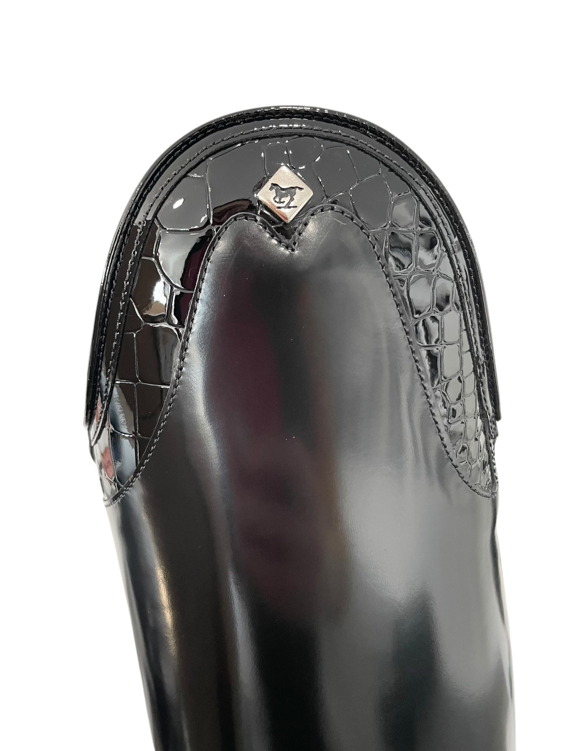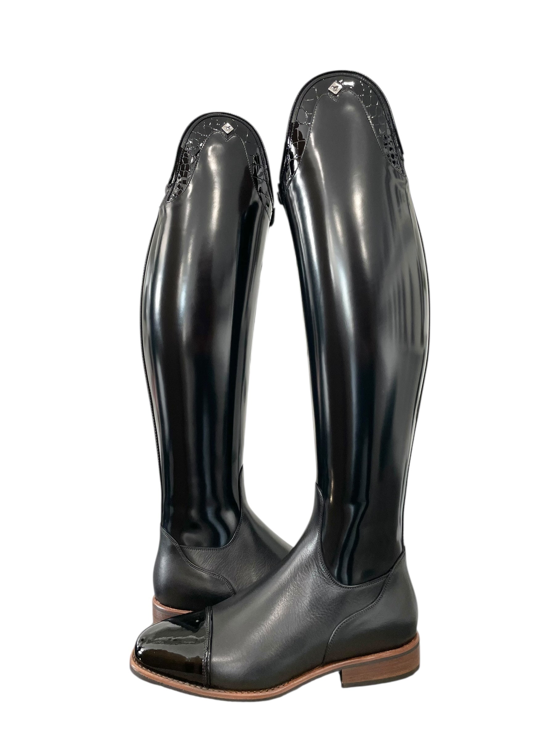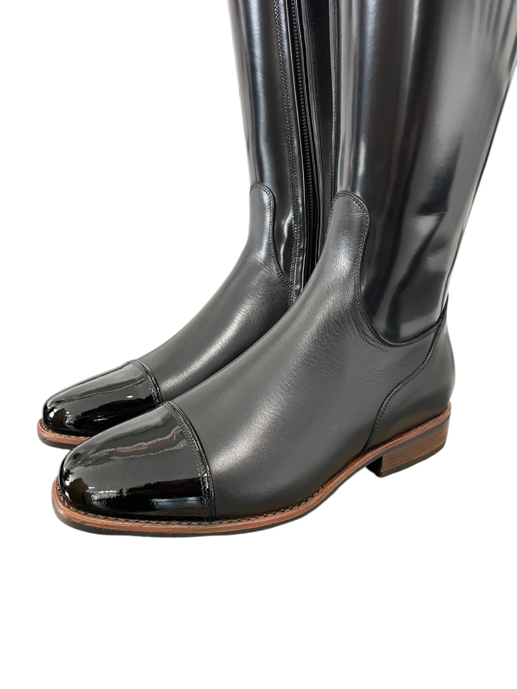 Description: Brushed black base with WRAT black instep and heel, G24 Rondine W top in patent cocco nero (big section) with patent black (small strip) and patent black piping, E2 toecap in patent black with patent black piping, Q13 comfort knee, silver logo, and brown sole.