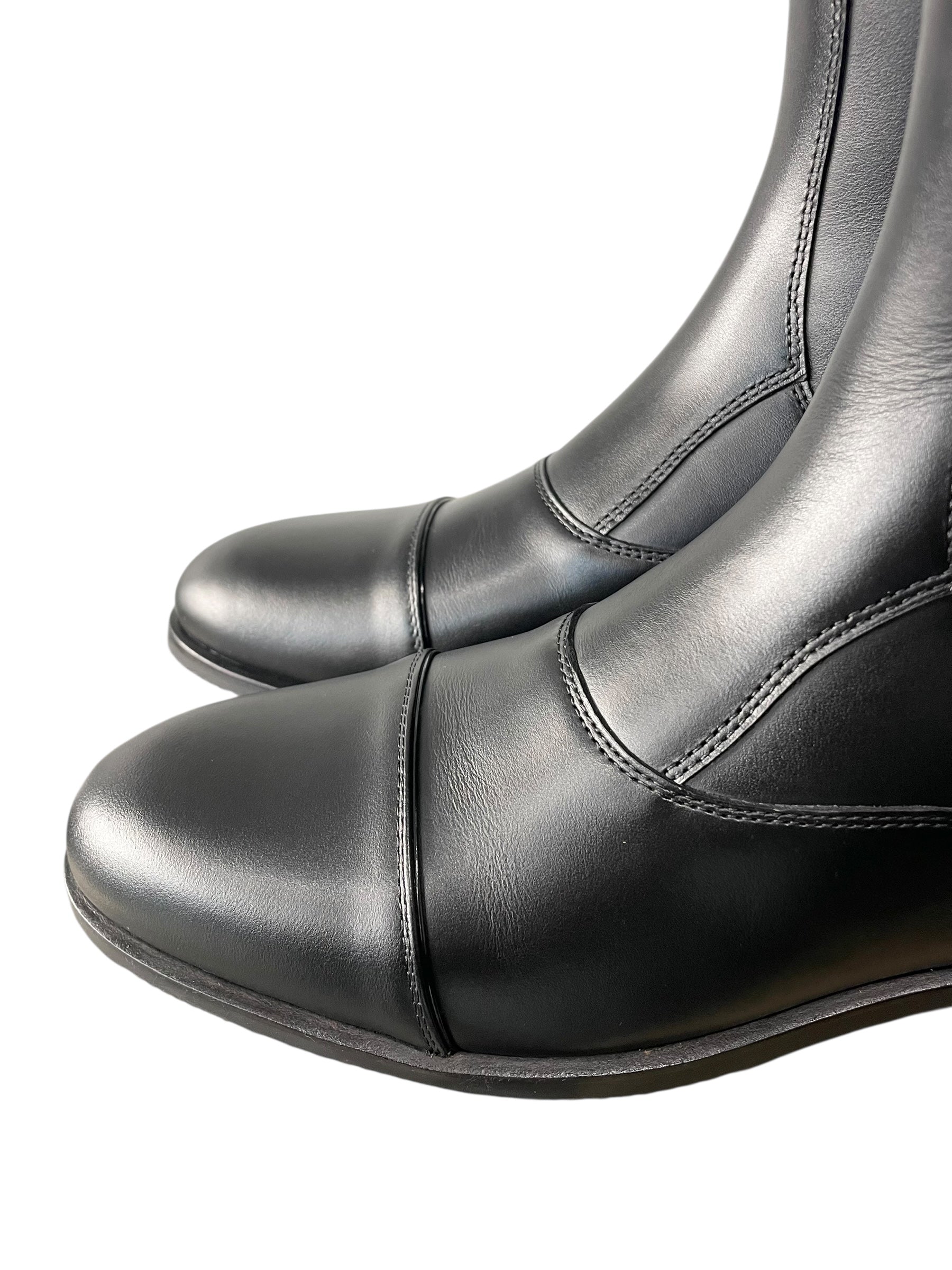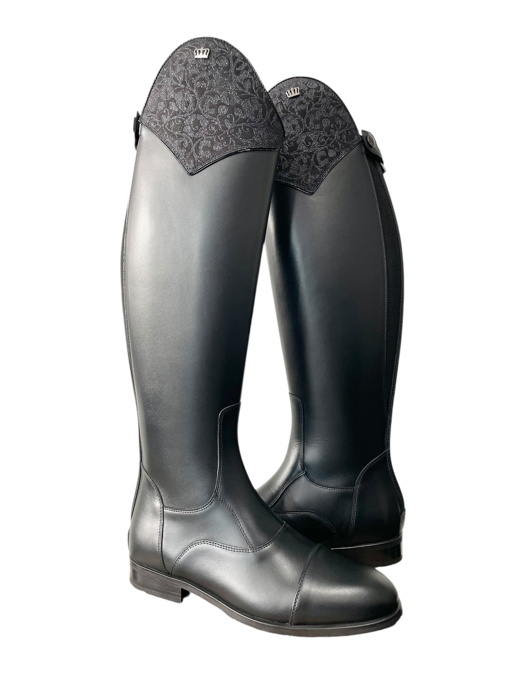 Description: Aspen black base, Aspen special top in elba with roma blac top piping, toecap with roma black piping, black elastic, silver logo crown, and black sole.