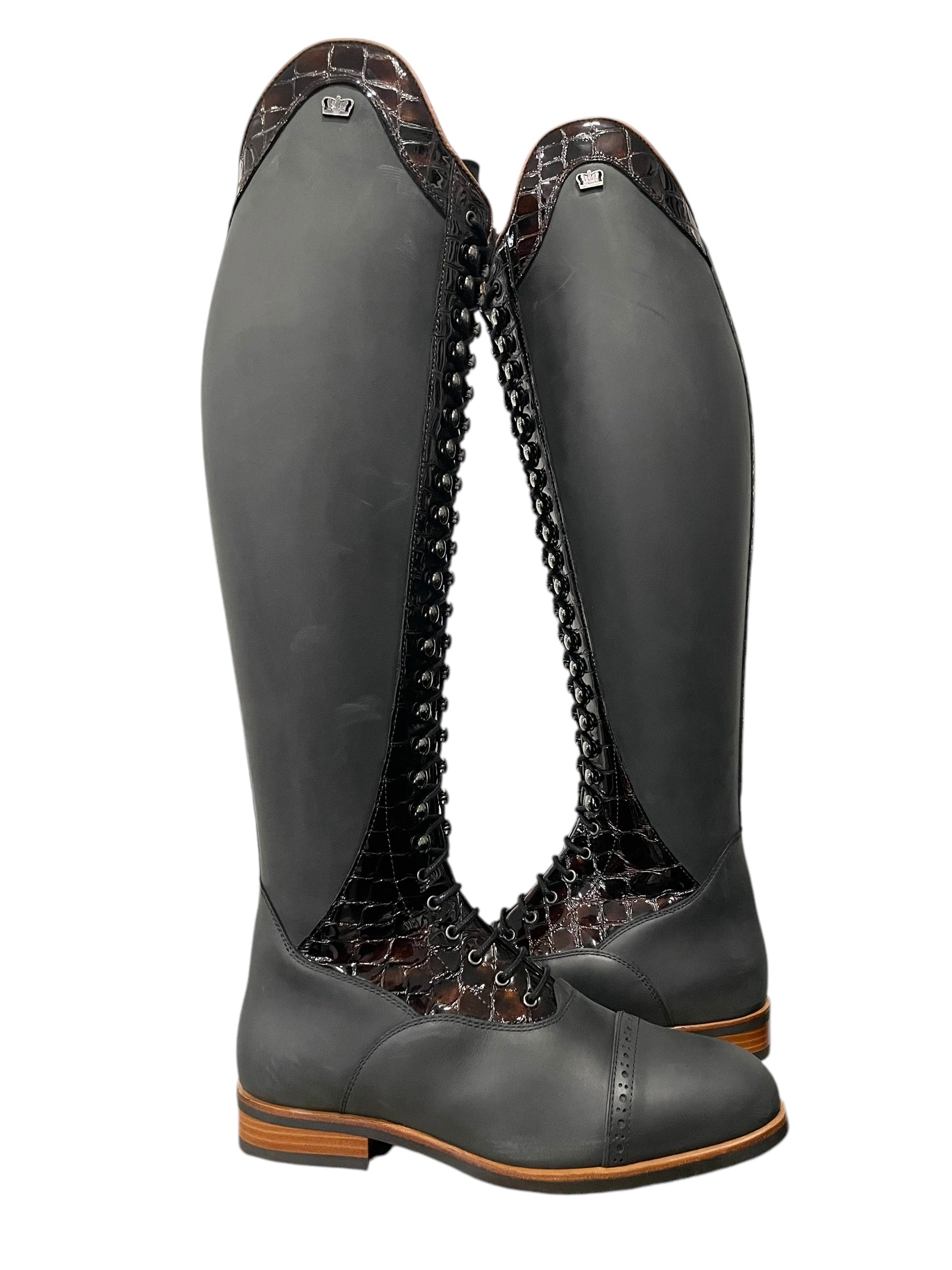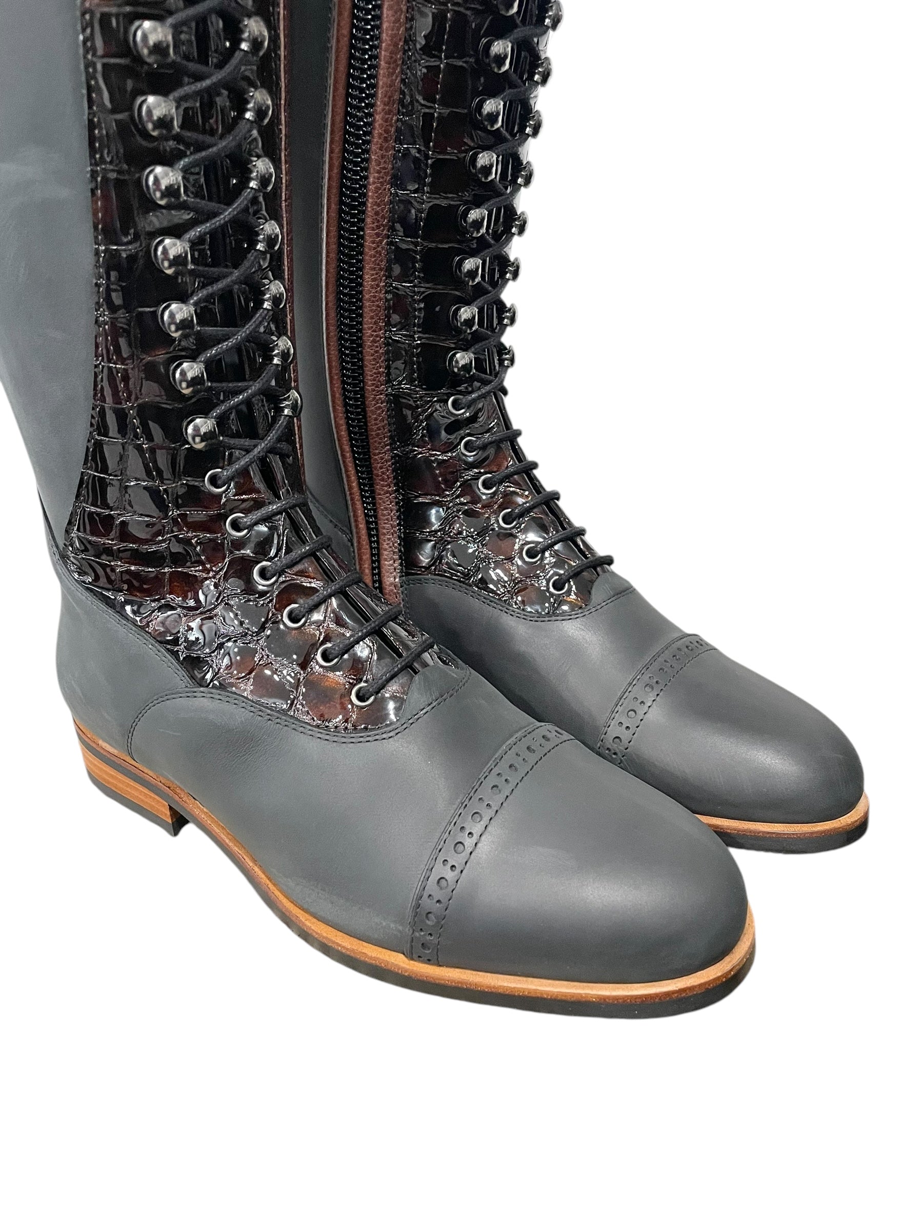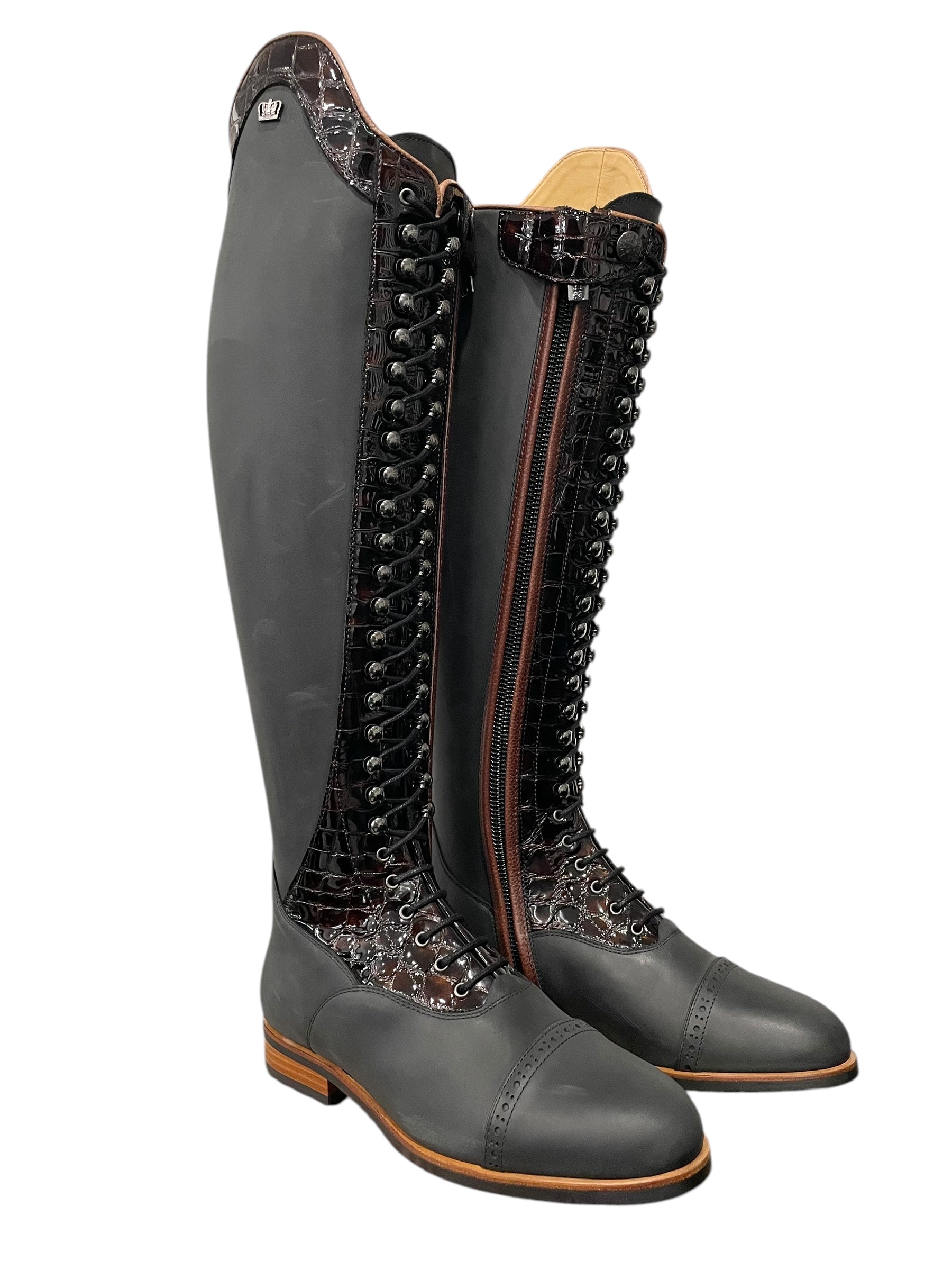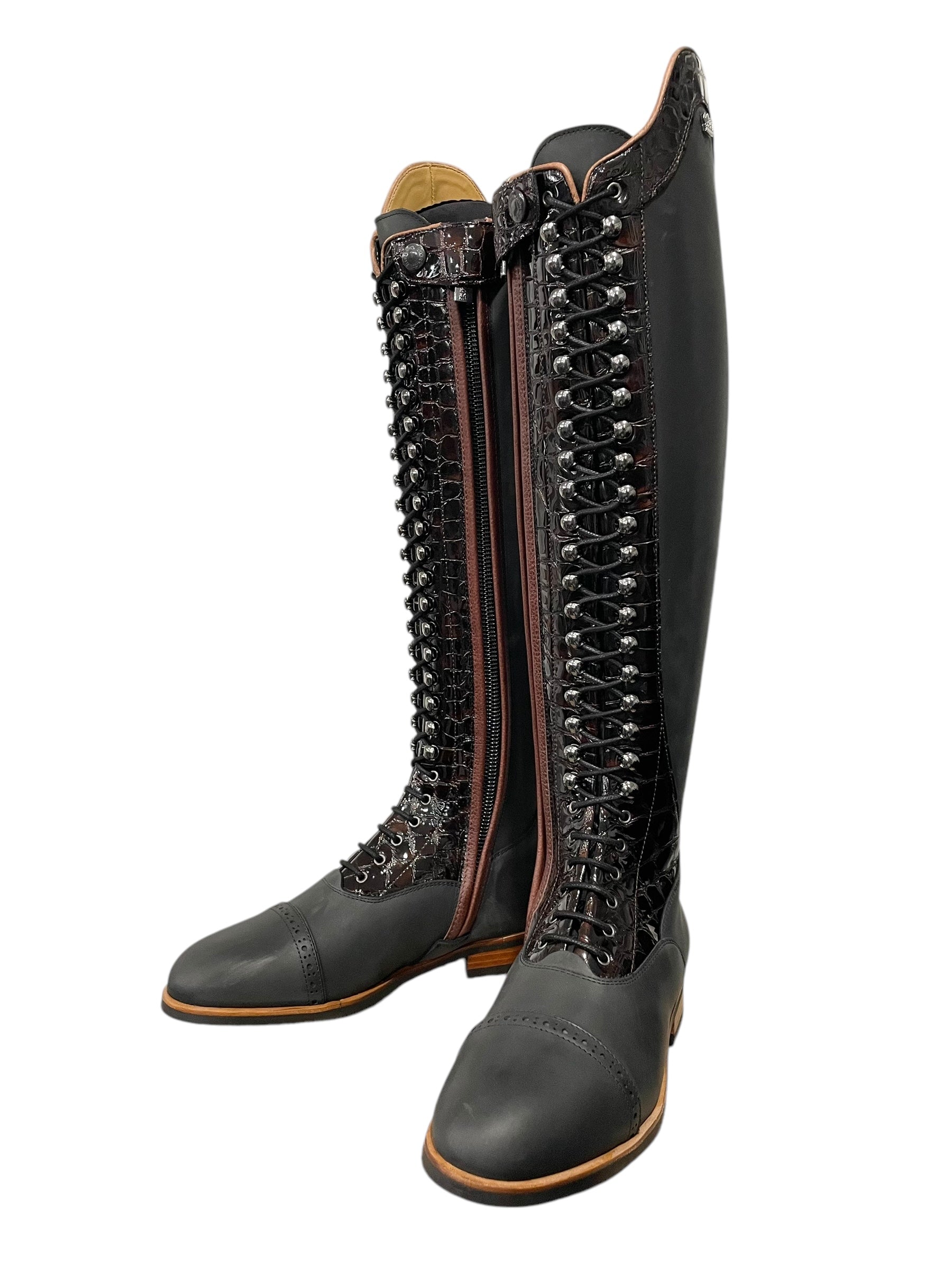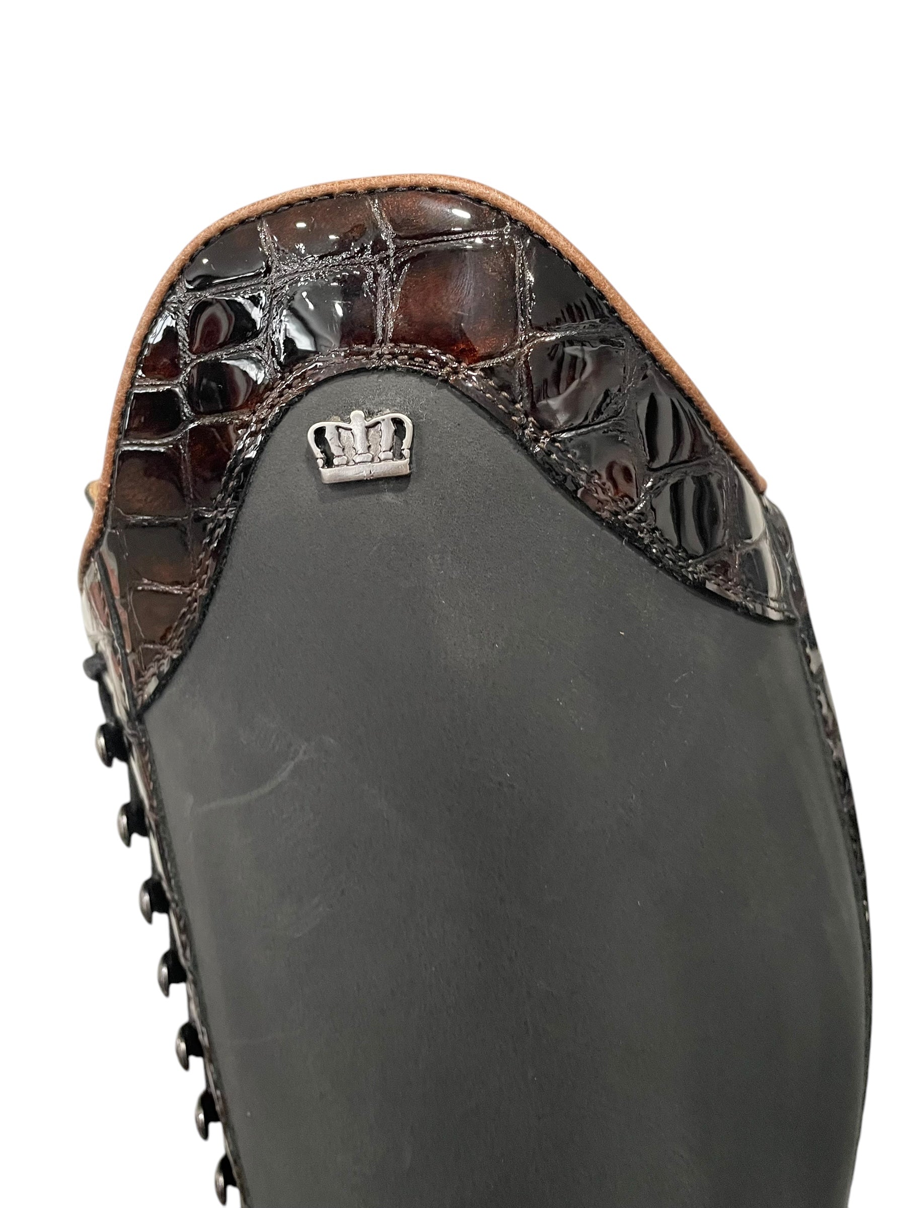 Description: Gaucho black base, Jenny top in croco bril castanho with paxson camel piping, zip protector and instep in croco bril castanho, paxson cedar parts along the zipper, polished black logo crown and hooks, black laces, toecap with brogues, and brown outsole.