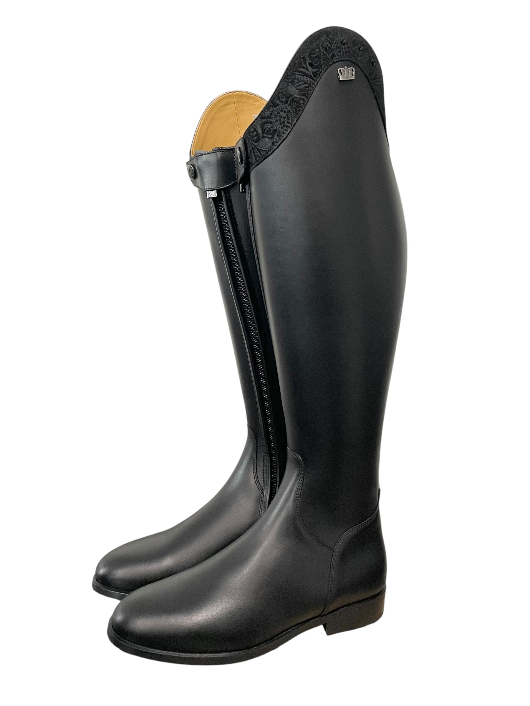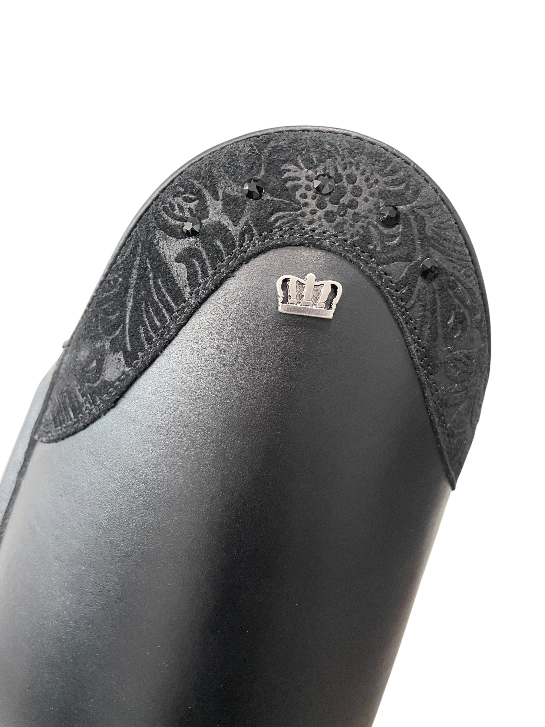 Description: Aspen black base, Jenny top in floral black with black Swarovski crystals, polished black logo crown, and black outsole.