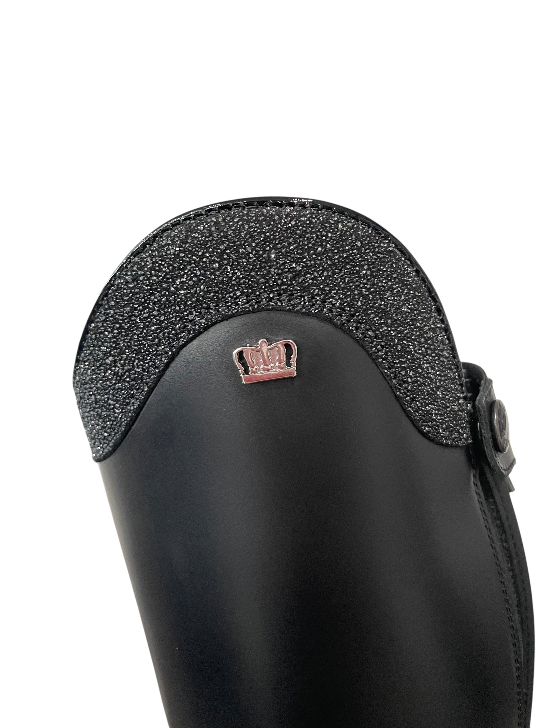 Description: Nature black base, Jenny top in stardust black with roma black piping, V gusset, black elastic along the shaft, silver logo crown, and black outsole.