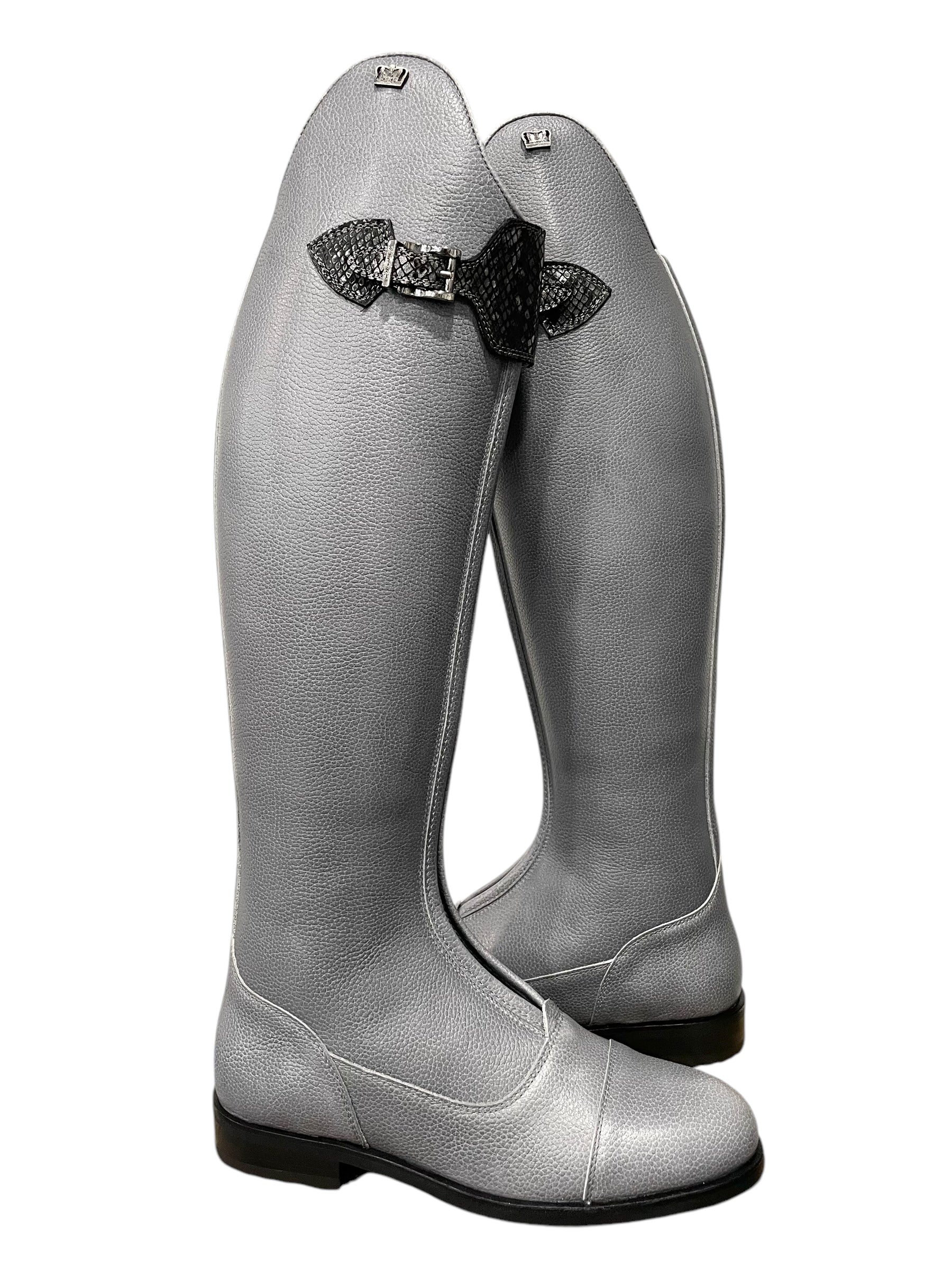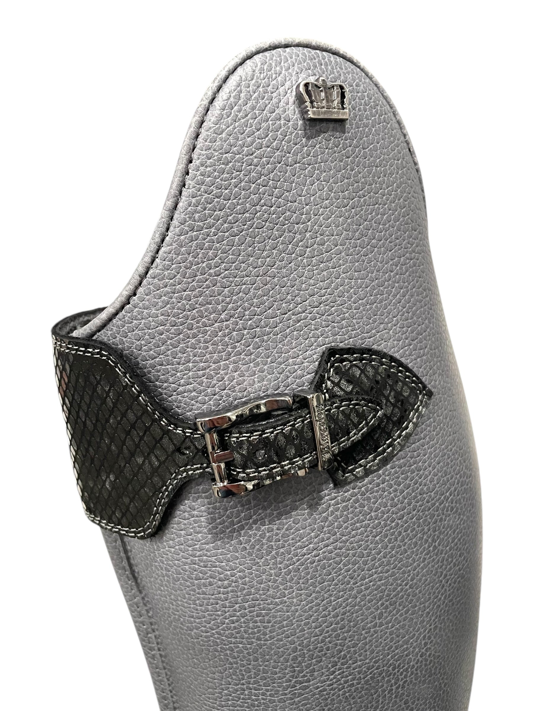 Description: Paxson grey base, top strap in python special grey, polished black logo crown and buckle, and black outsole.