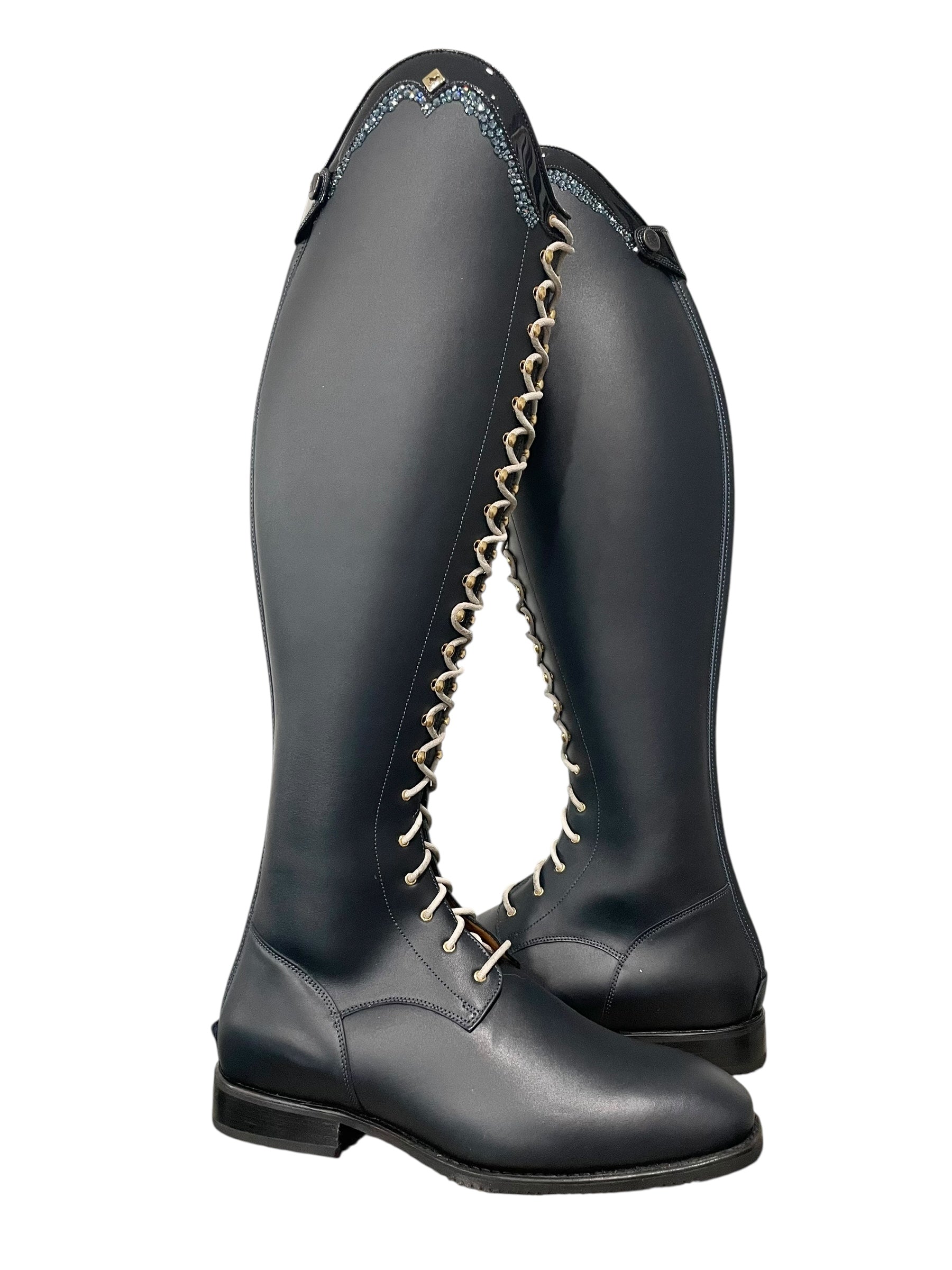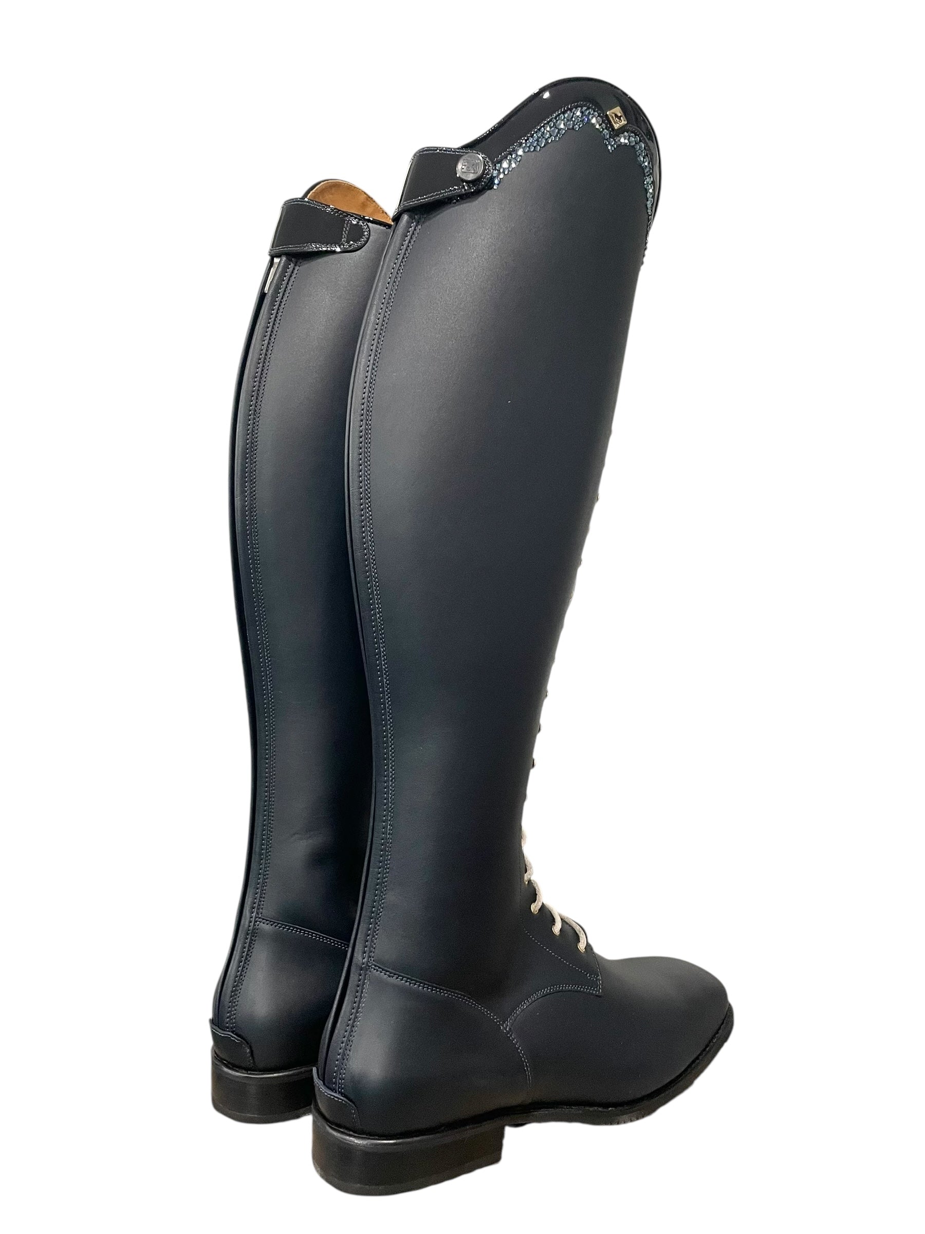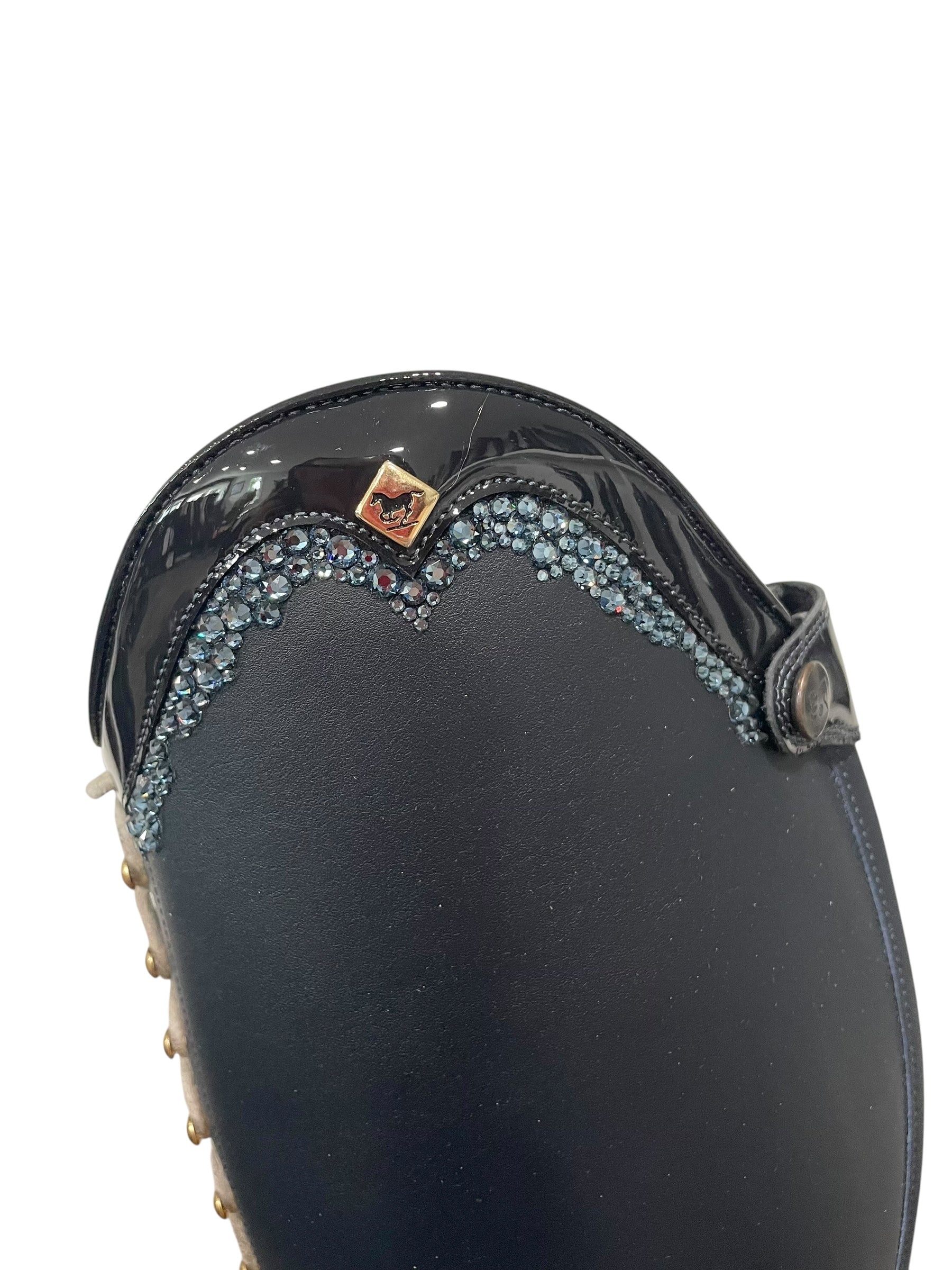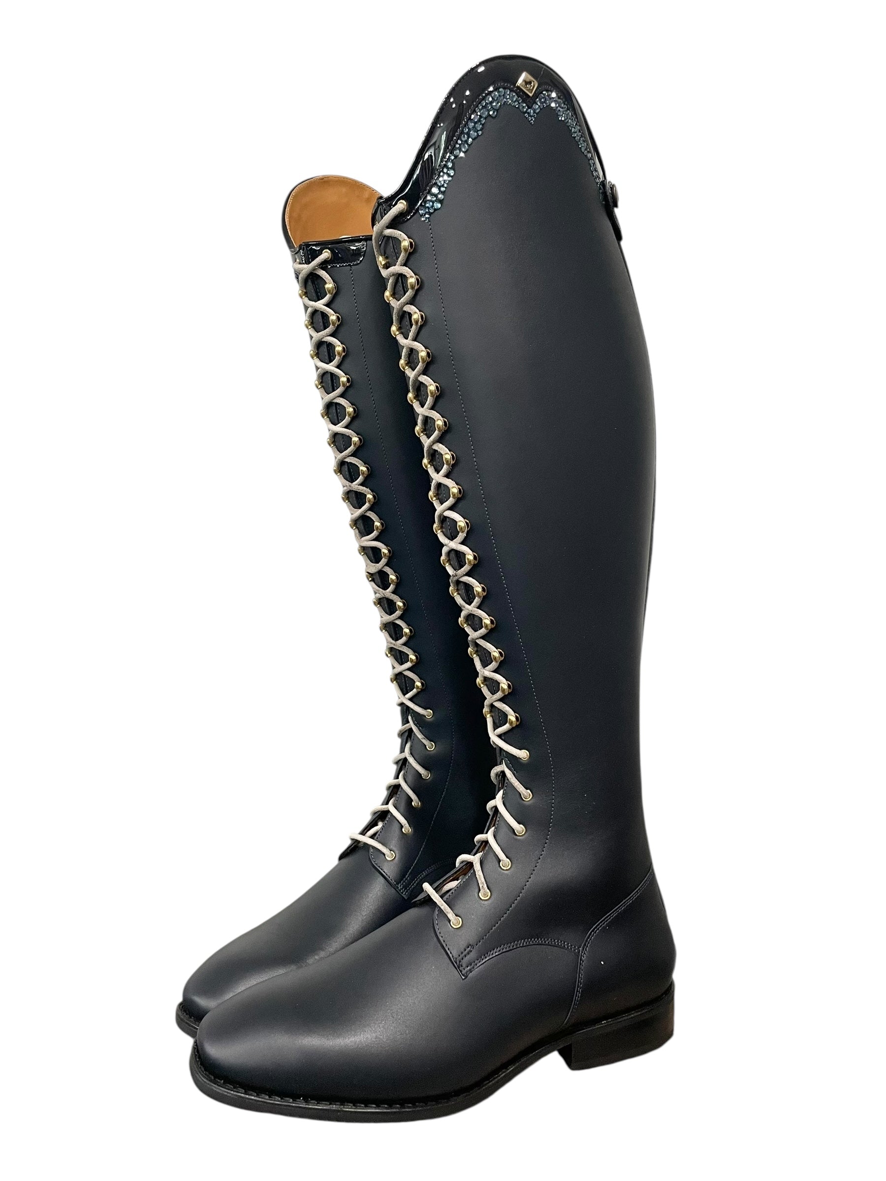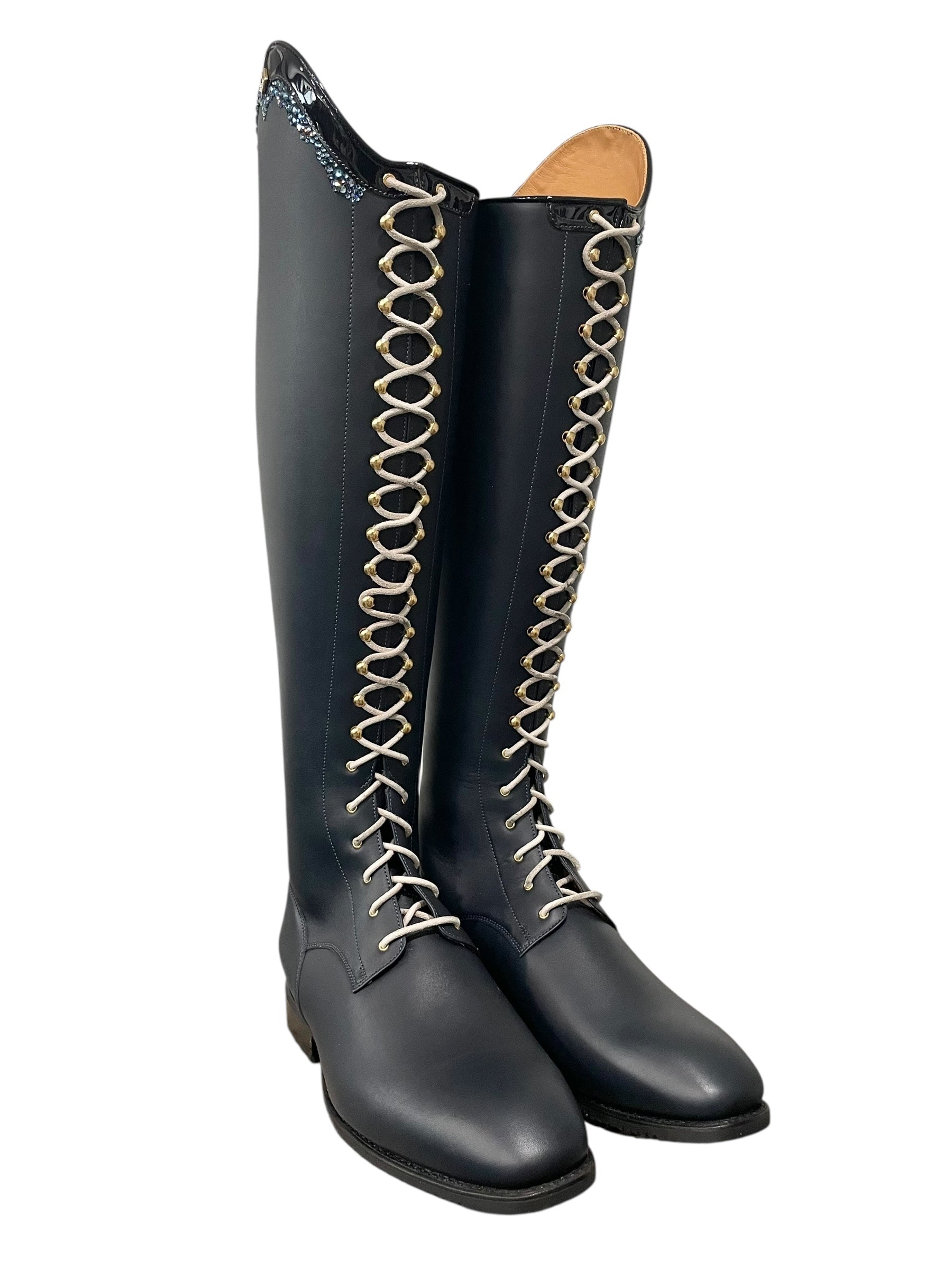 Description: WRAT indaco base, G9 Rondine top in patent navy with GGL83 denim blue Swarovski crystals, tan laces, gold logo and hooks, and black outsole.