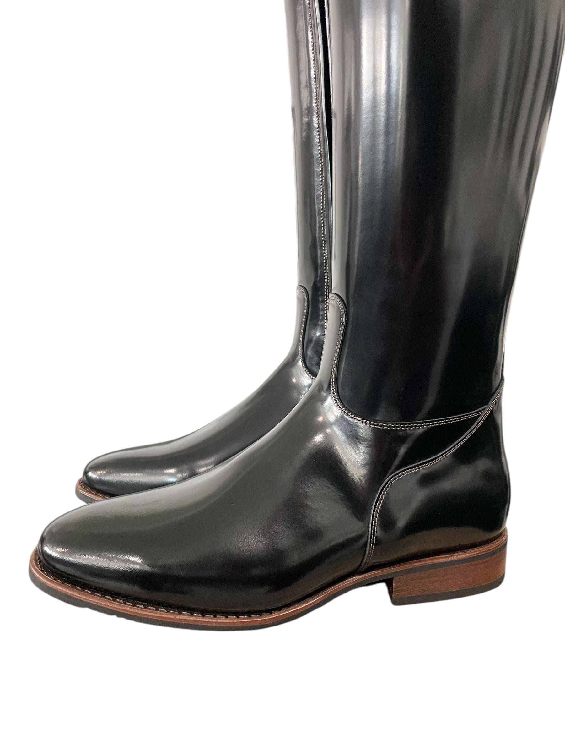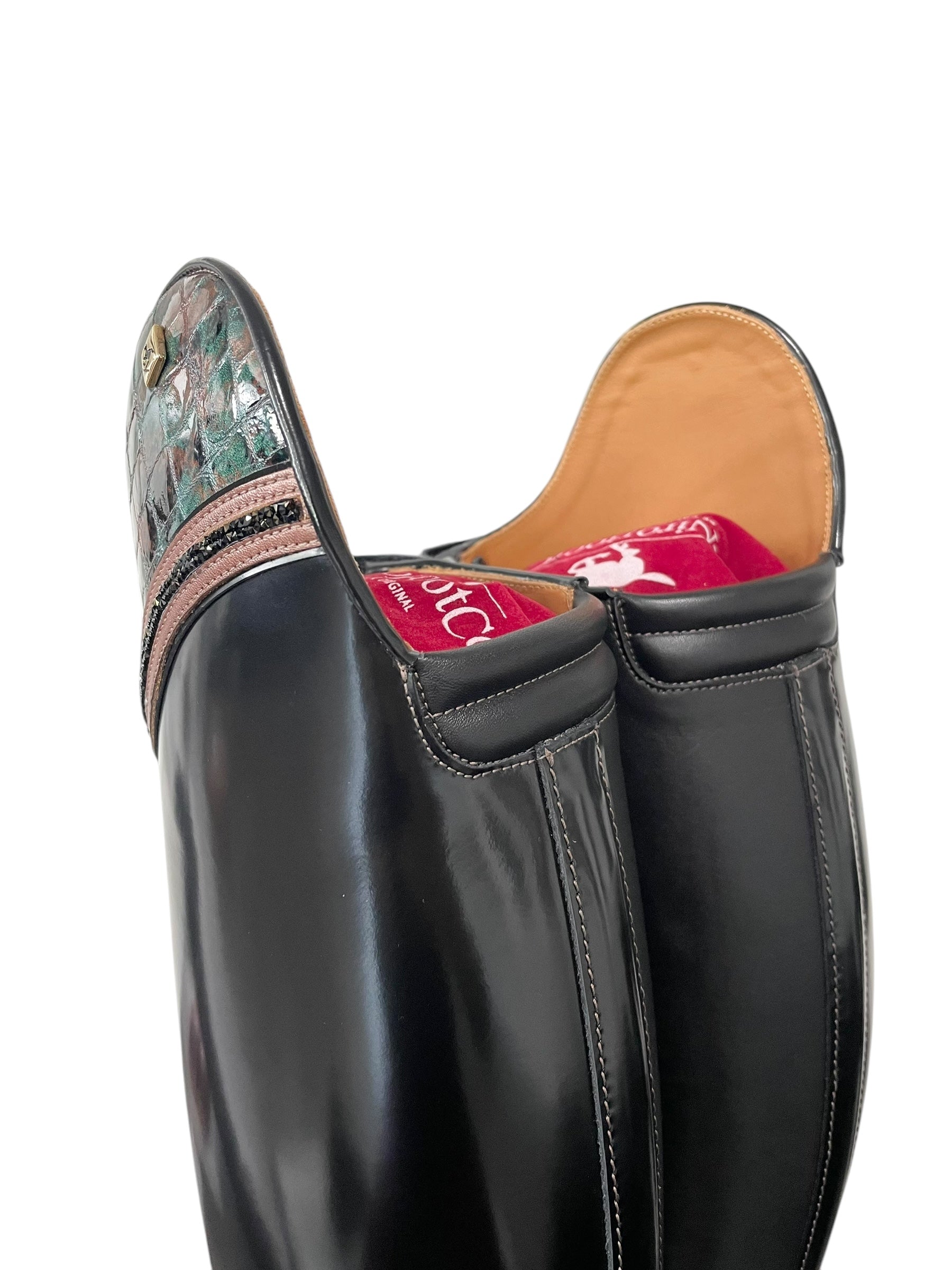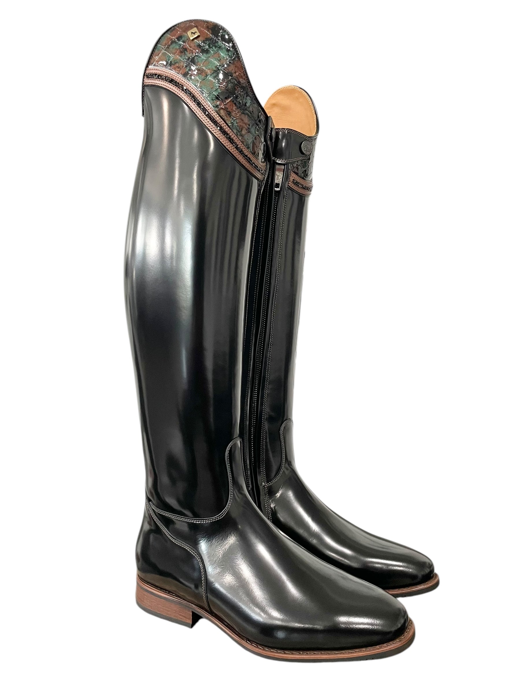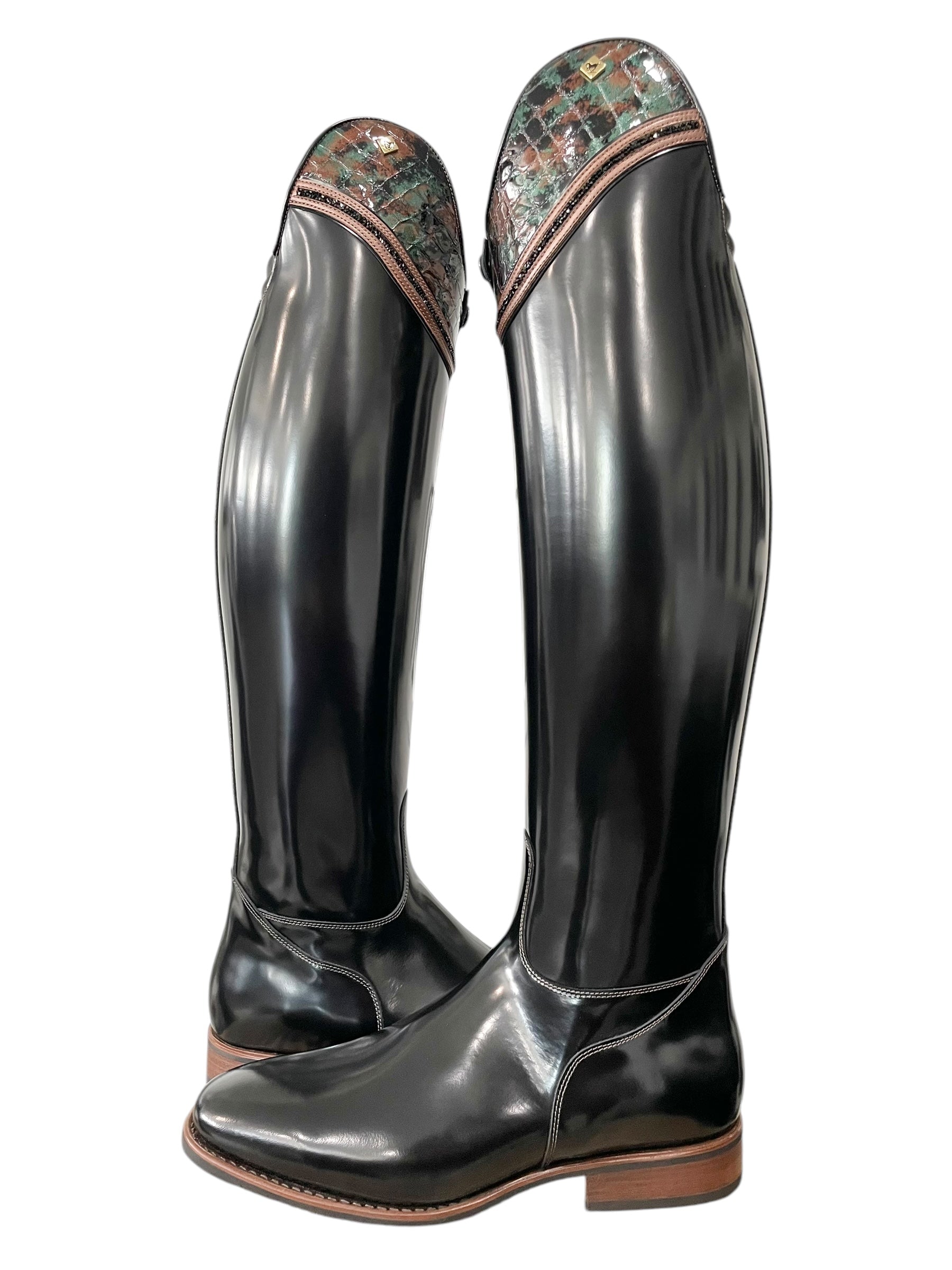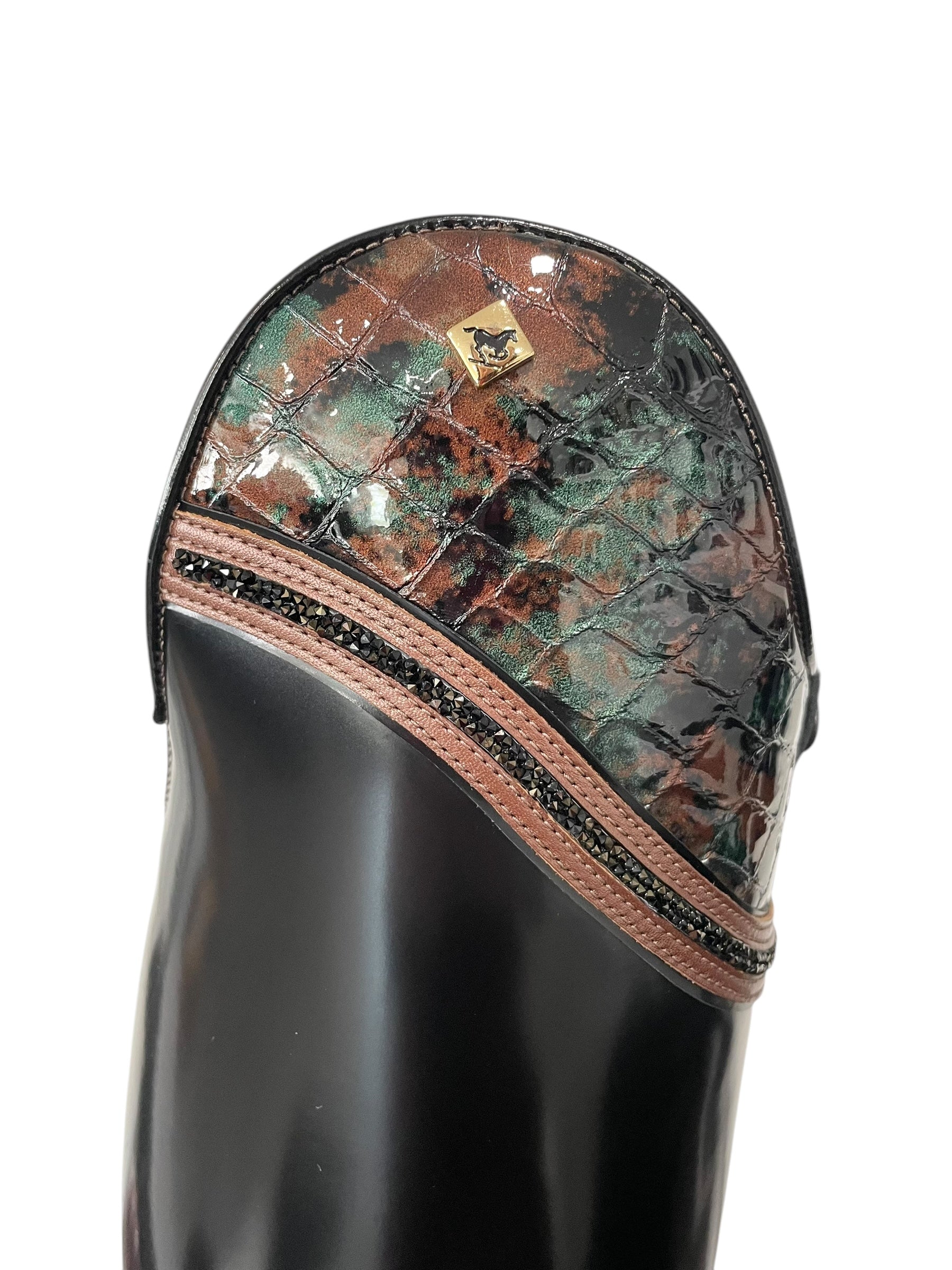 Description: Brushed black base, G25 Lisa top in lucidi sfumato verde with lower band in luxory 2348 and strip of GGS73 crystals in SW cry fine rocks jet, brushed black top piping, Q13 comfort knee, brown stitching, gold logo, and brown outsole.