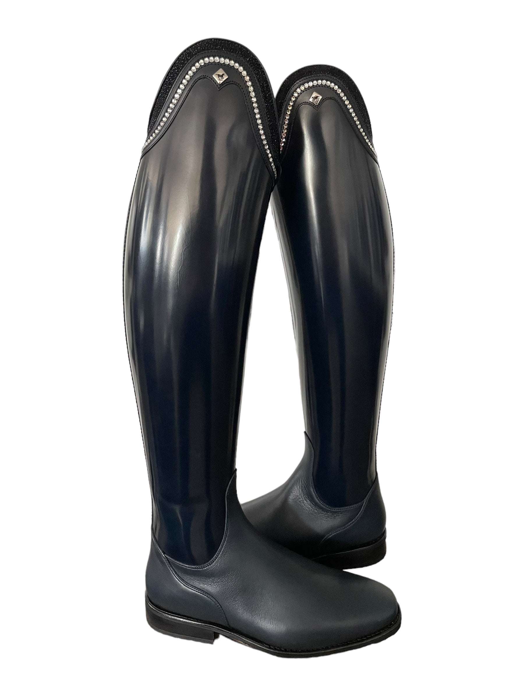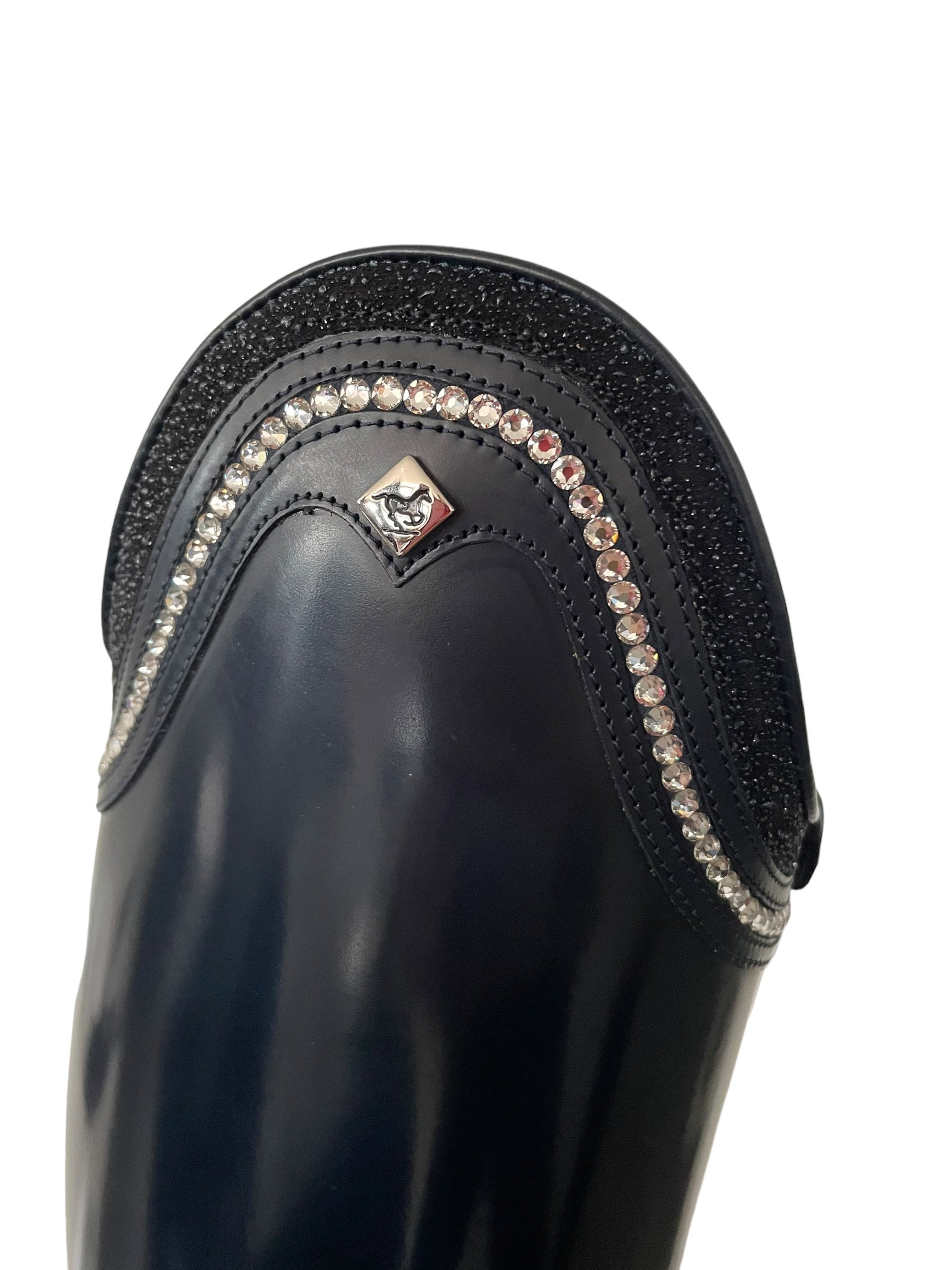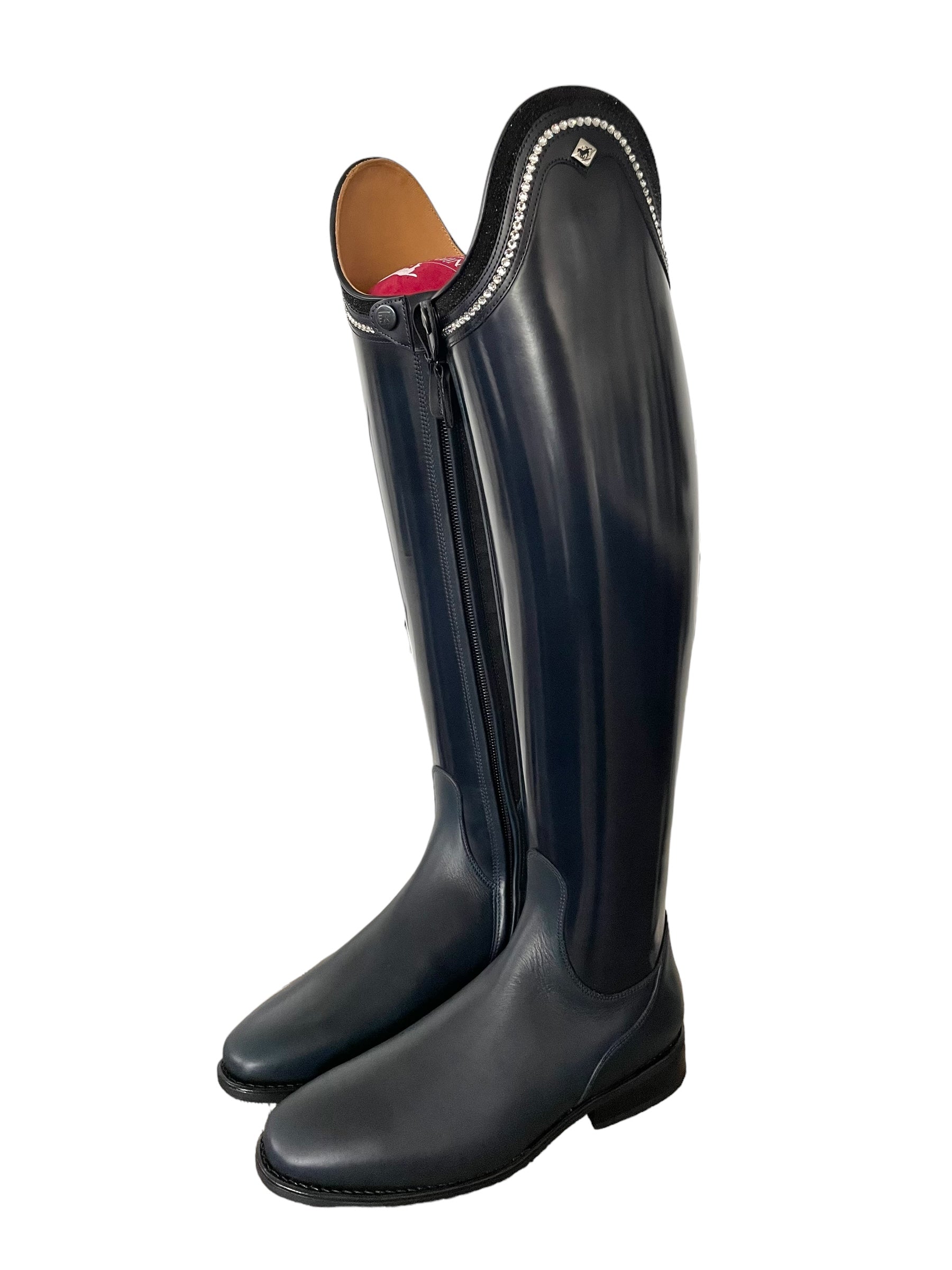 Description: Brushed blue navy shaft with WRAT indaco foot and heel, G37 rondine W top in stardust black with brushed blue navy piping and clear crystals (GGS79), silver logo, Q8 elastic on inside shaft, and black outsole.