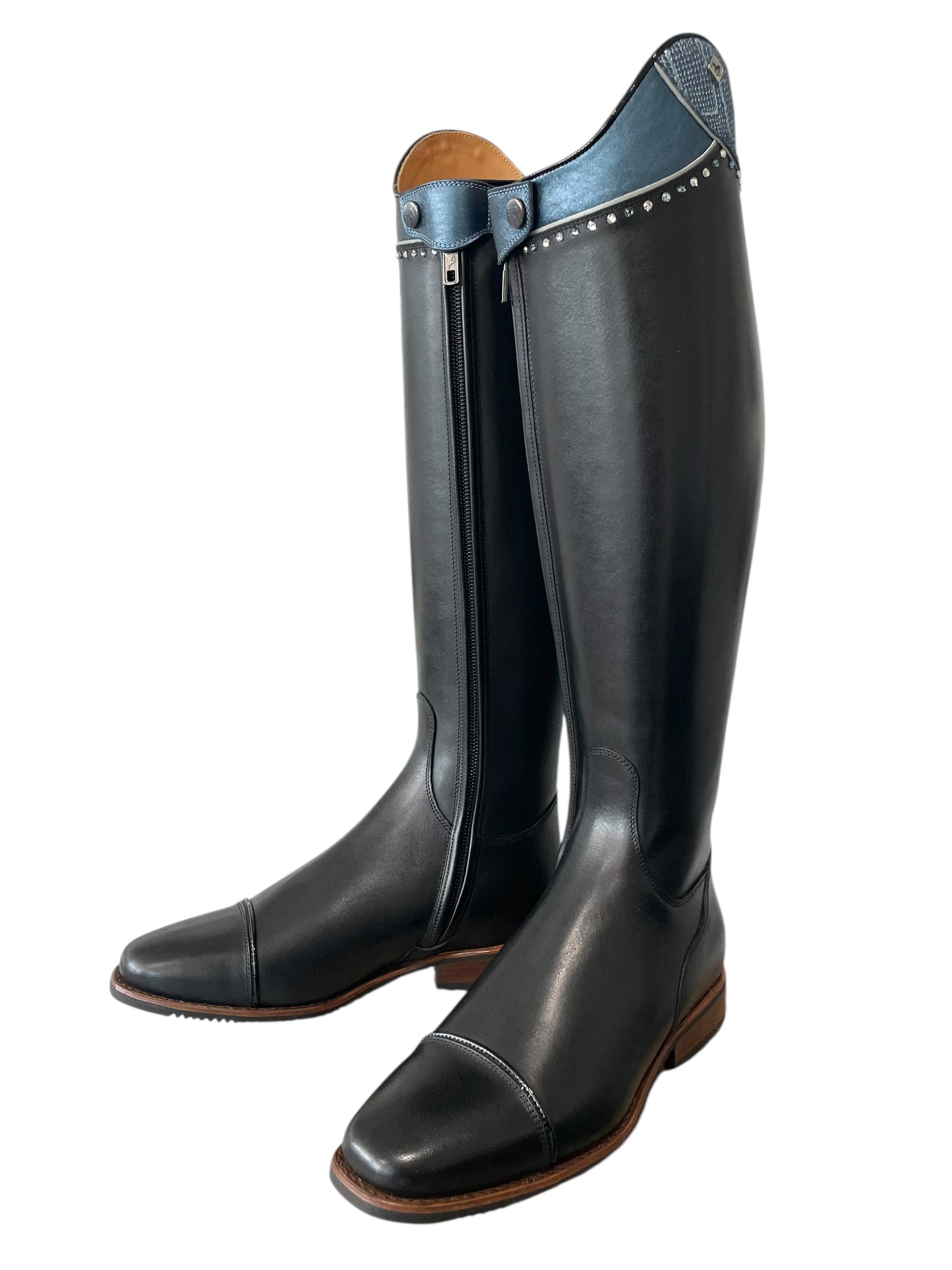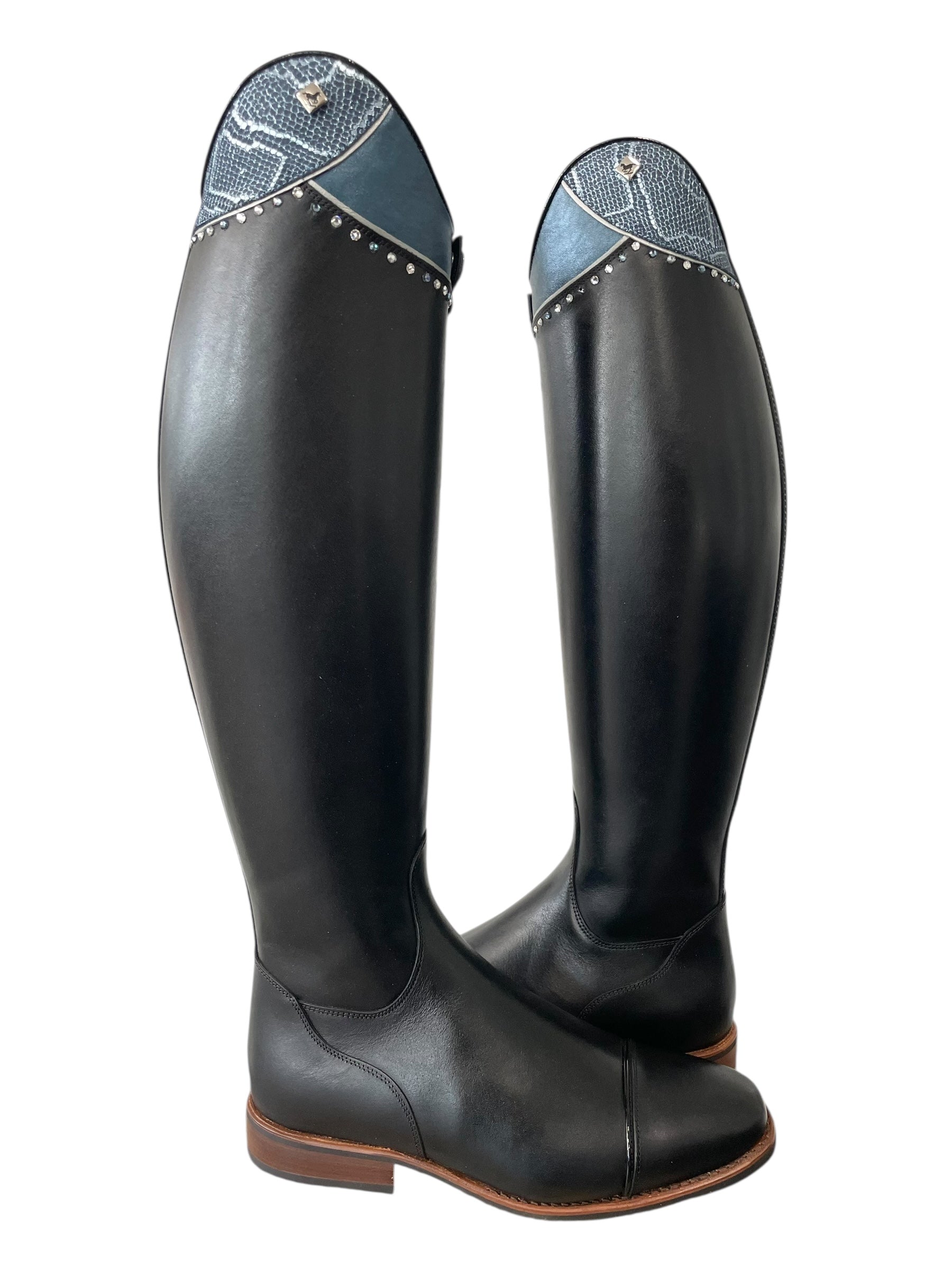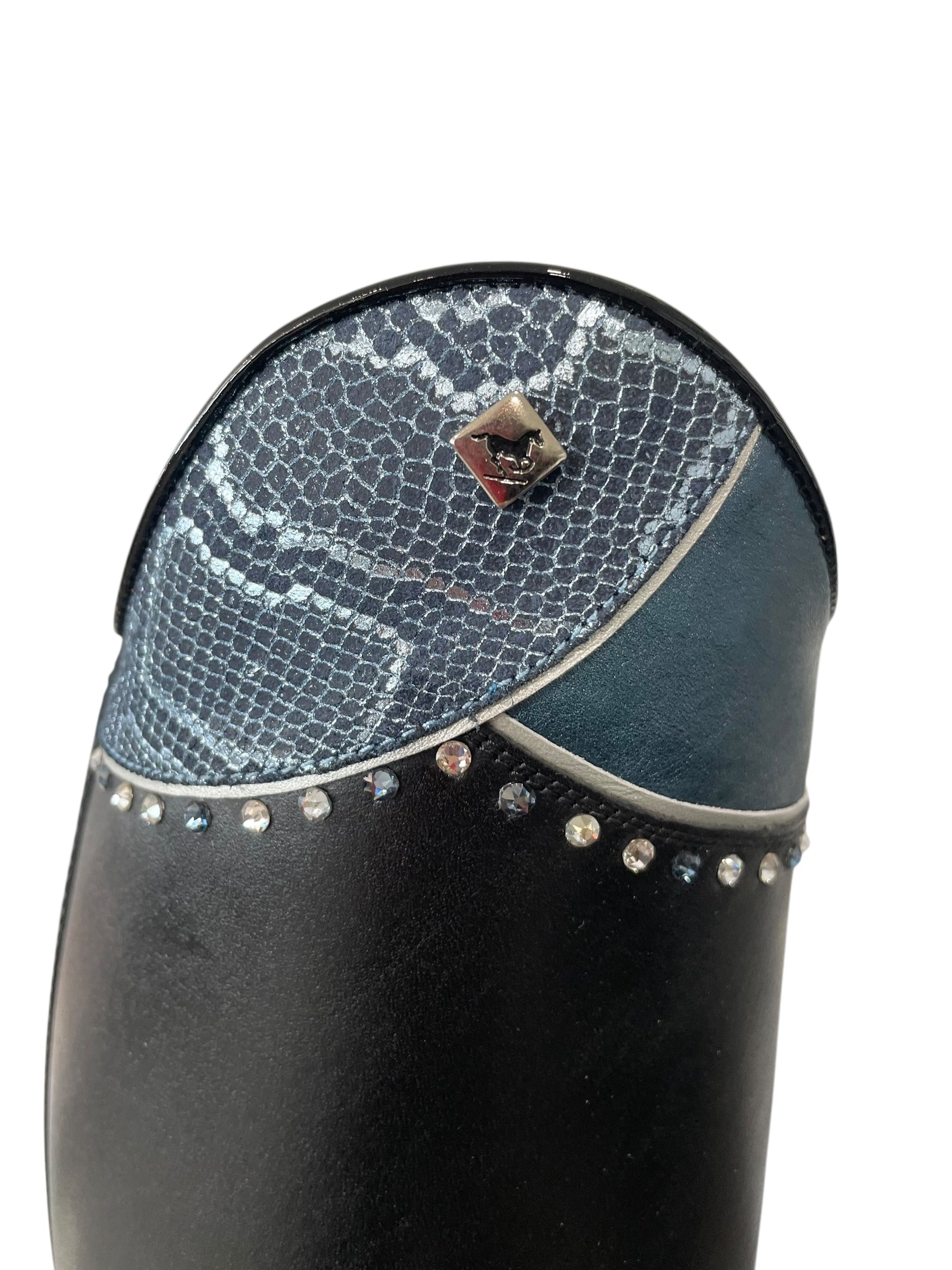 Description: WRAT black base, Q16 low bow (5 cm), patent black top piping, G35 Musa top in regal sky (large section) and sinax avio (smaller section) with luxory silver piping, alternating Swarovski crystals in denim, blue shade, and crystal, E3 toecap with patent black piping, silver logo, and brown outsole.