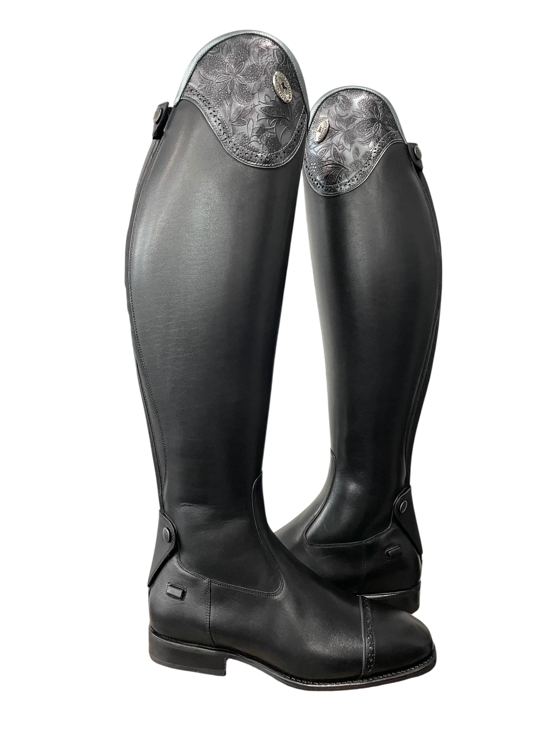 Description: WRAT black base, Salento top in greta grey with punched holes, luxury 2600 top piping and underlayer, E5 toecap with luxury 2600 piping and underlayer, silver logo, and black outsole.