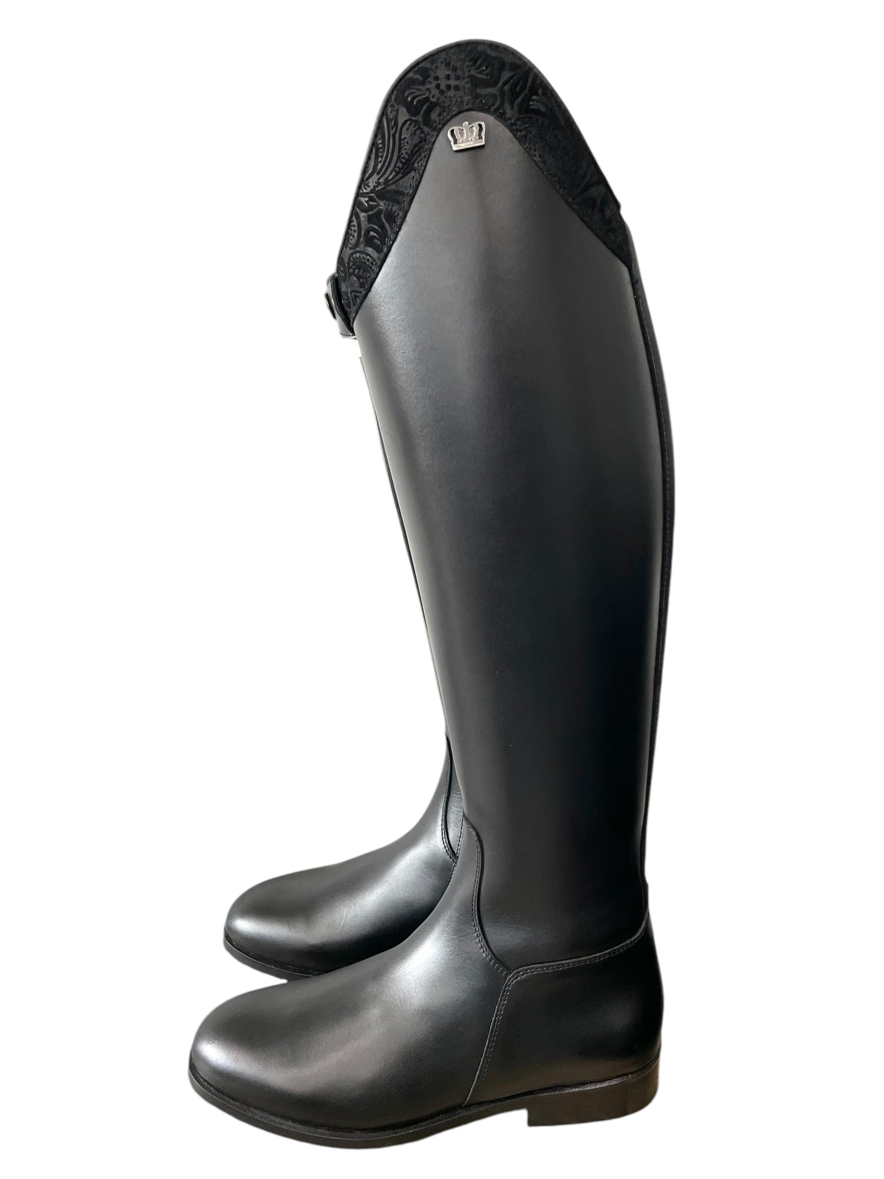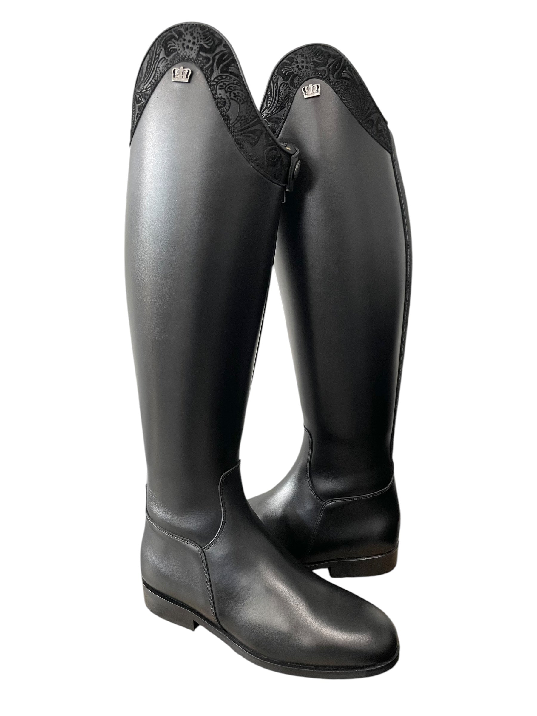 Description: Aspen black base, Jenny top in floral black, polished black logo crown, and black outsole.