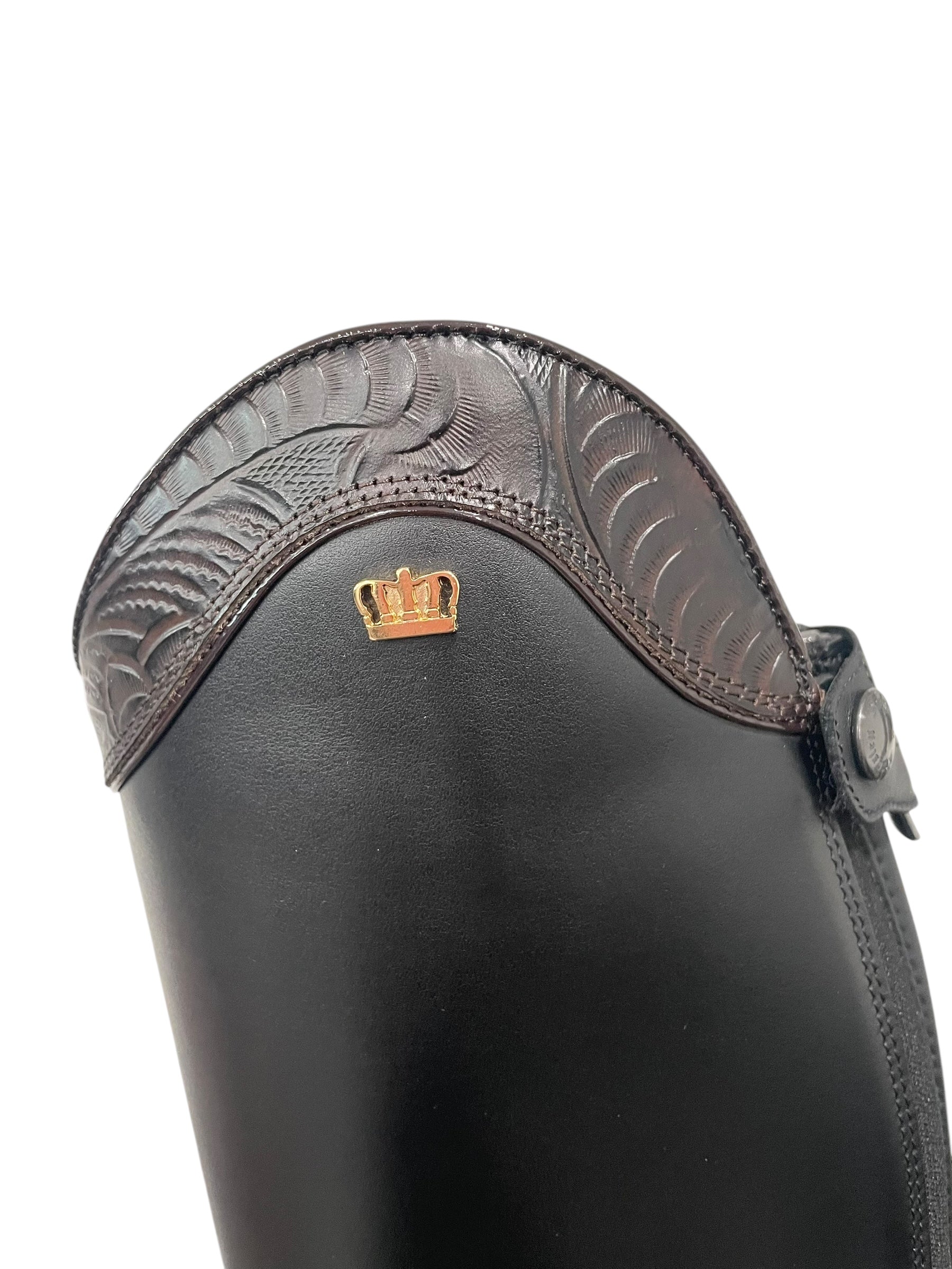 Description: Aspen black base, Jenny top in engraved brown, toecap and top piping in roma castanho, gold logo crown, black elastic, and brown outsole.