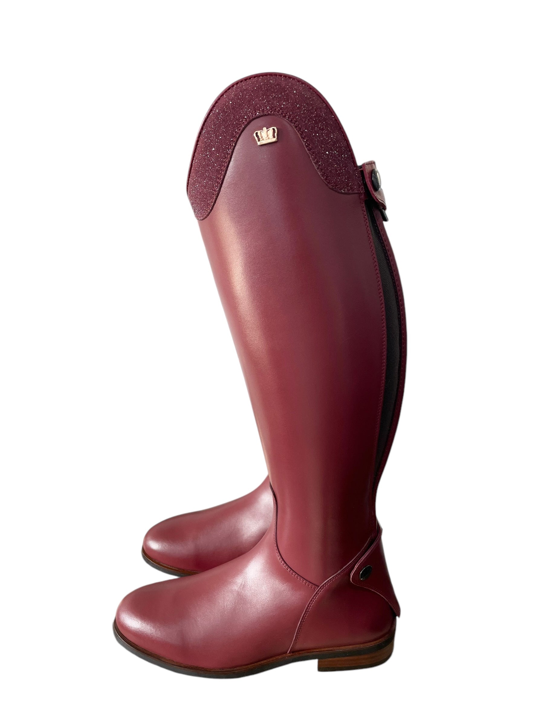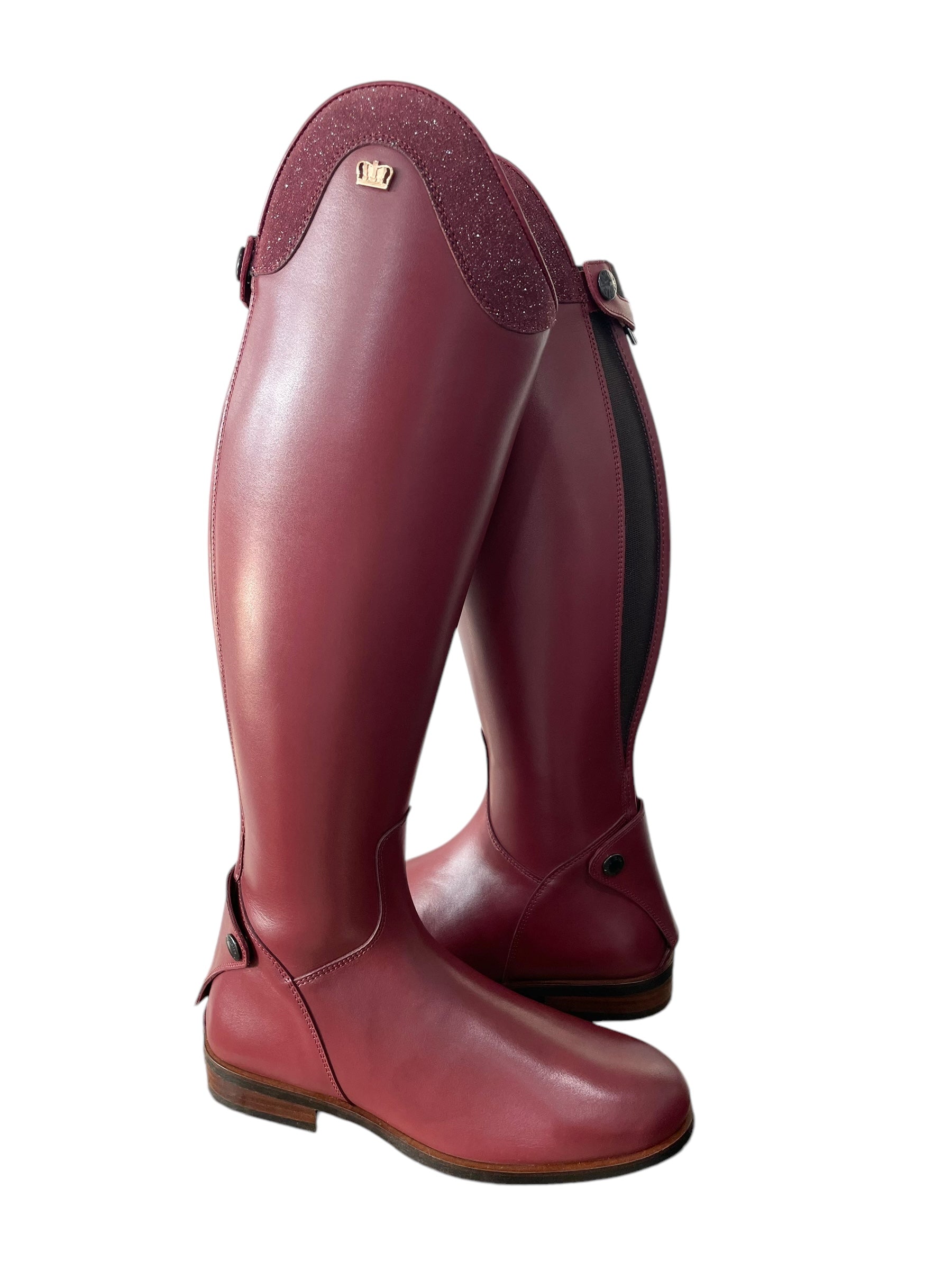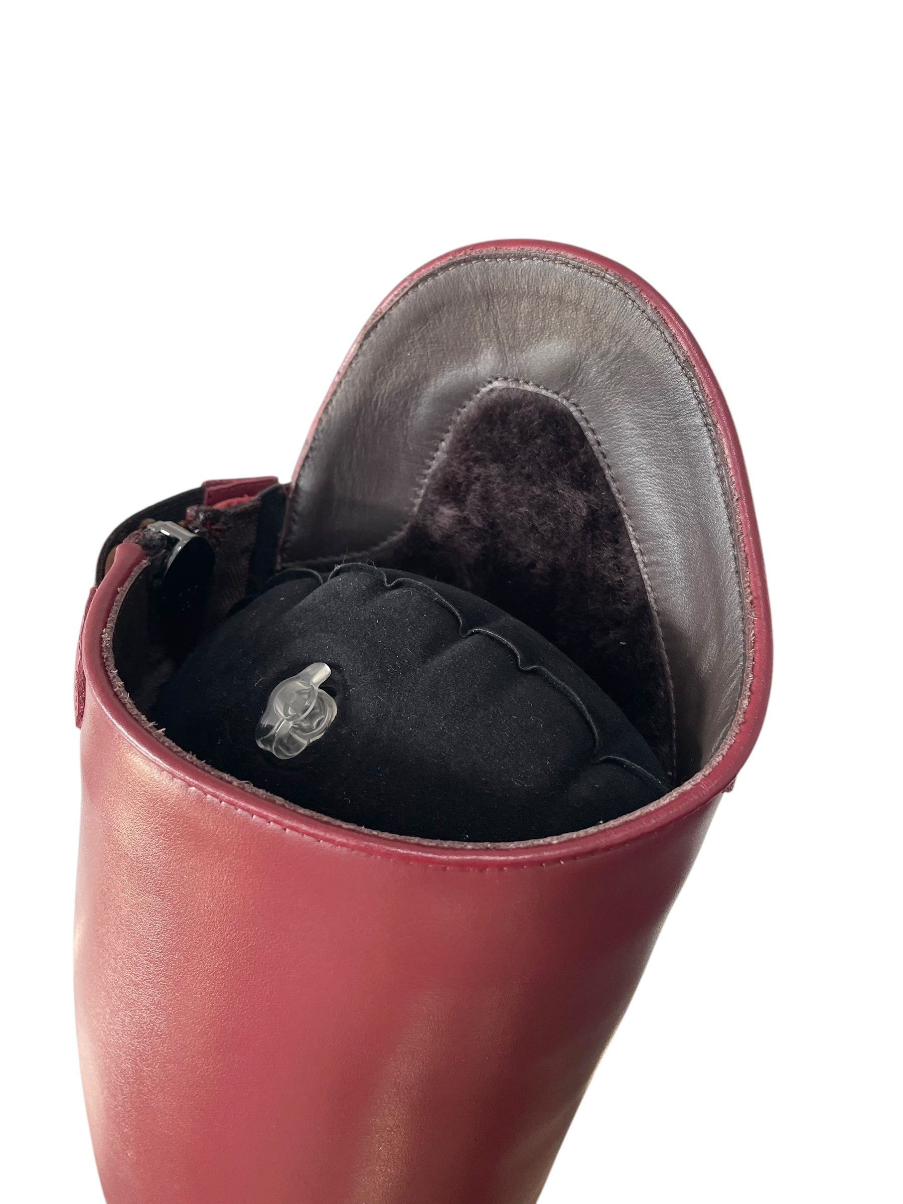 Description: Aspen bordeaux base, chocolate brown sheepskin lining, Libra top in stardust bordeaux, rose gold logo crown, brown elastic along zipper, and brown outsole.