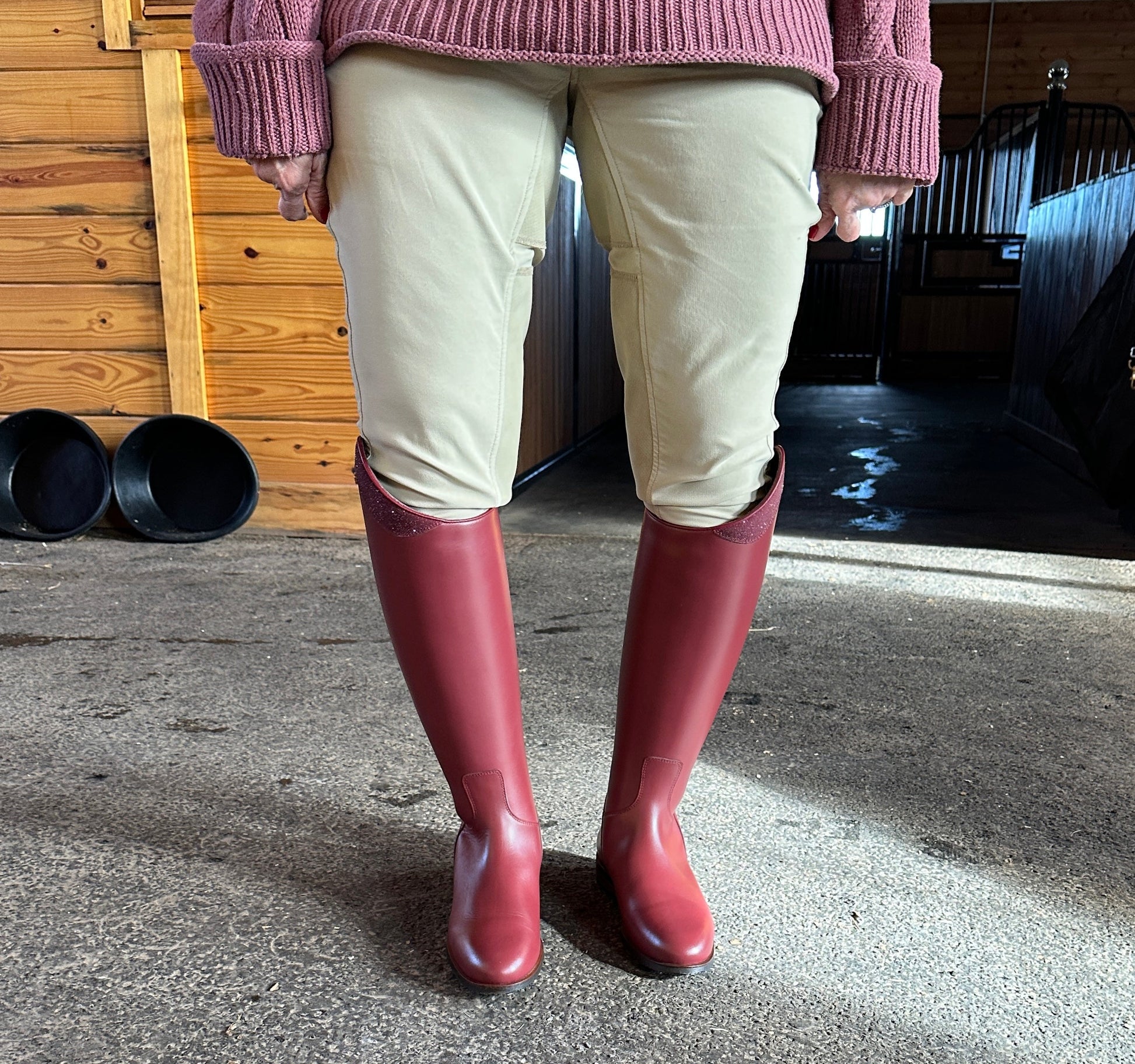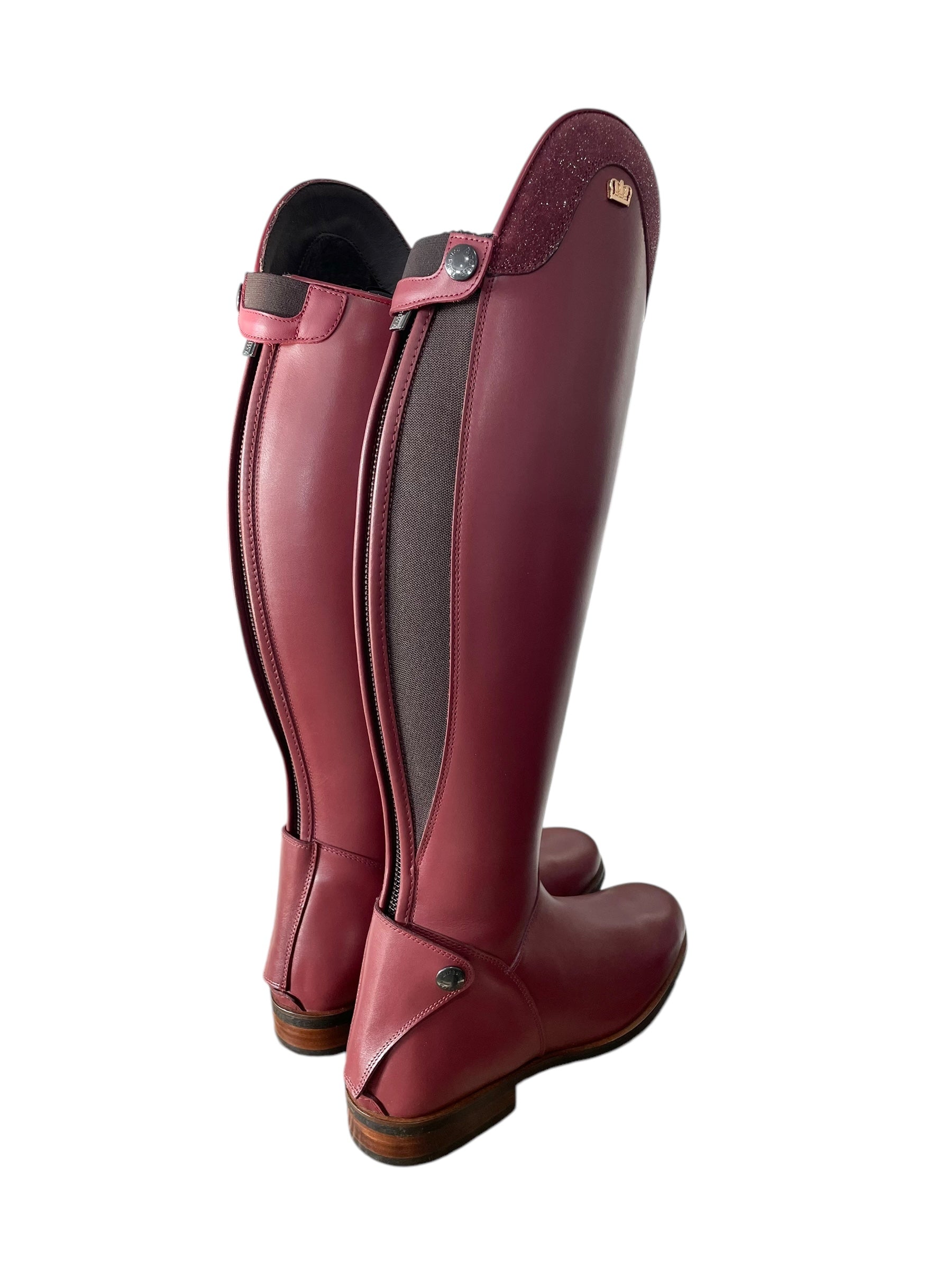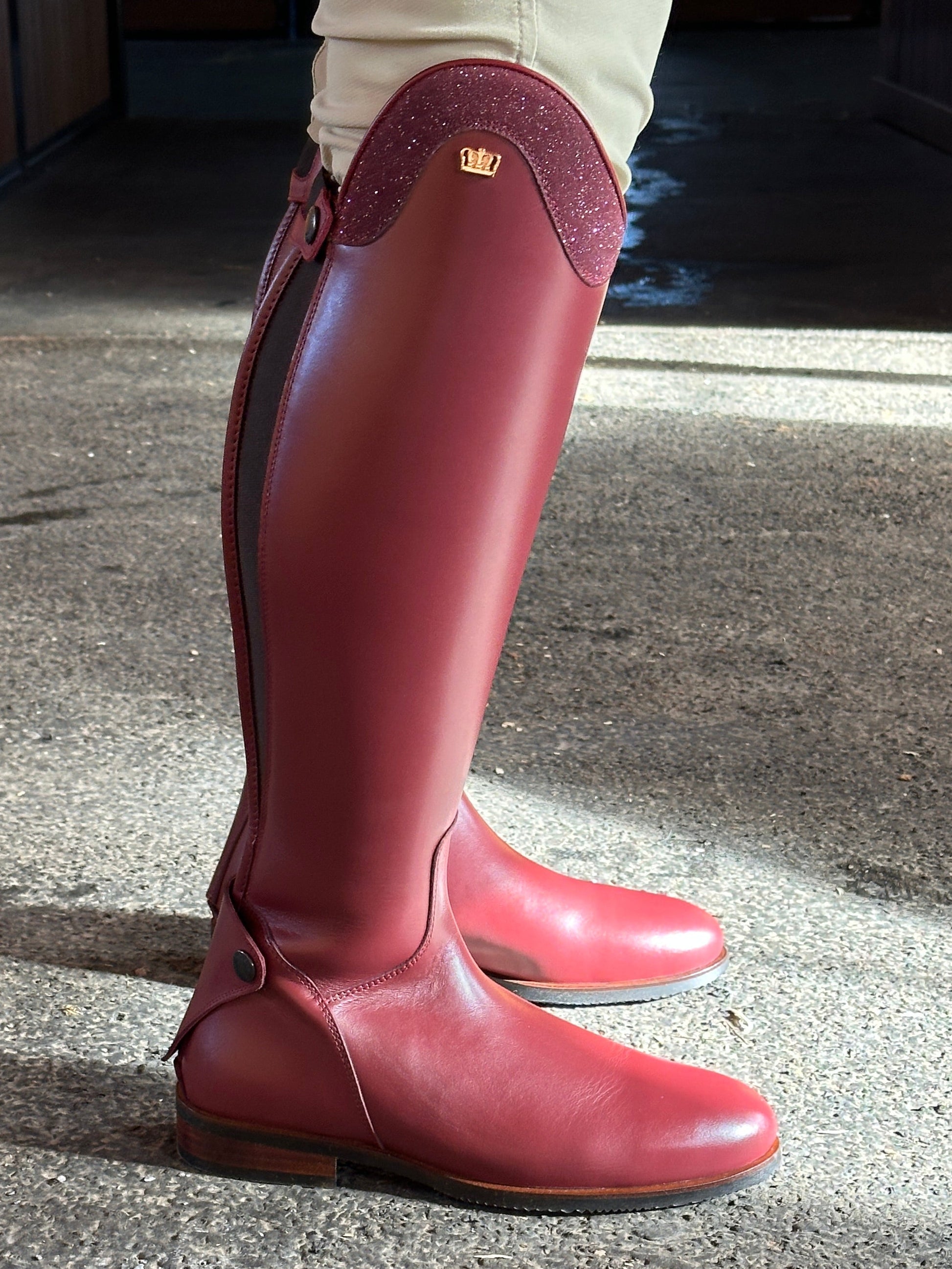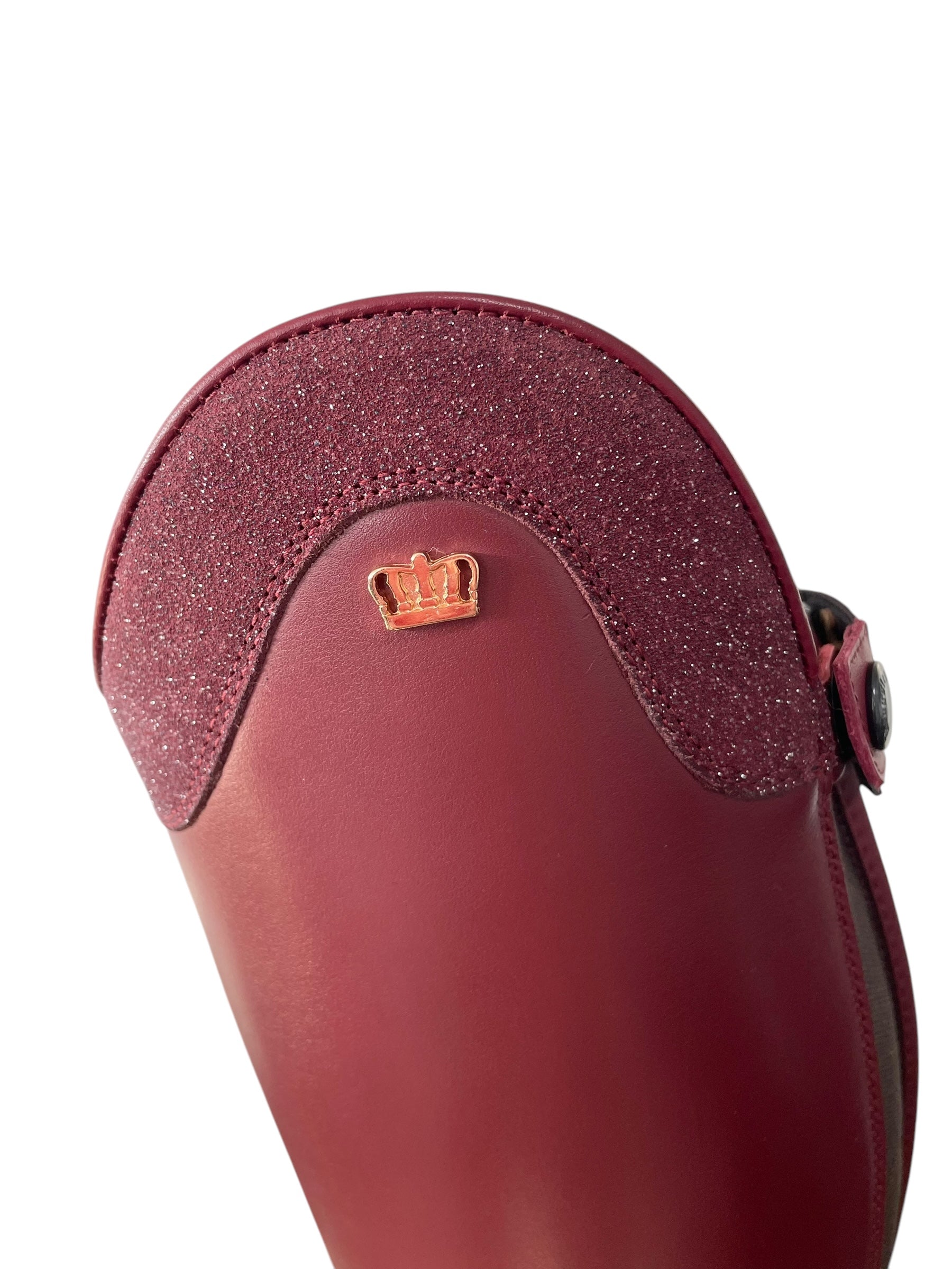 Description: Aspen bordeaux base, chocolate brown sheepskin lining, Libra top in stardust bordeaux, rose gold logo crown, brown elastic along zipper, and brown outsole.