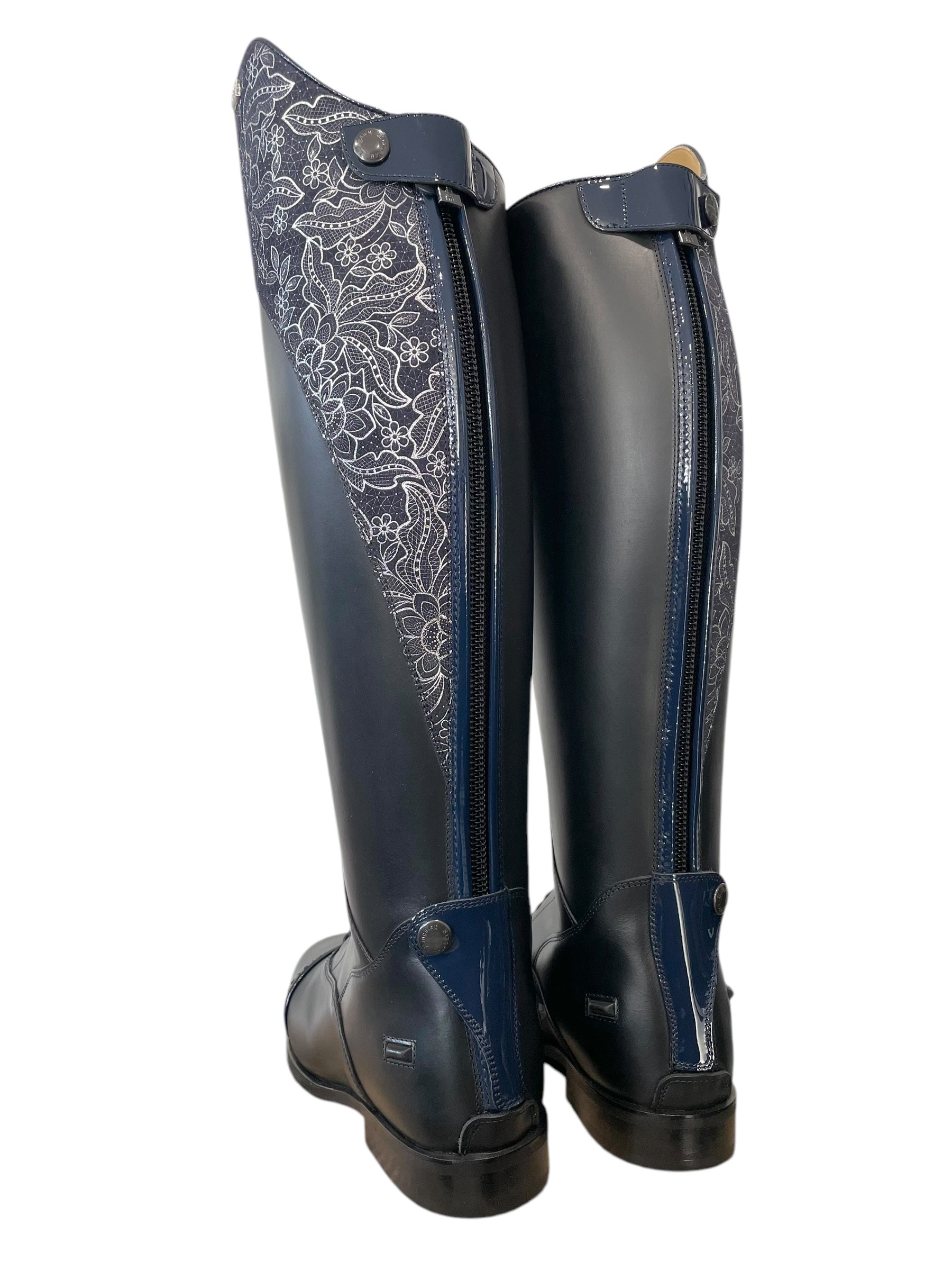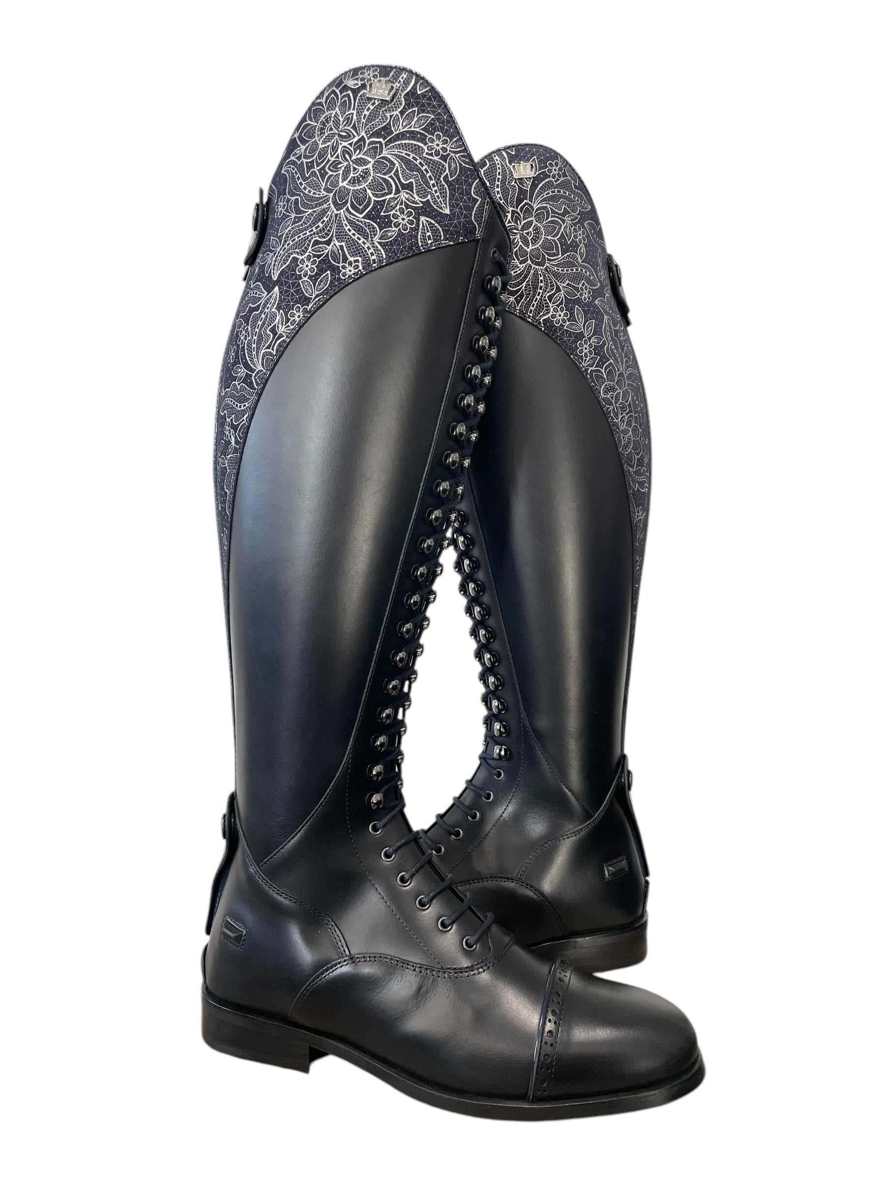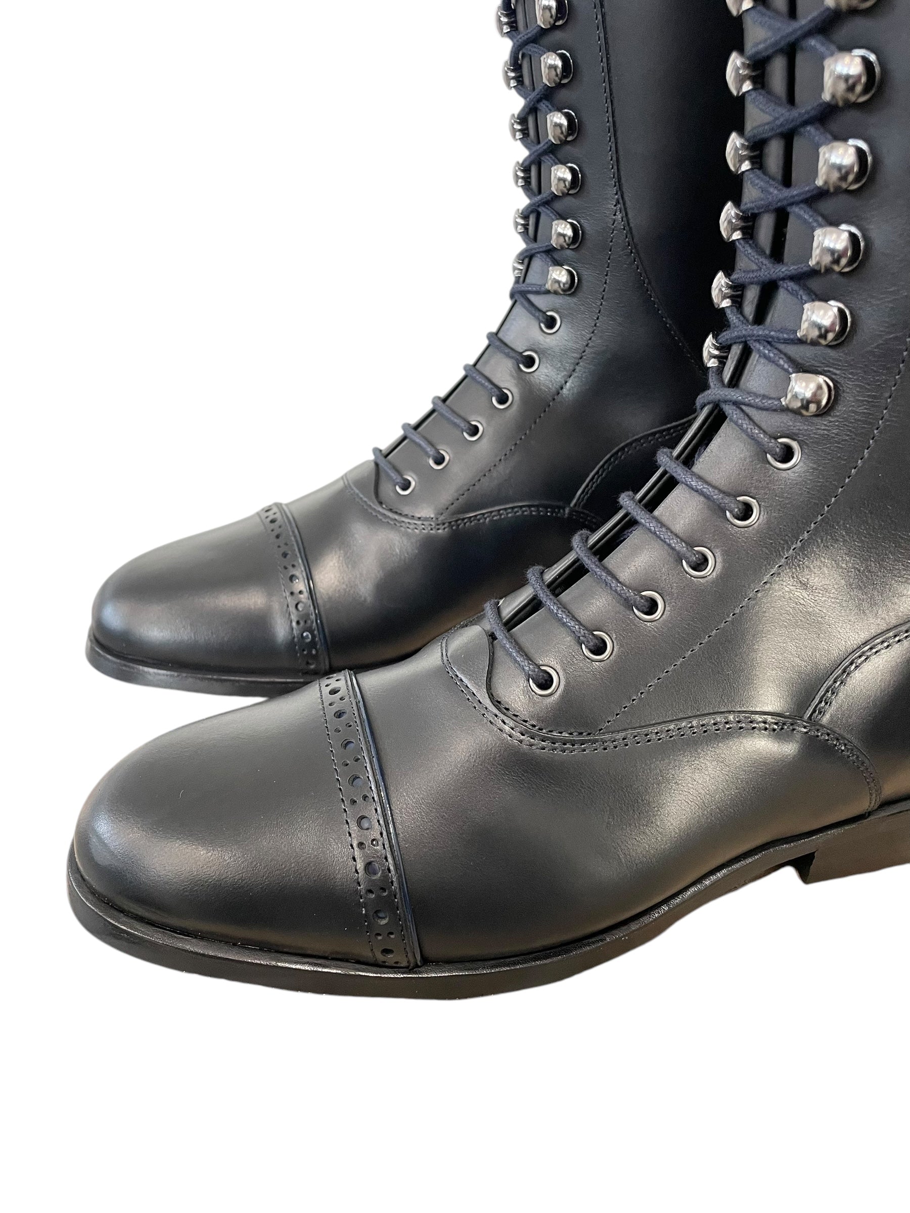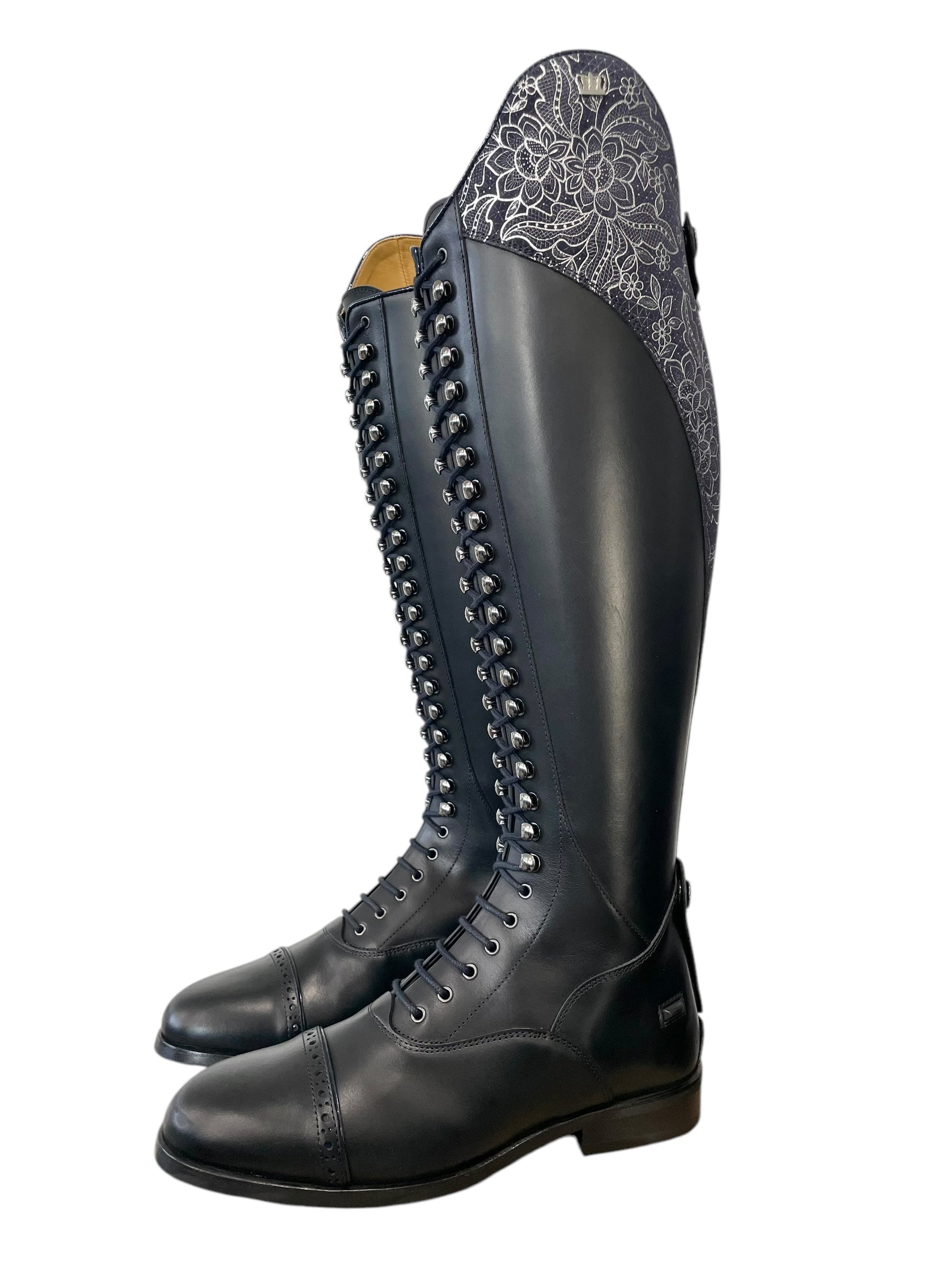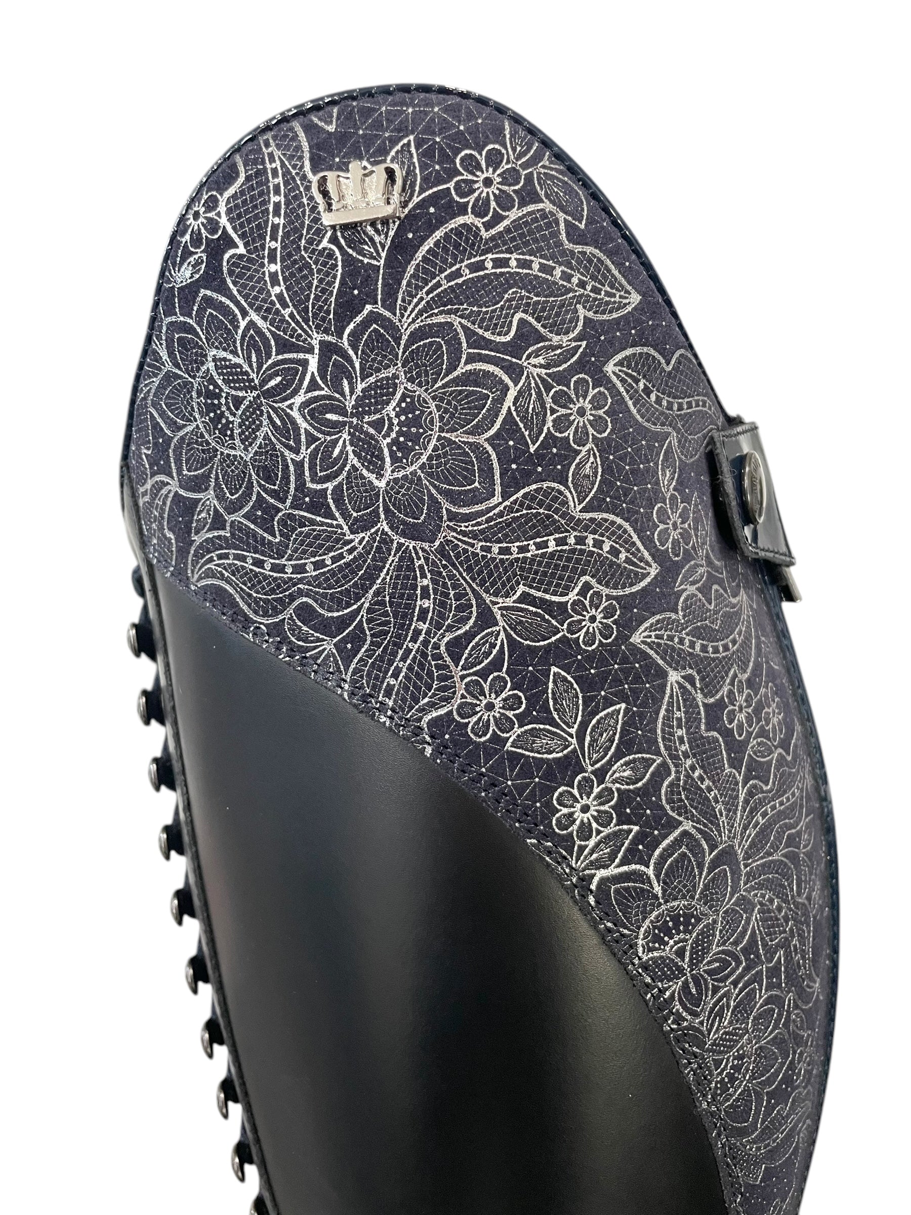 Description: Nature black base, Paula top in silver flower blue with roma blue top piping, toecap with brogues and roma blue piping, zip protectors and parts along the zipper in roma blue, blue pilota laces, silver logo crown, and black outsole.