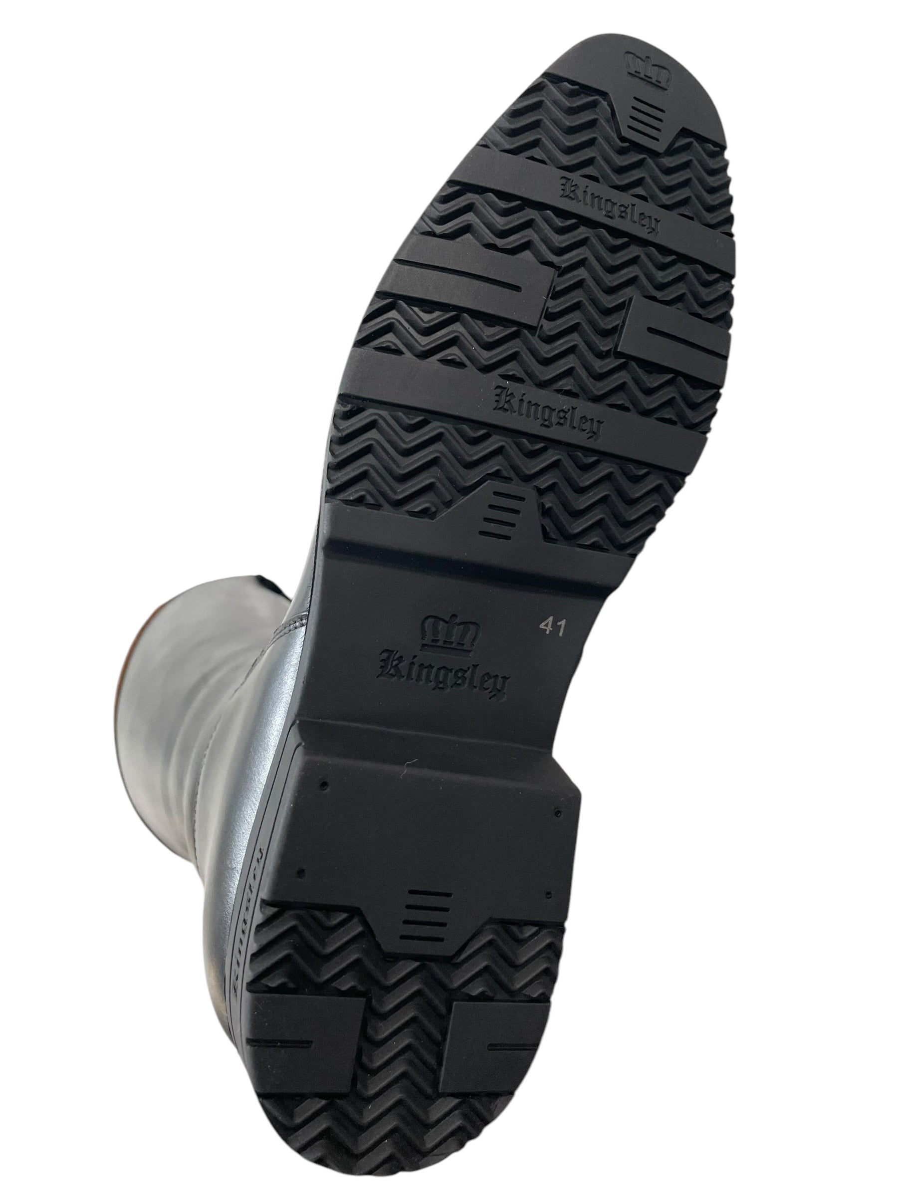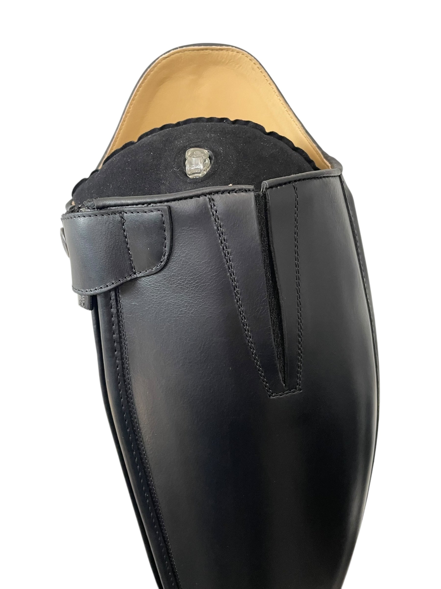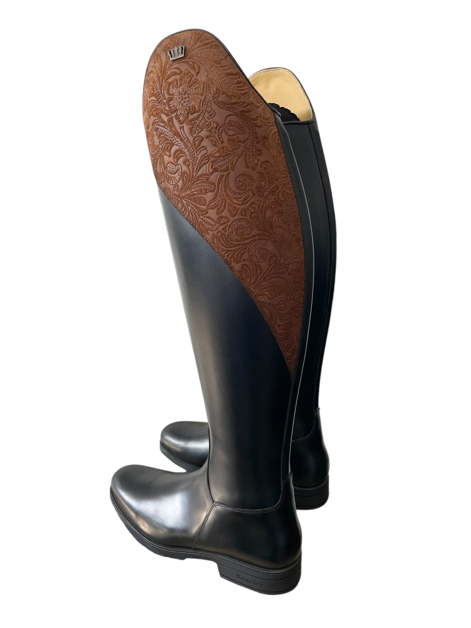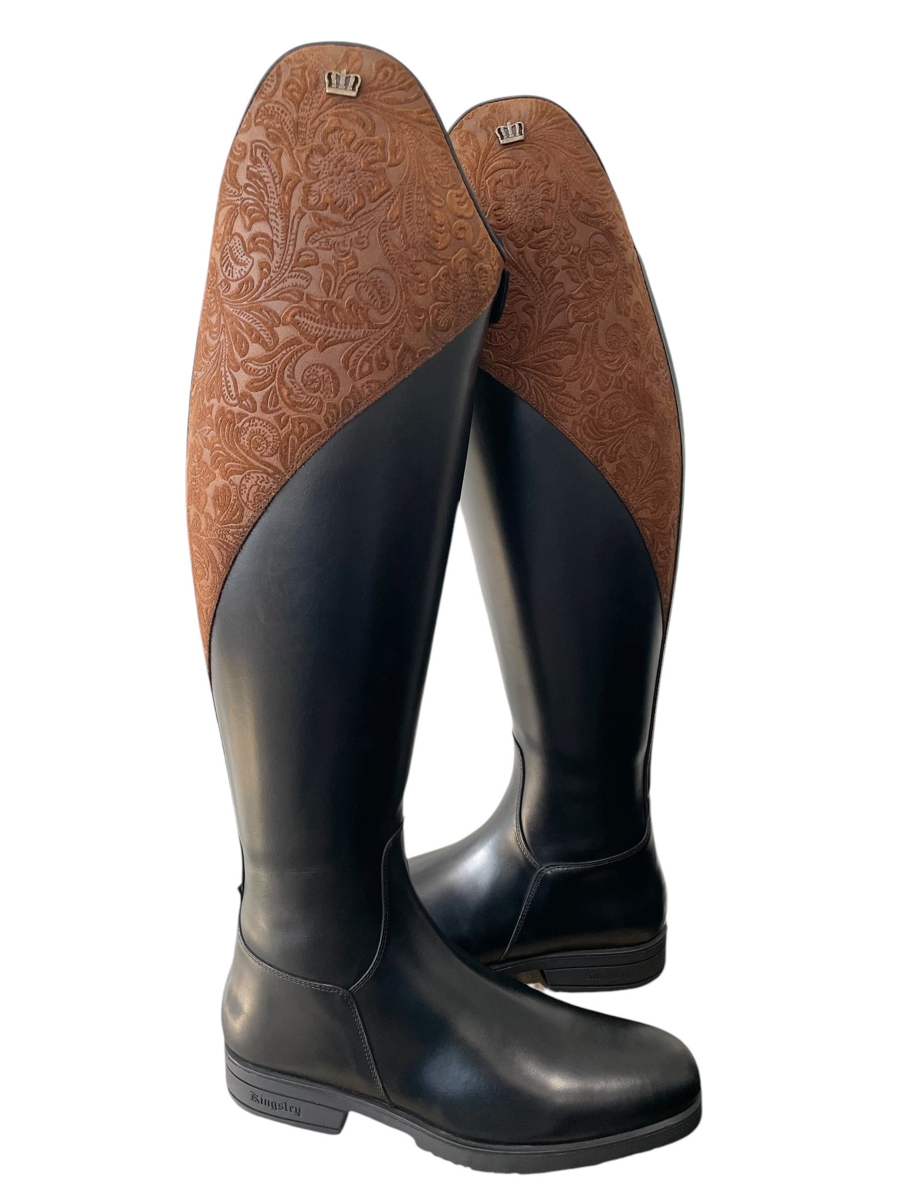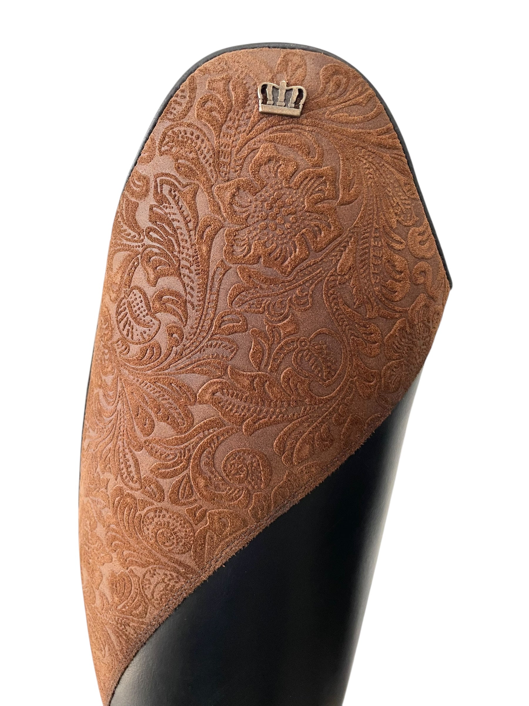 Description: Nature black base, Paula top in floral cognac with nature black top piping, elastic gusset at the knee, old gold logo crown, and black Montreal sole.