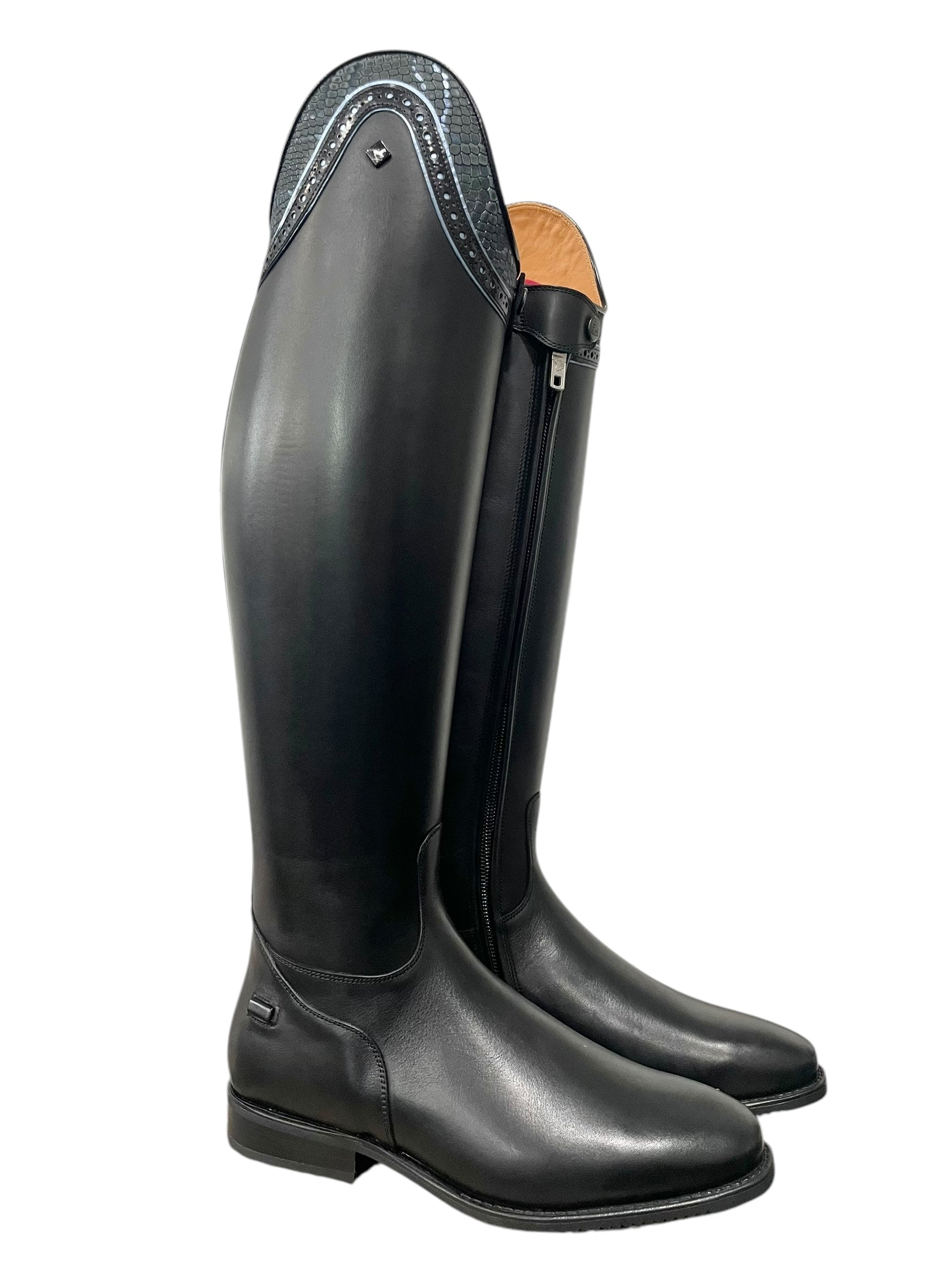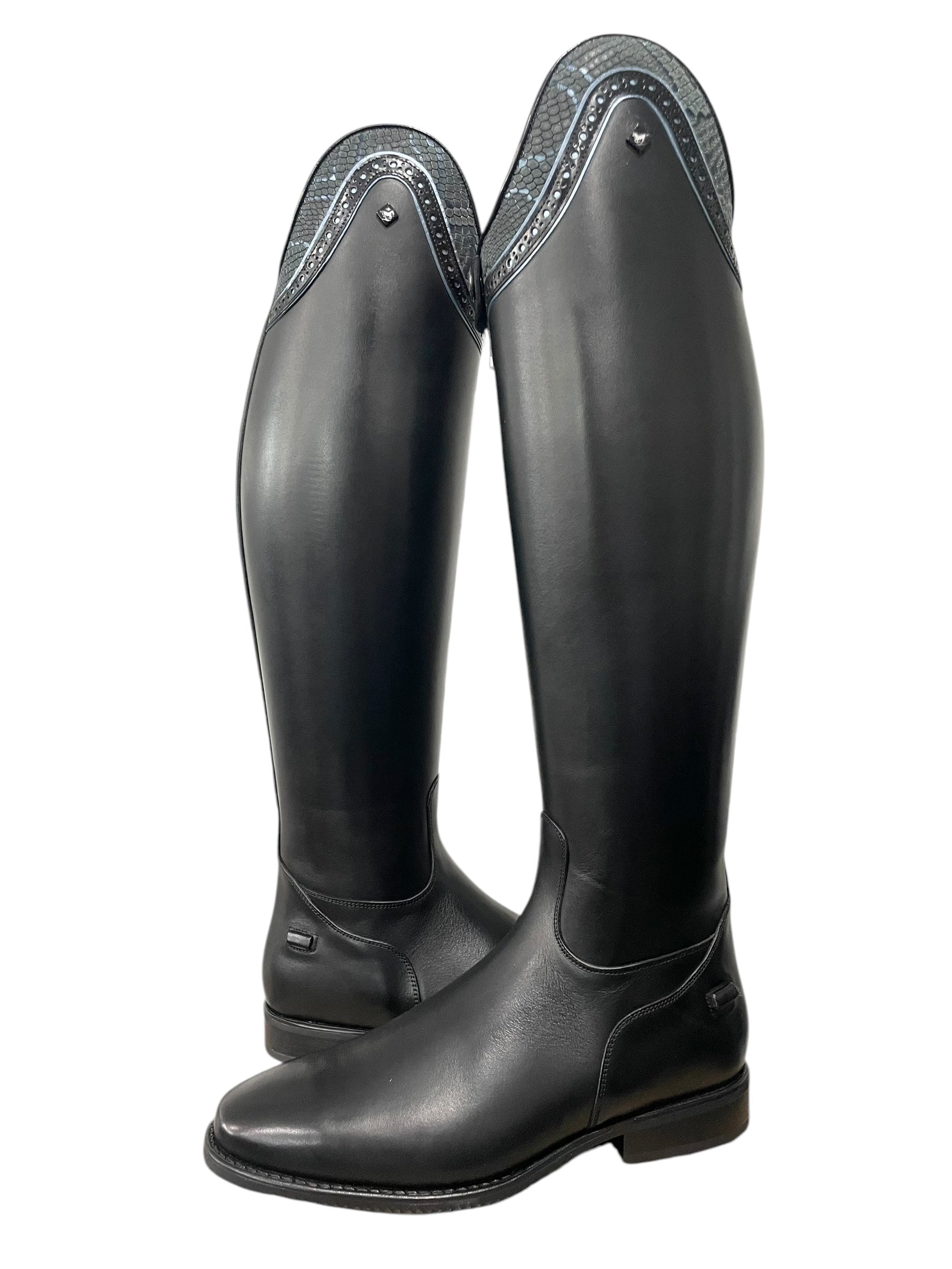 Description: WRAT black base, G22 Piccolo top (top band in regal blue, bottom band in polished black with brogues, lower piping in luxory 625, and top piping in polished black), black logo, and black outsole.