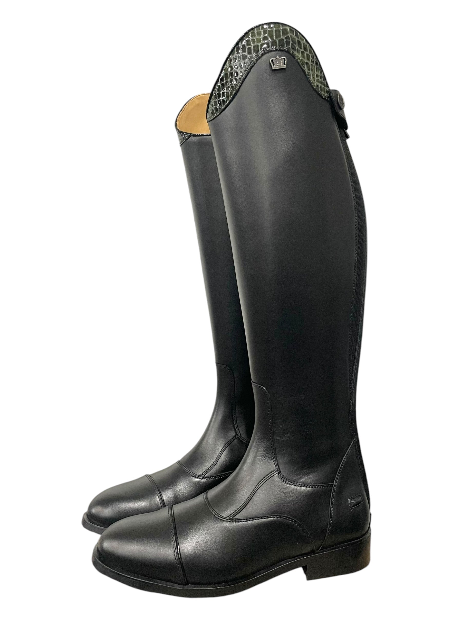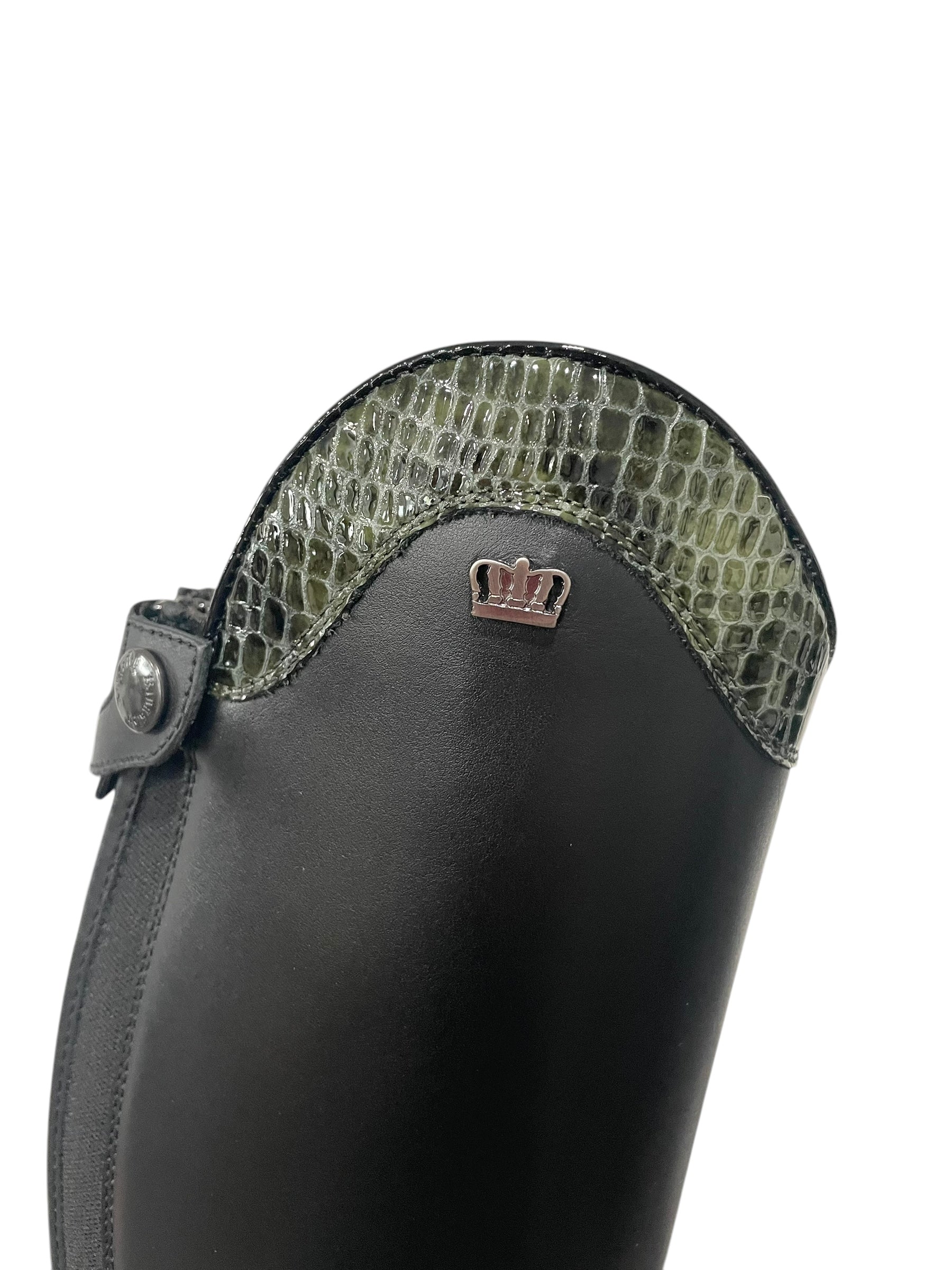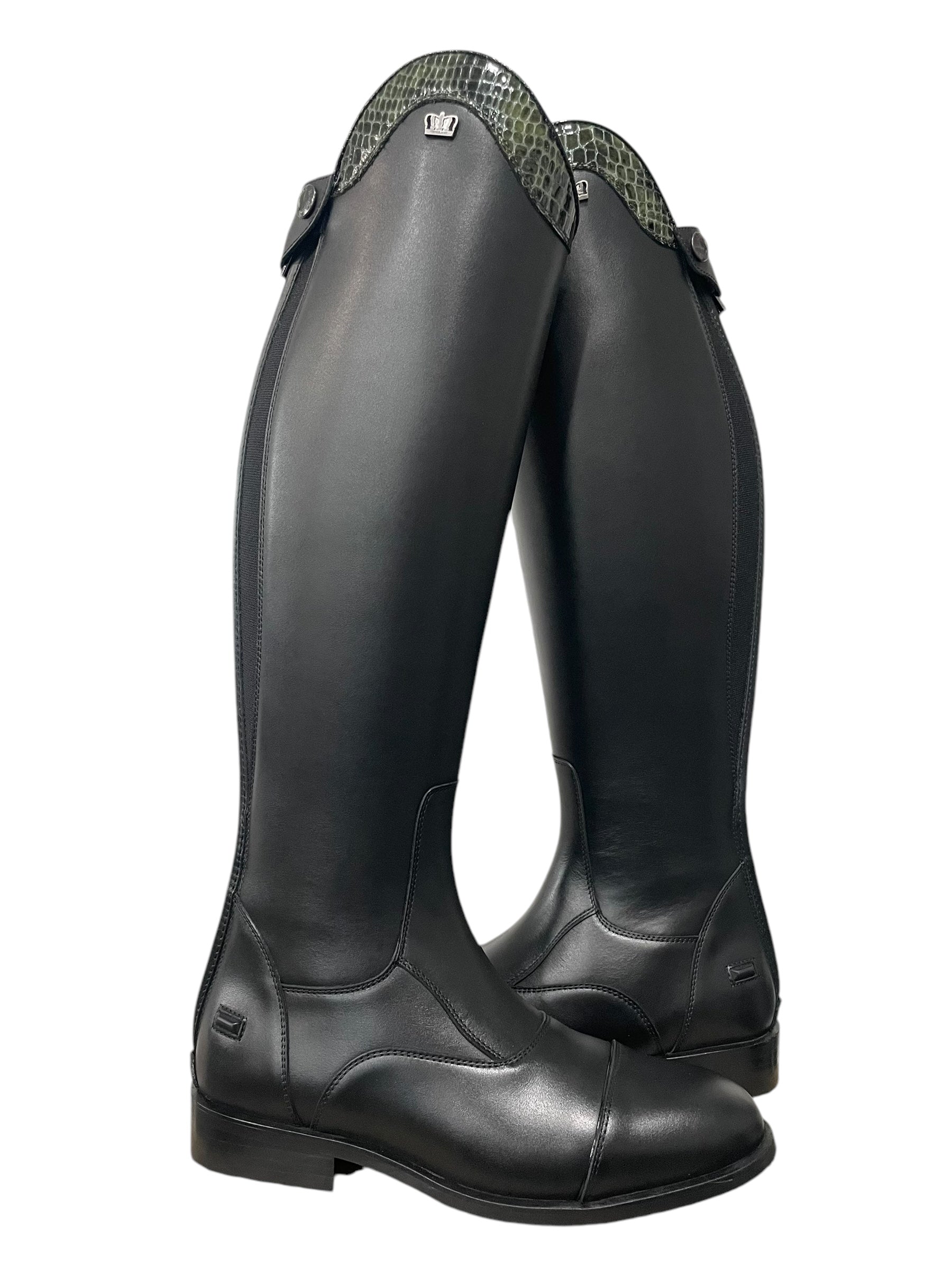 Description: Aspen black base, Jenny top in verniz mini croco kaki, top and toecap piping in roma black, black elastic, and black outsole.