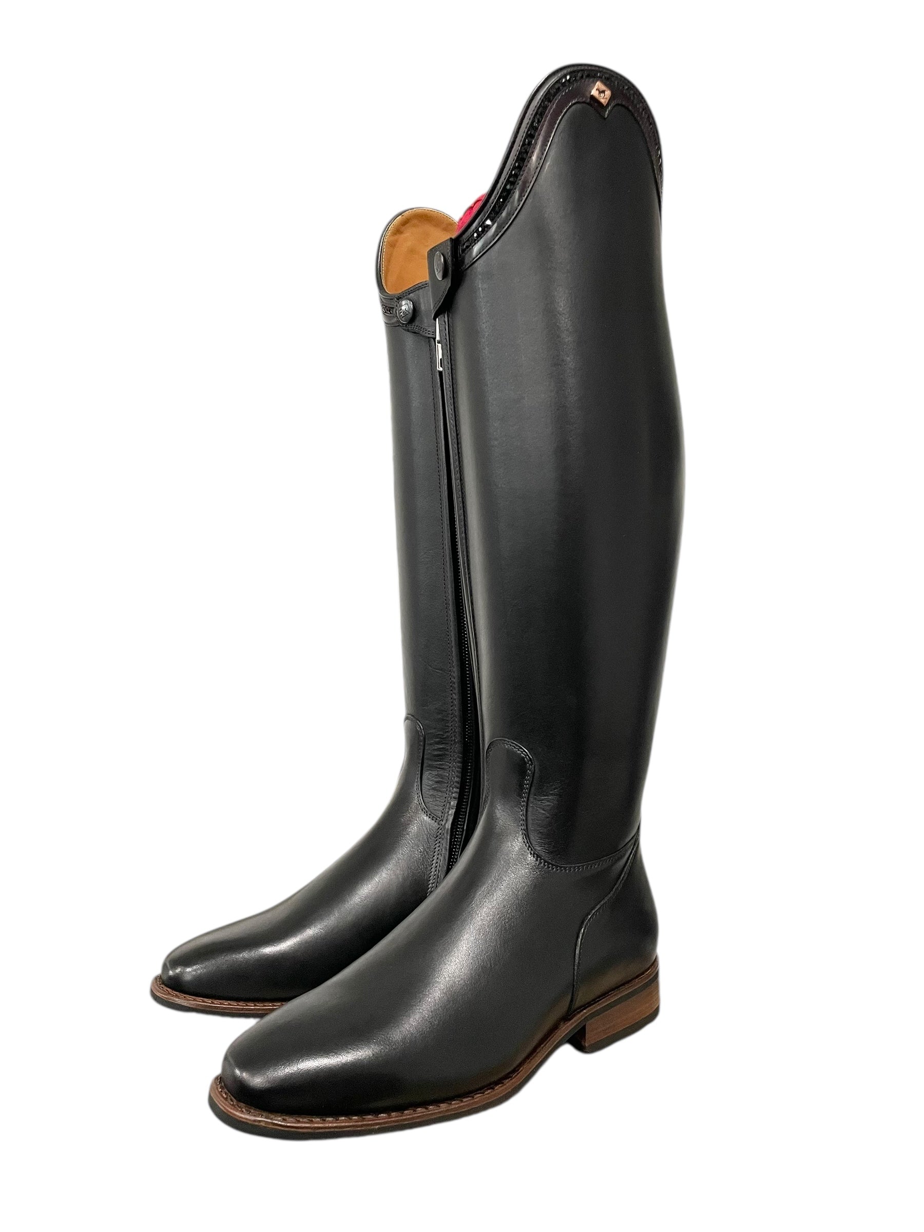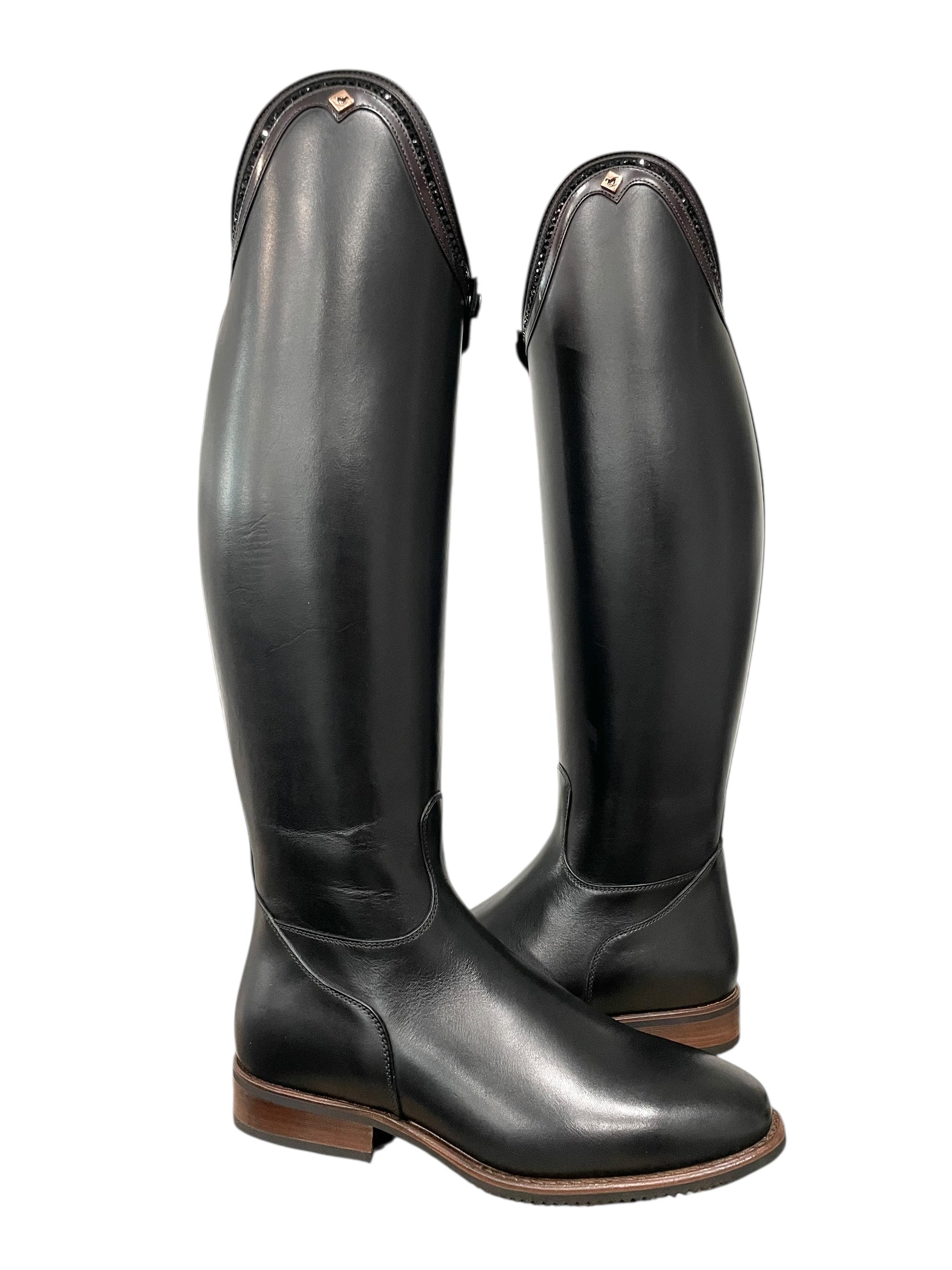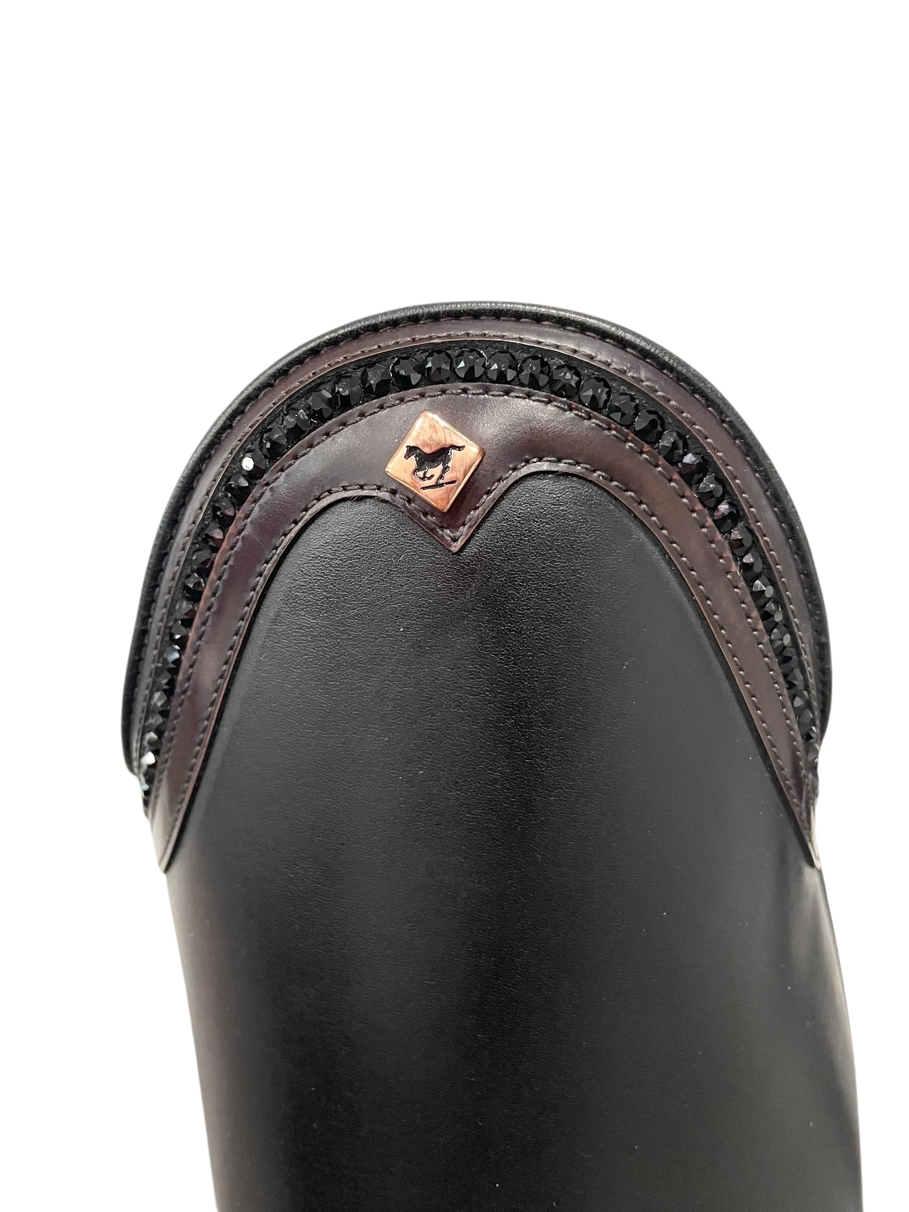 Description: WRAT black base, G9 Rondine top in brushed brown with GGS79 black Swarovski crystals, dark brown stitching, rose gold logo, and brown outsole.