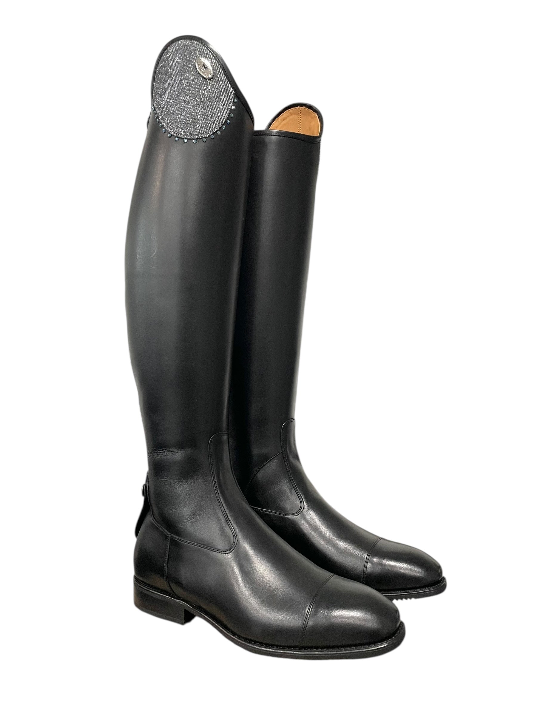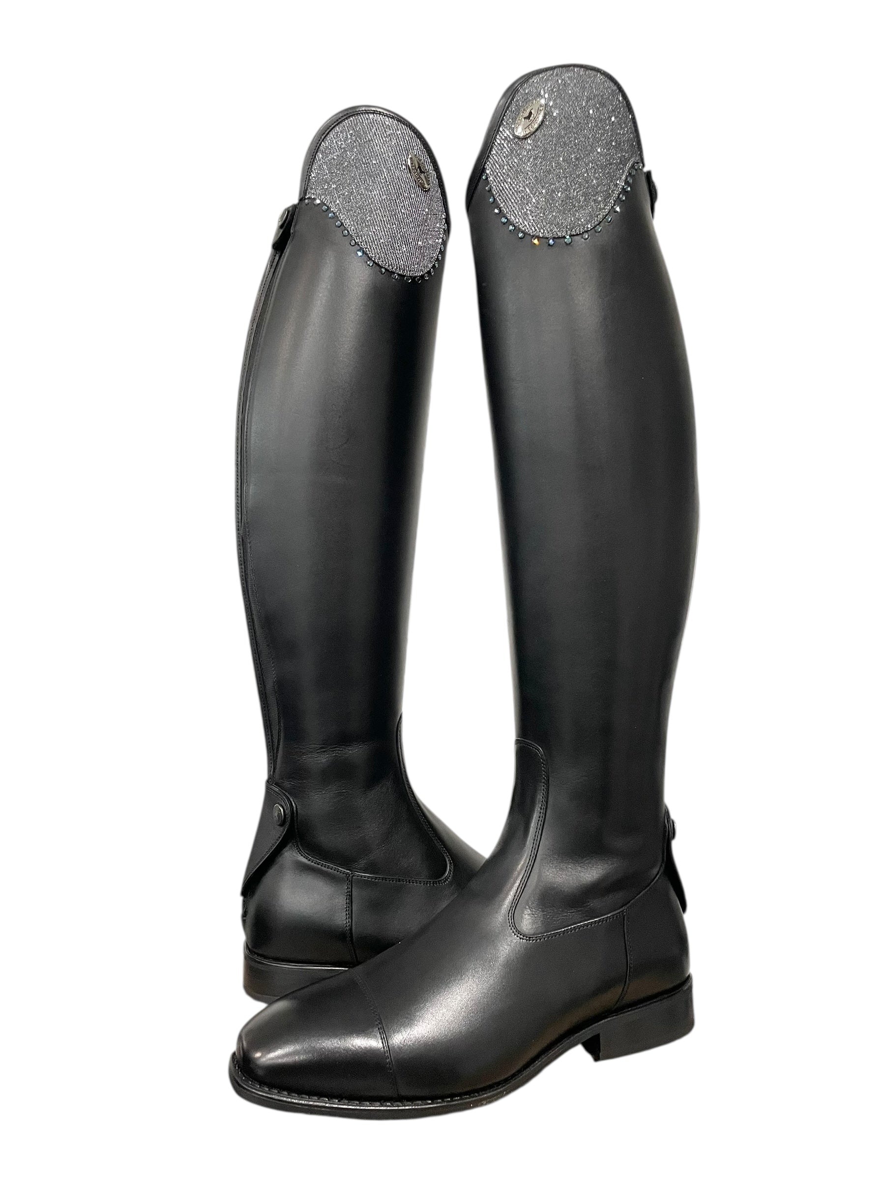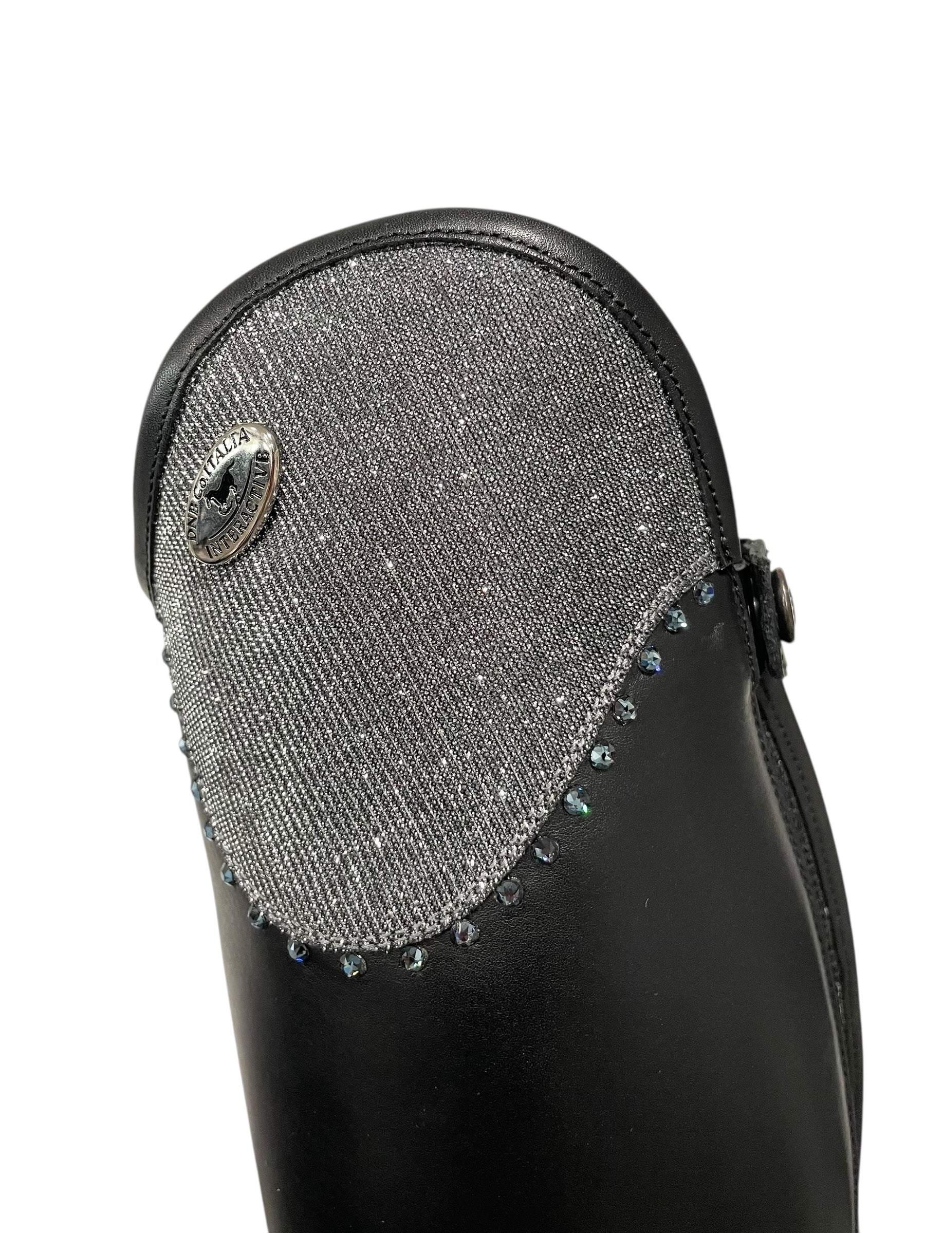 Description: WRAT black base, top in iride cenere with GG08 SS16 denim blue 3.8 mm crystals, silver logo, and black outsole.
