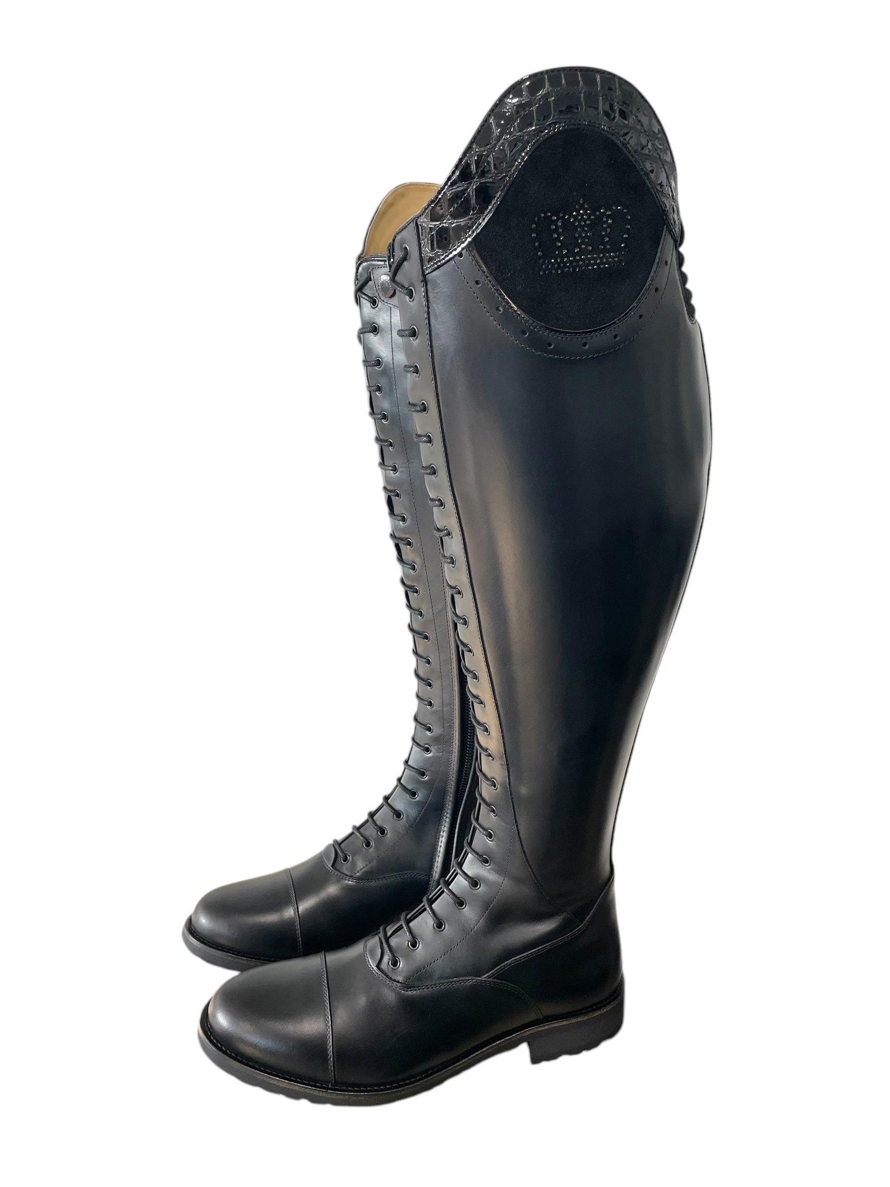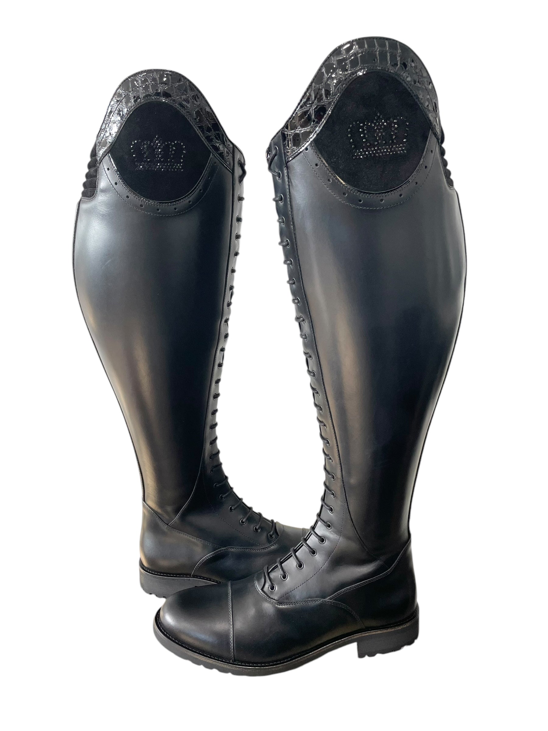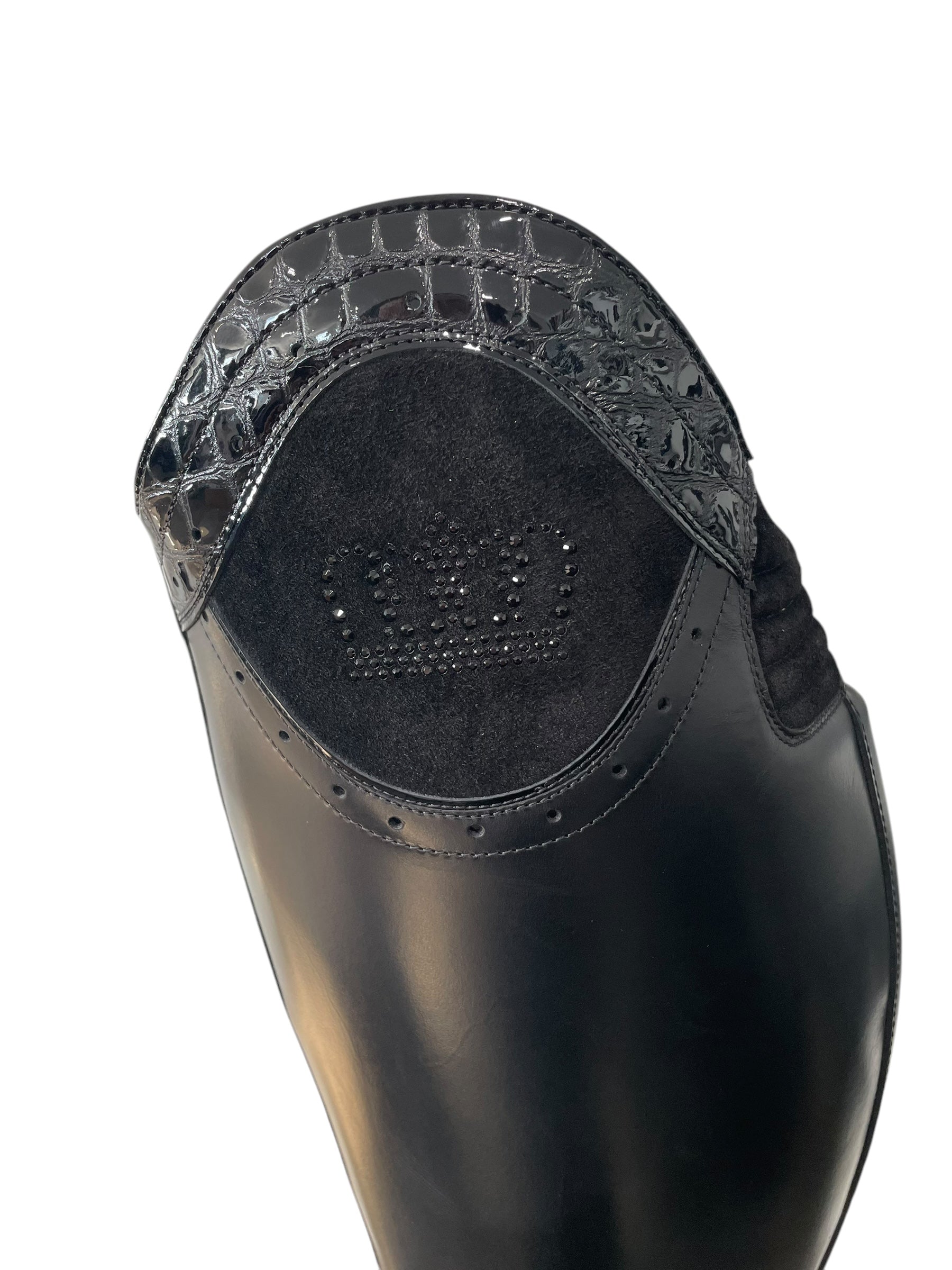 Description: Nature black base, Eve top in croco bril black with roma black piping and sensory black (suede) center with black Swarovski crystal crown, black suede soft knee back option, black laces, gaucho black inside shaft, silver laser initials on zip protector, matte black logo crown, and black Amsterdam sole.