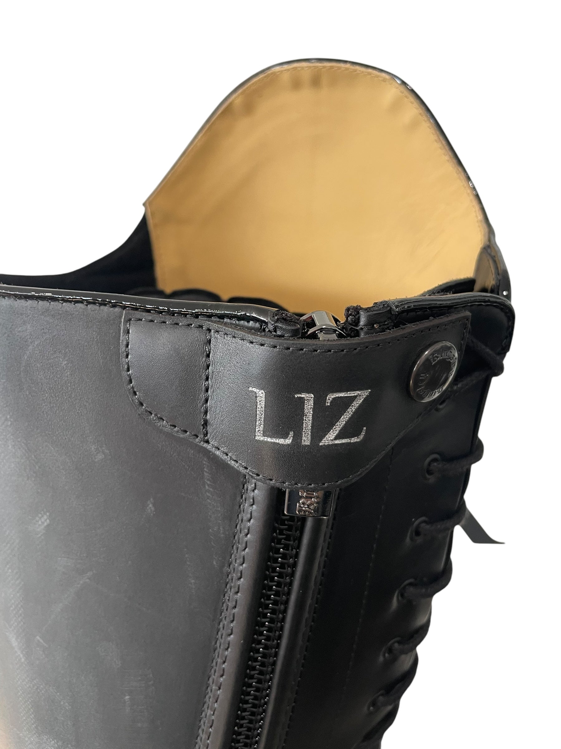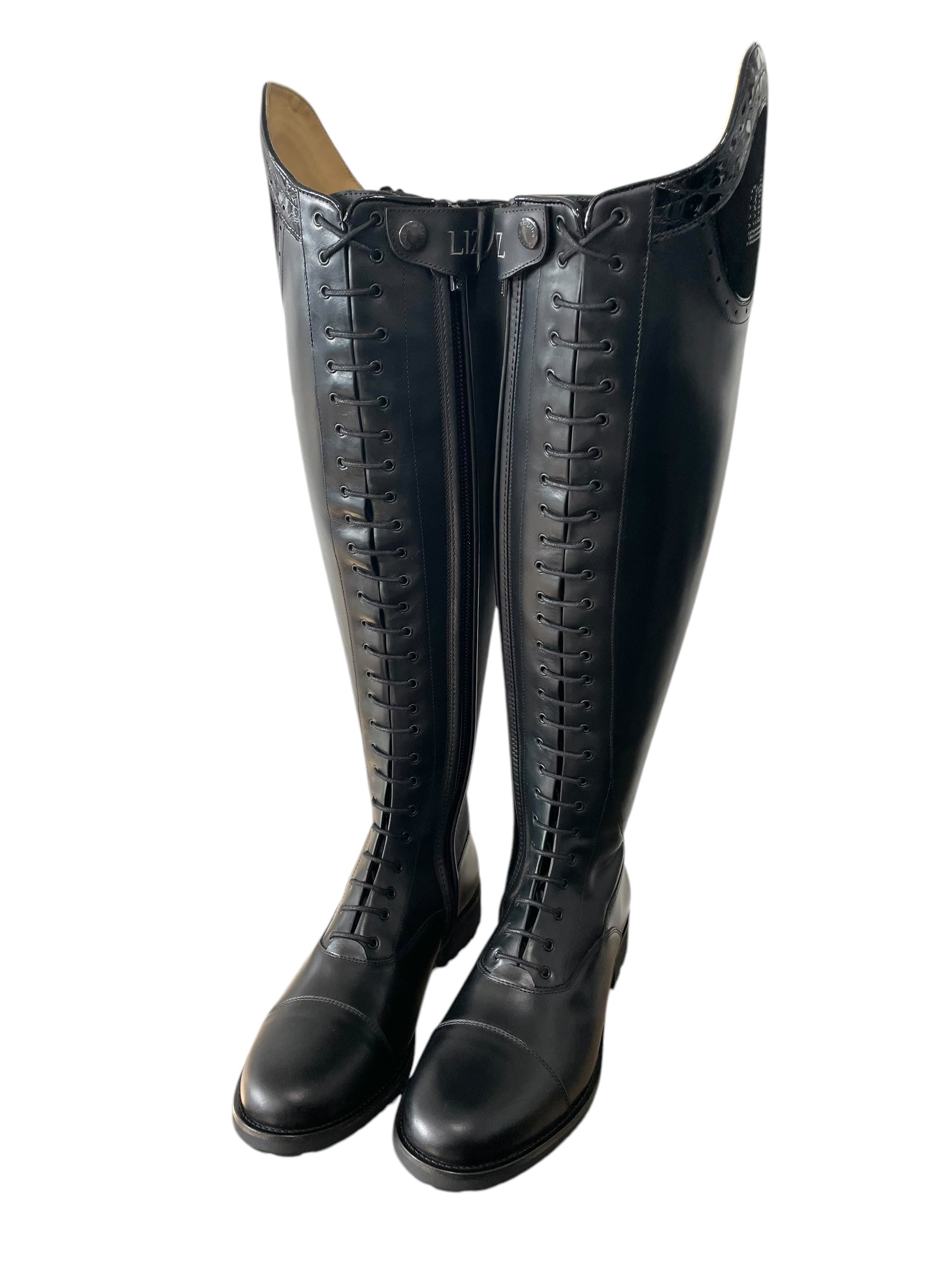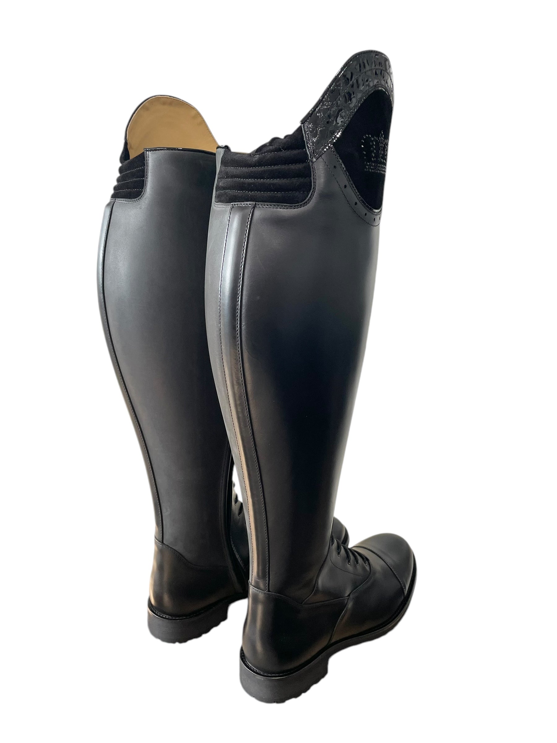 Description: Nature black base, Eve top in croco bril black with roma black piping and sensory black (suede) center with black Swarovski crystal crown, black suede soft knee back option, black laces, gaucho black inside shaft, silver laser initials on zip protector, matte black logo crown, and black Amsterdam sole.