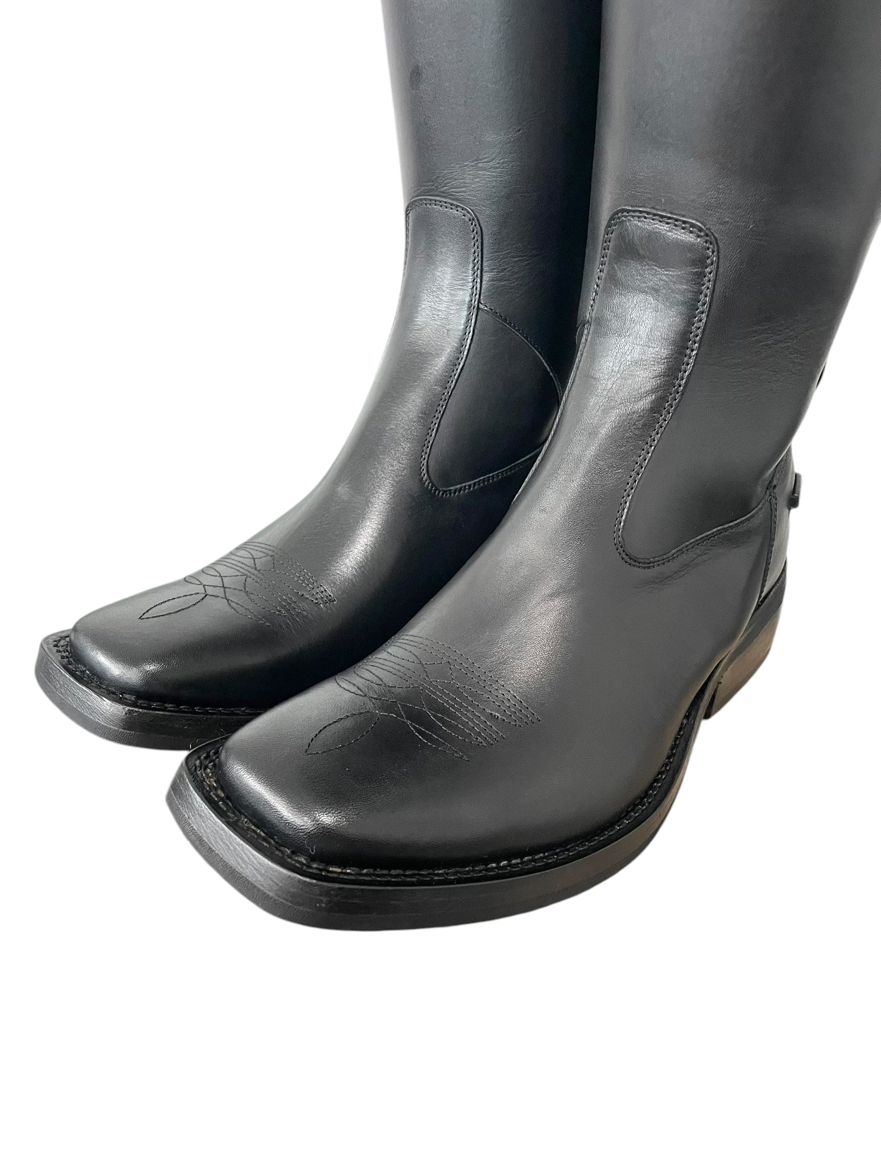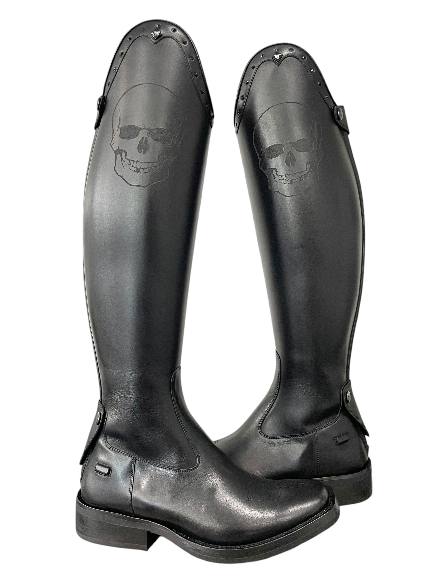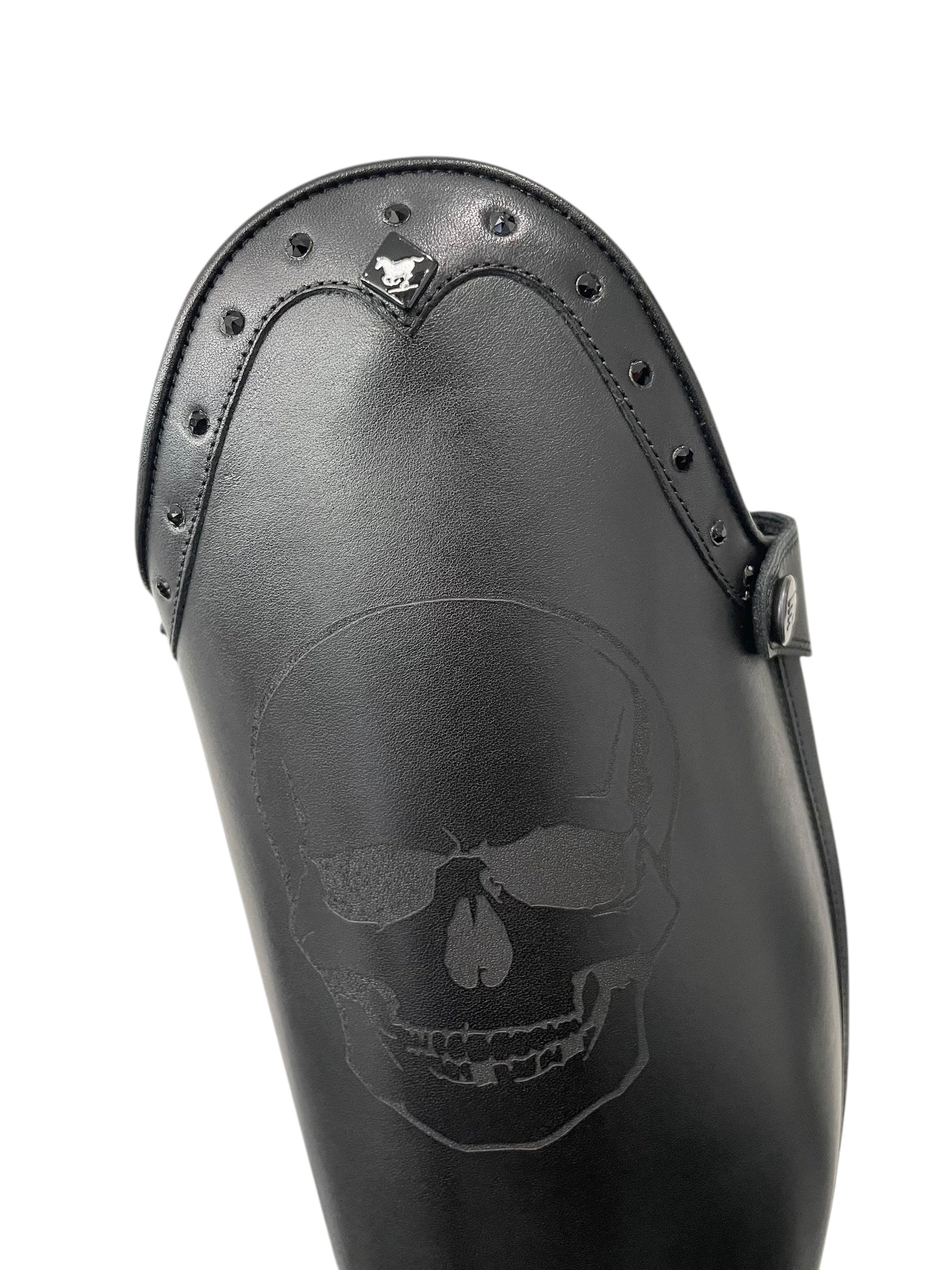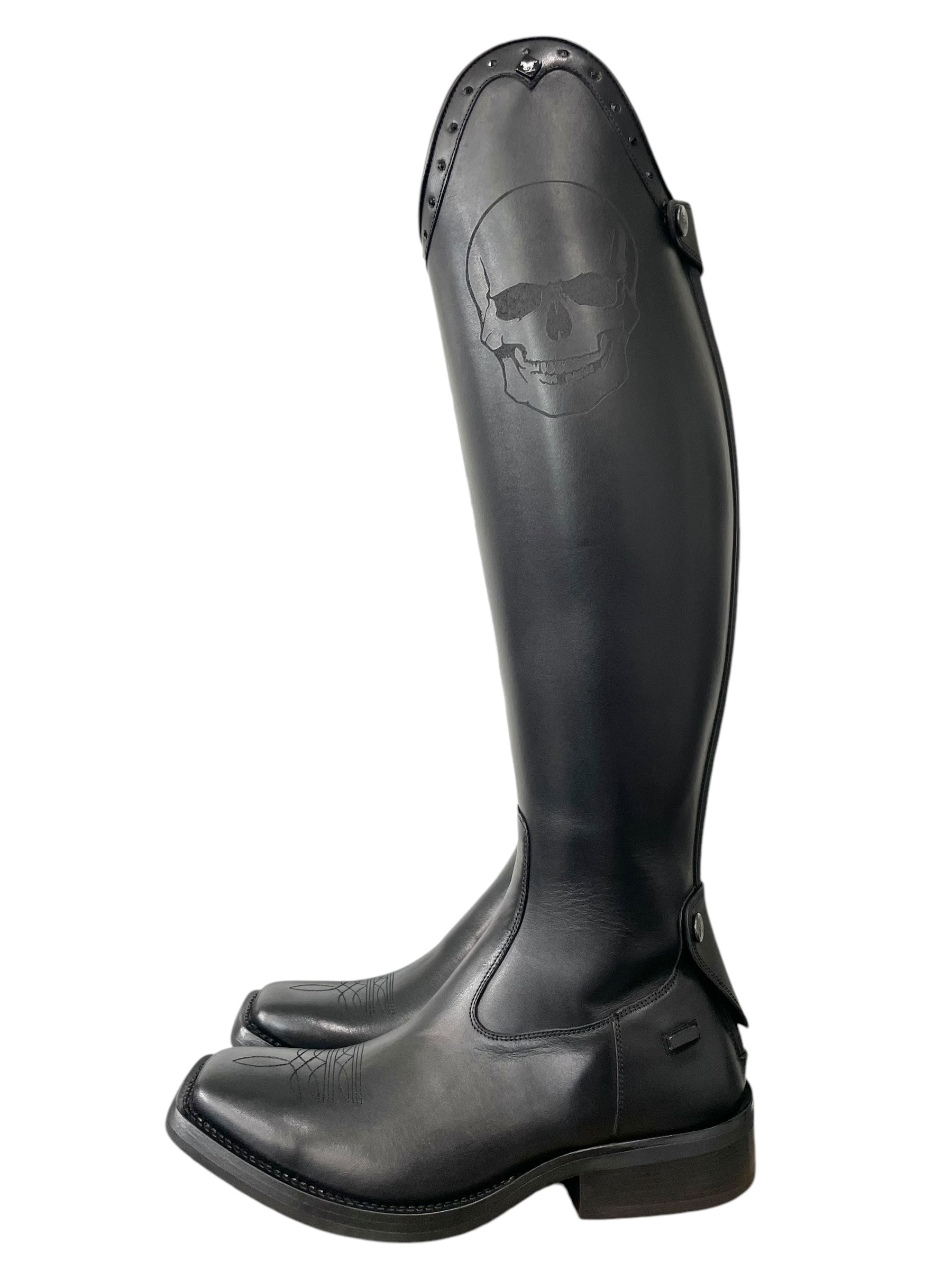 Description: WRAT black base, G9 Rondine top with GG90 SS16 black crystals, skull engraving, black logo, stitching on the toe, and black roper sole.