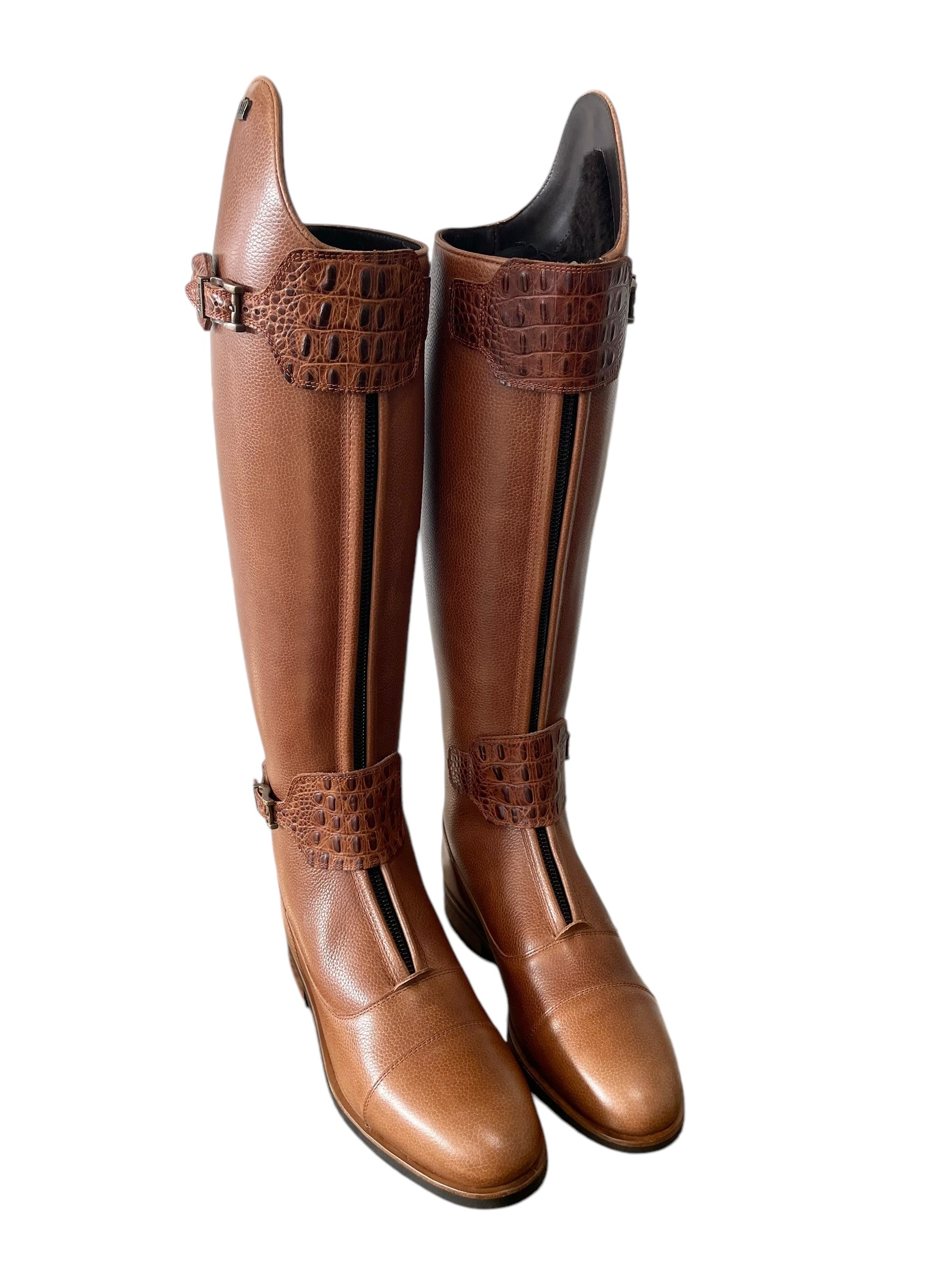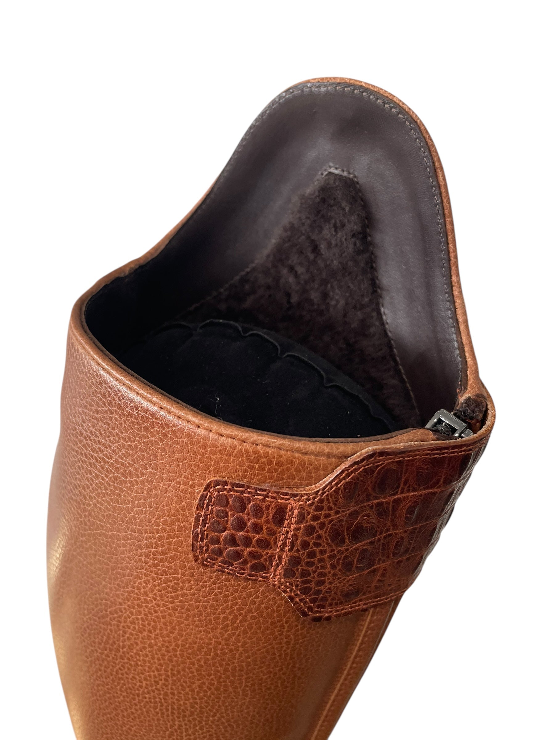 Description: Paxson camel base, chocolate brown sheepskin, alligator brown top and bottom straps, old gold logo crown and buckles, and brown outsole.