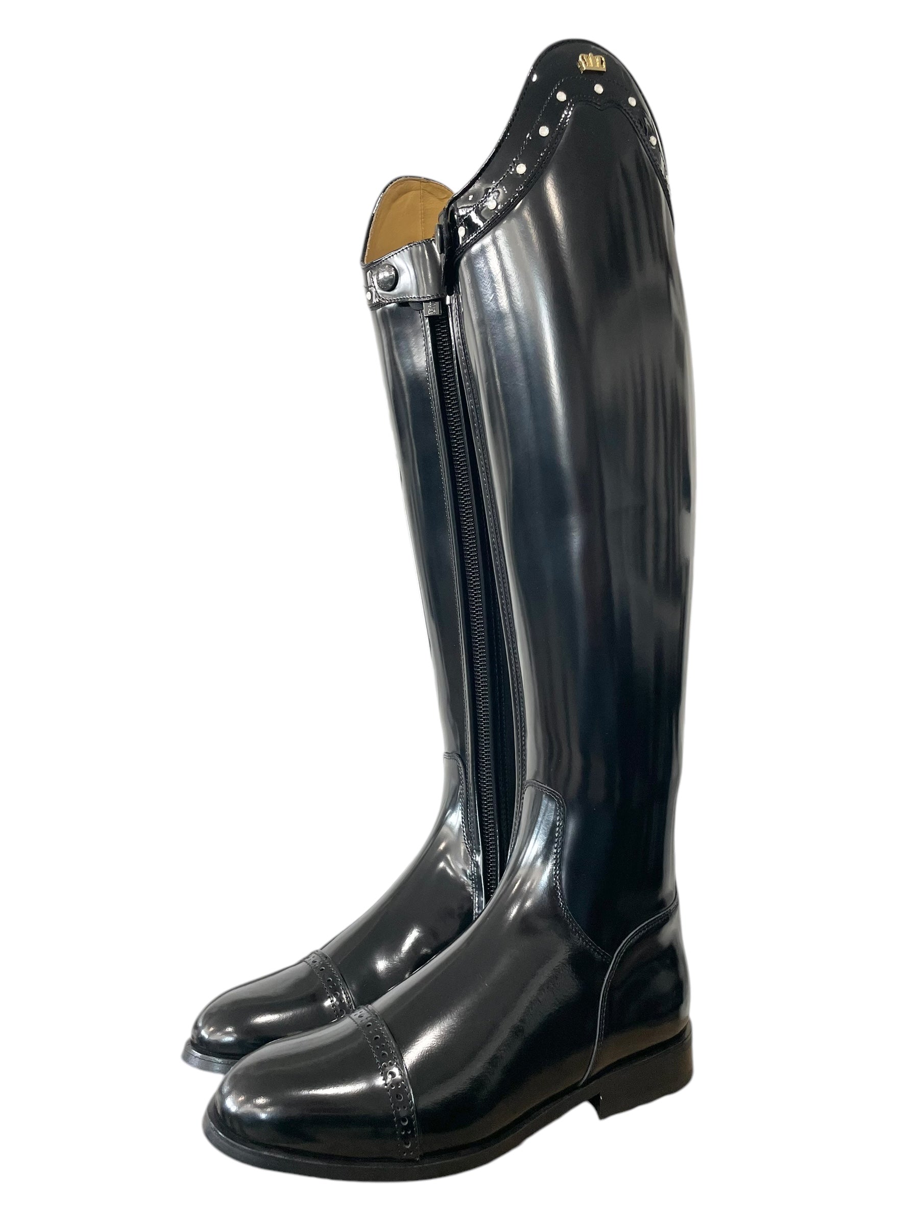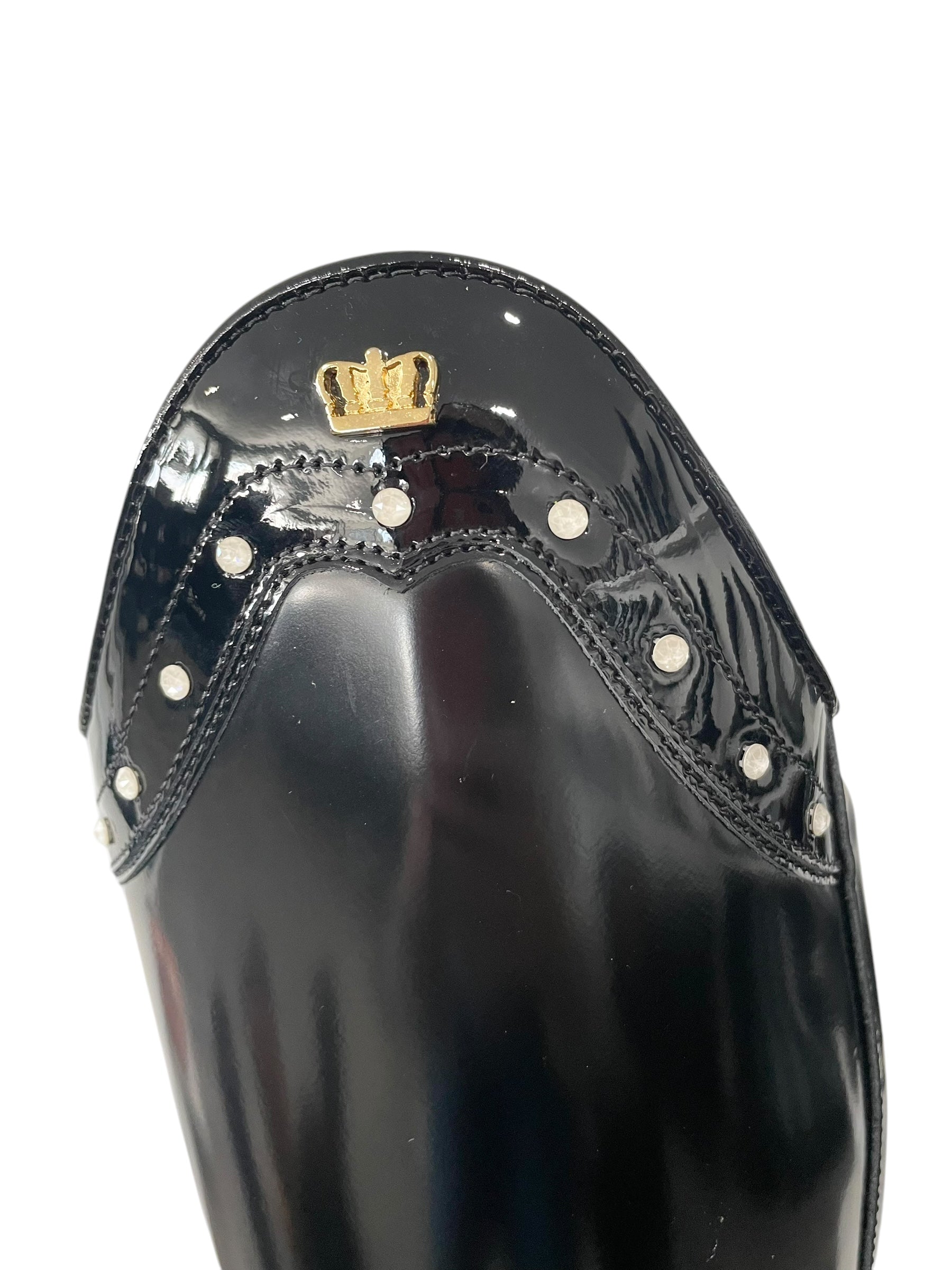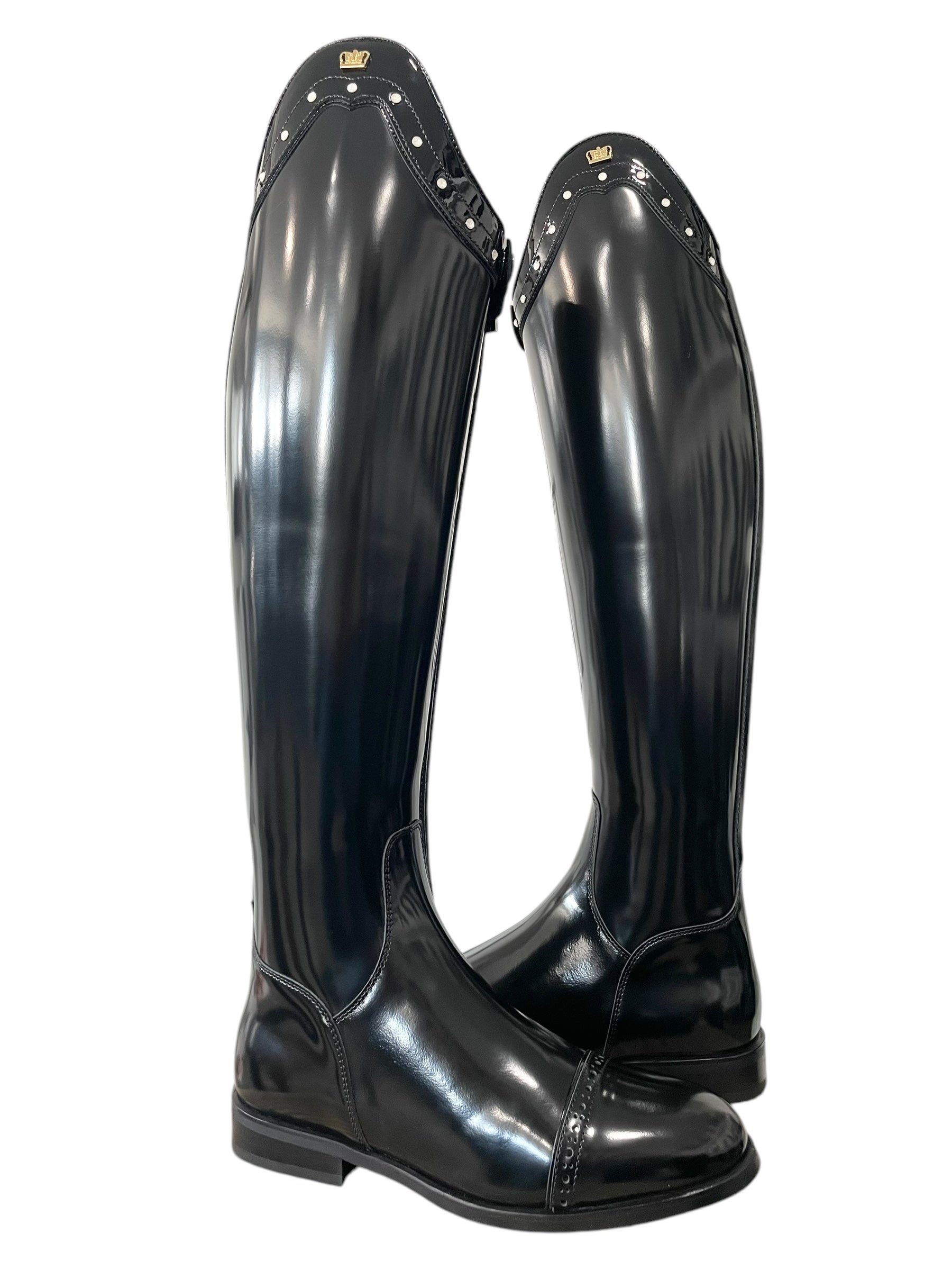 Description: Uragano black base, Ziva top in roma black with cream Swarovski stones, toecap with brogues and roma black piping, V-gusset at the knee, gold logo crown, and black outsole.