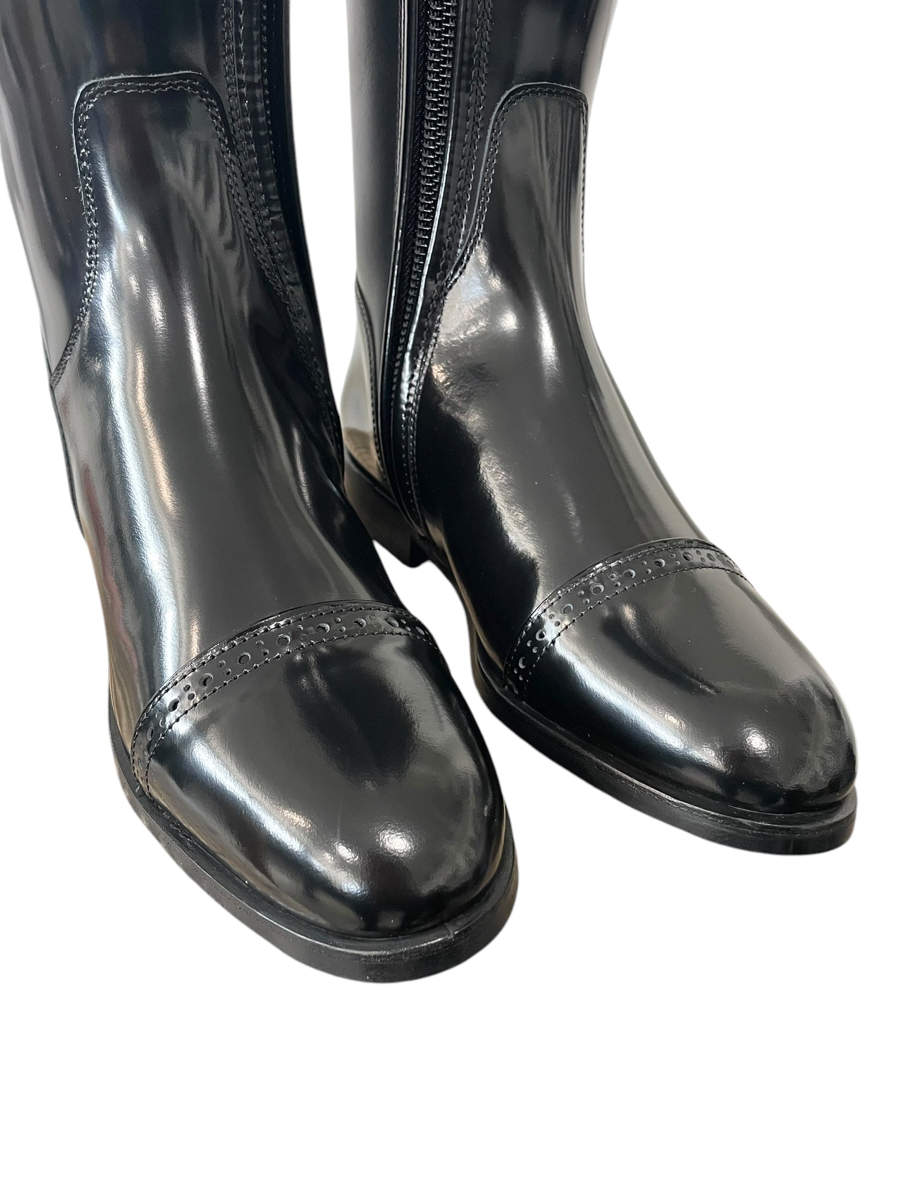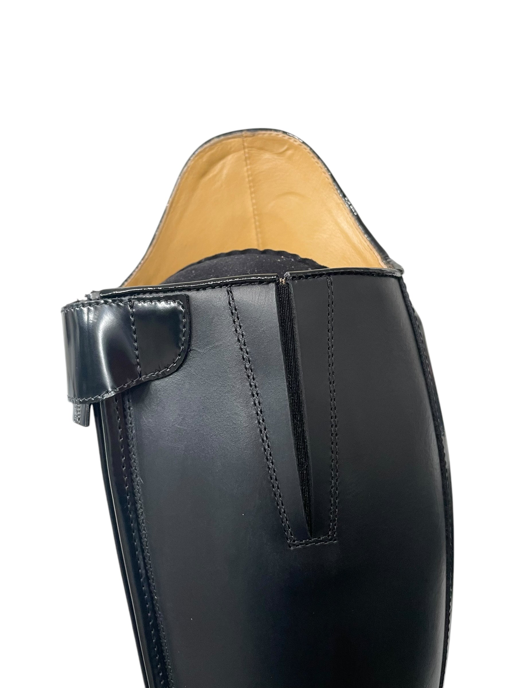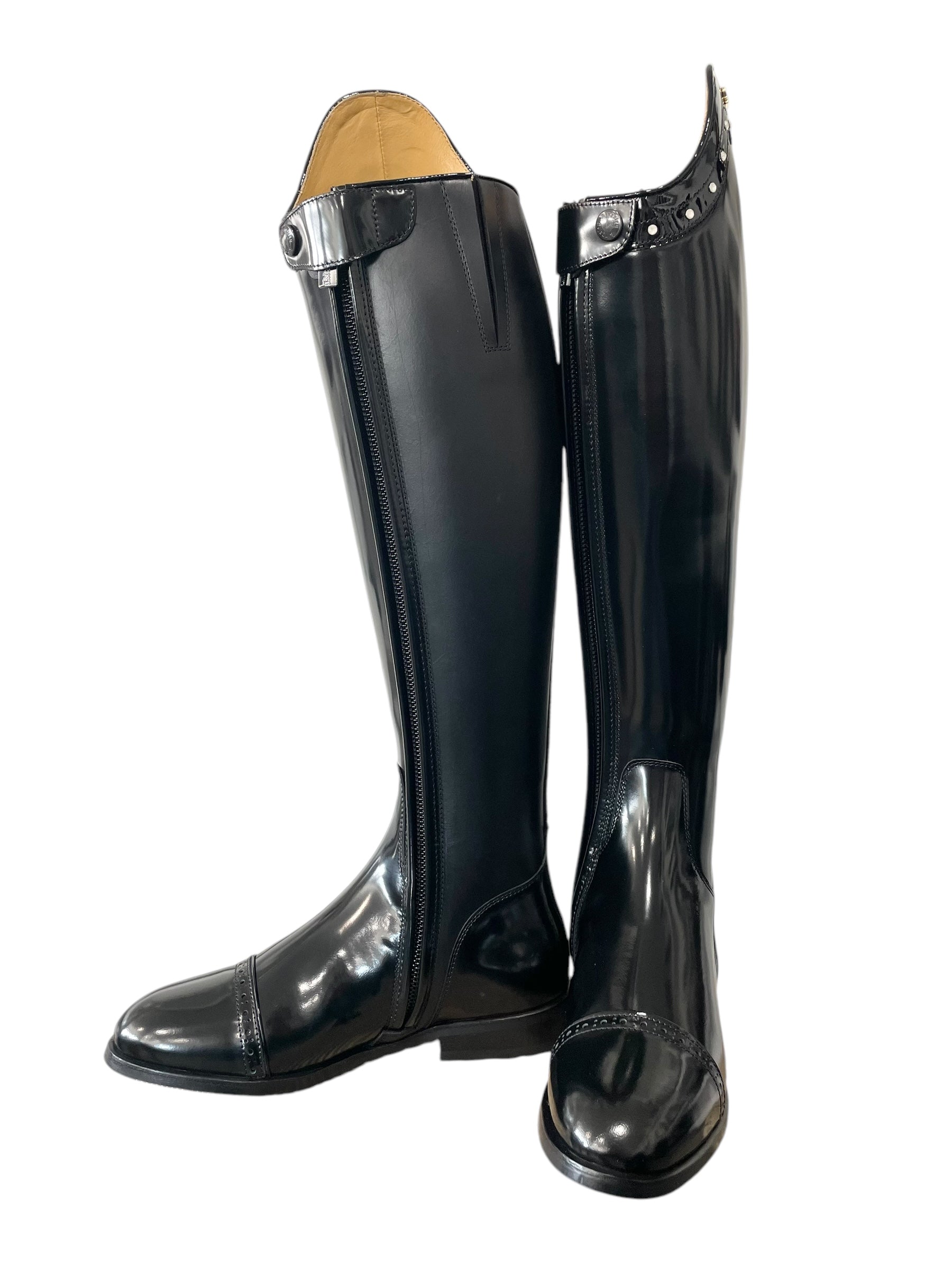 Description: Uragano black base, Ziva top in roma black with cream Swarovski stones, toecap with brogues and roma black piping, V-gusset at the knee, gold logo crown, and black outsole.